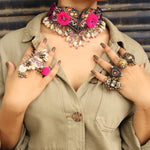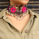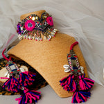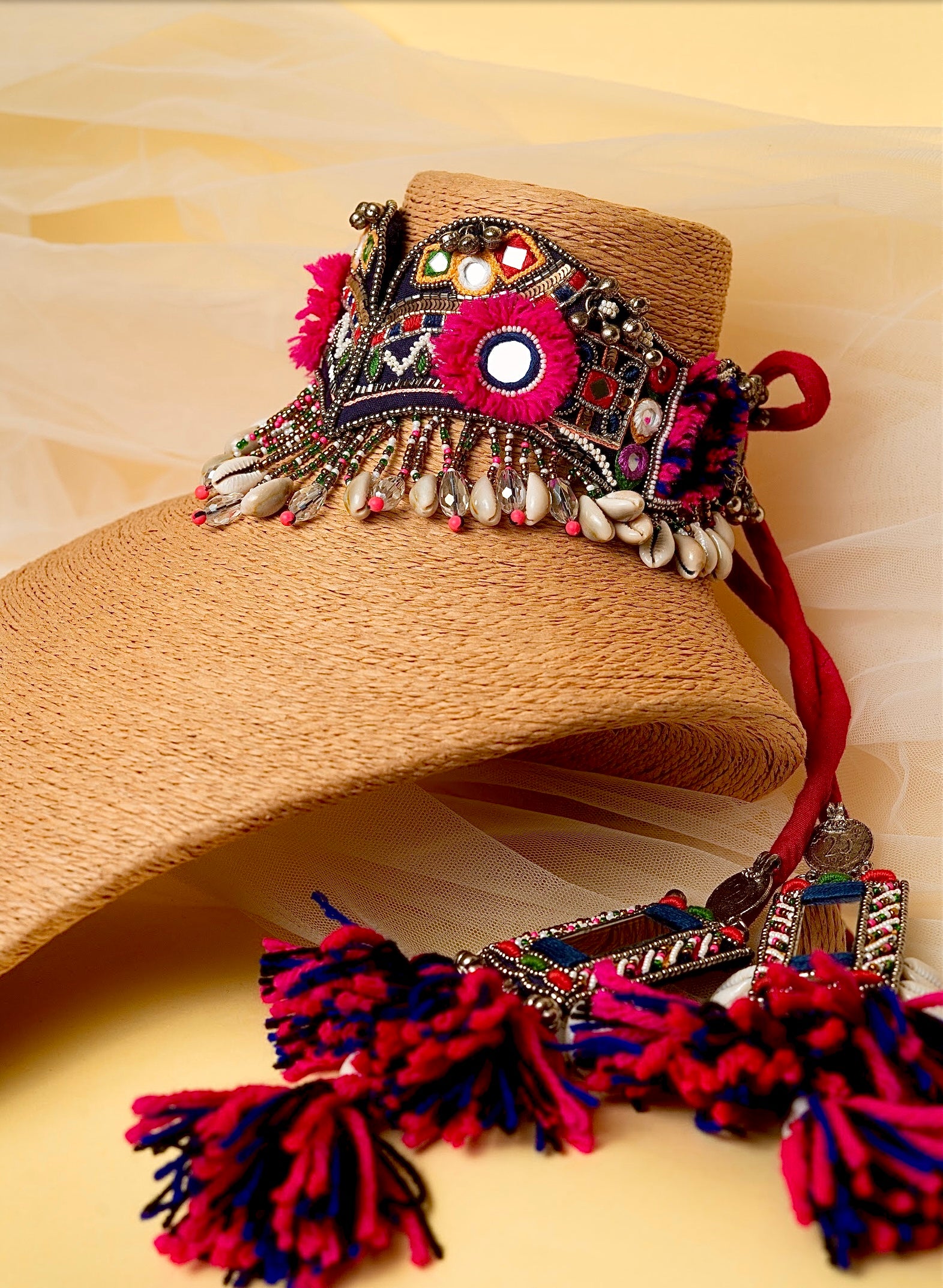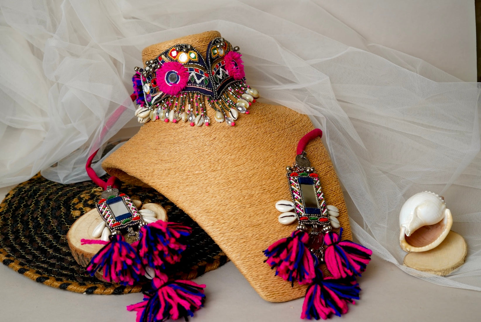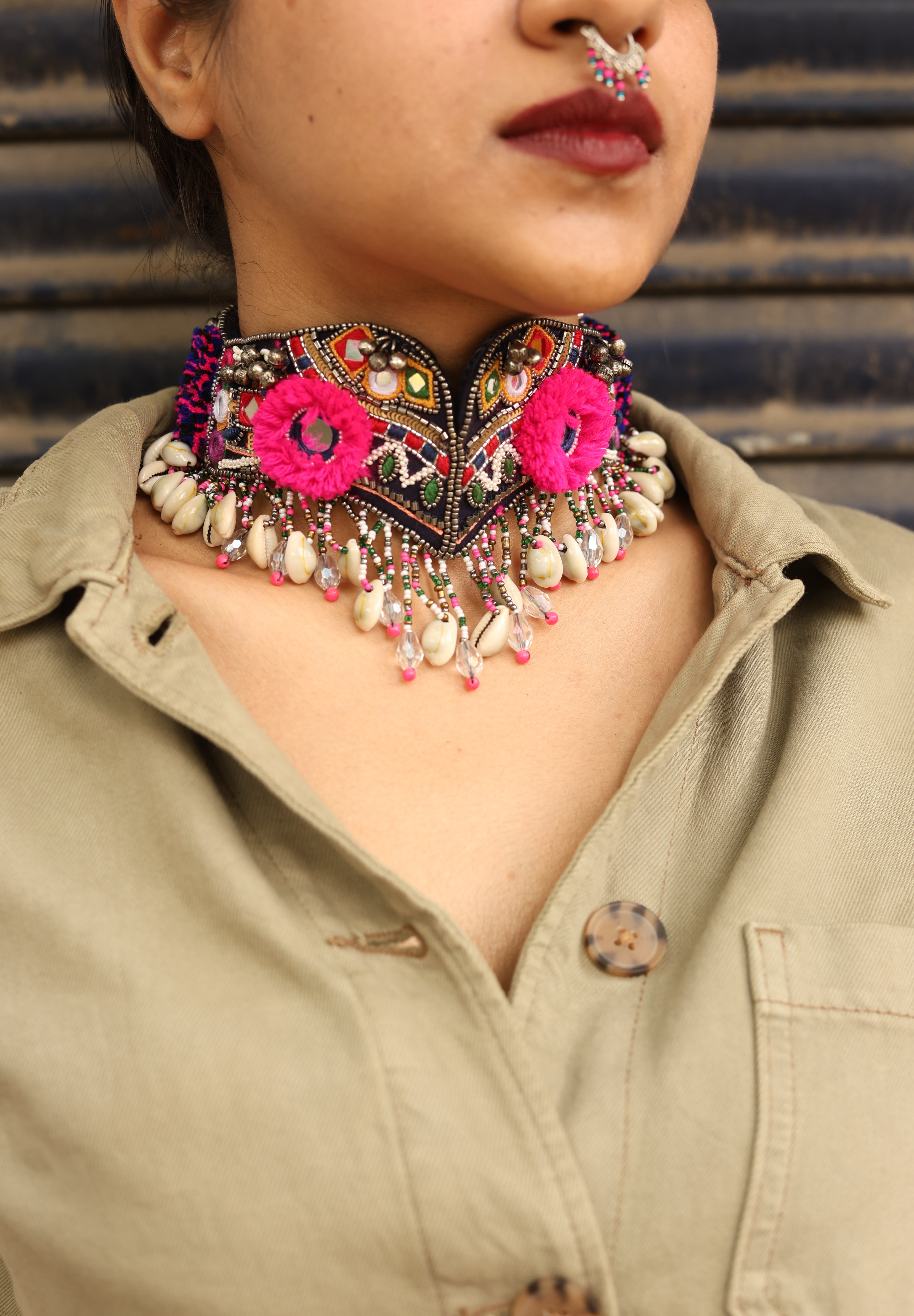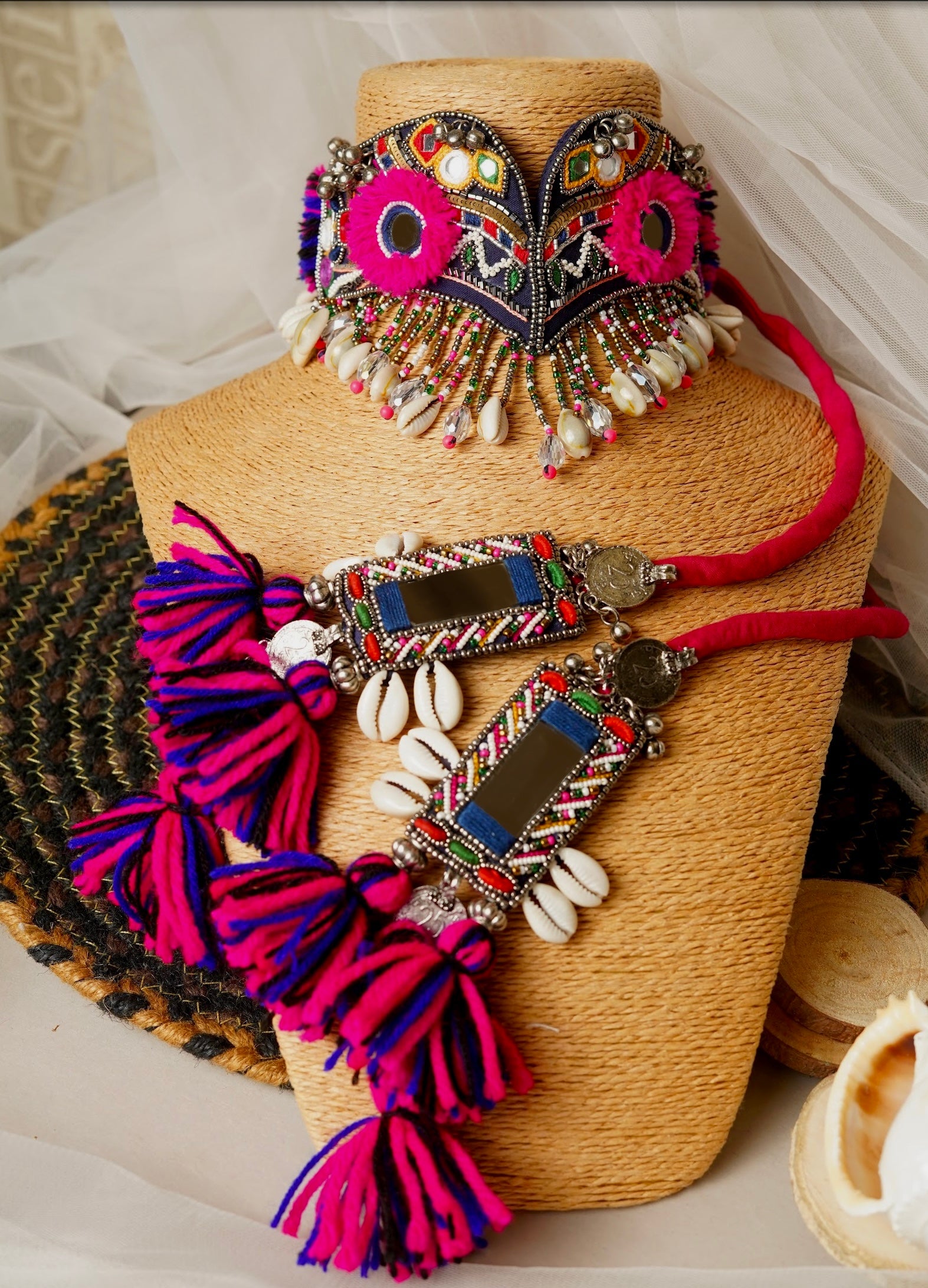 Handcrafted mirrorwork Kutch embroidery inspired from Gujarat is such a statement piece to be worn in festivities , it has the blast of colours with bohemian essence and tassel details which ads the quirk , most important part of the piece is it’s designer neckline shaped which is very unique, with shell and pearl details .