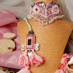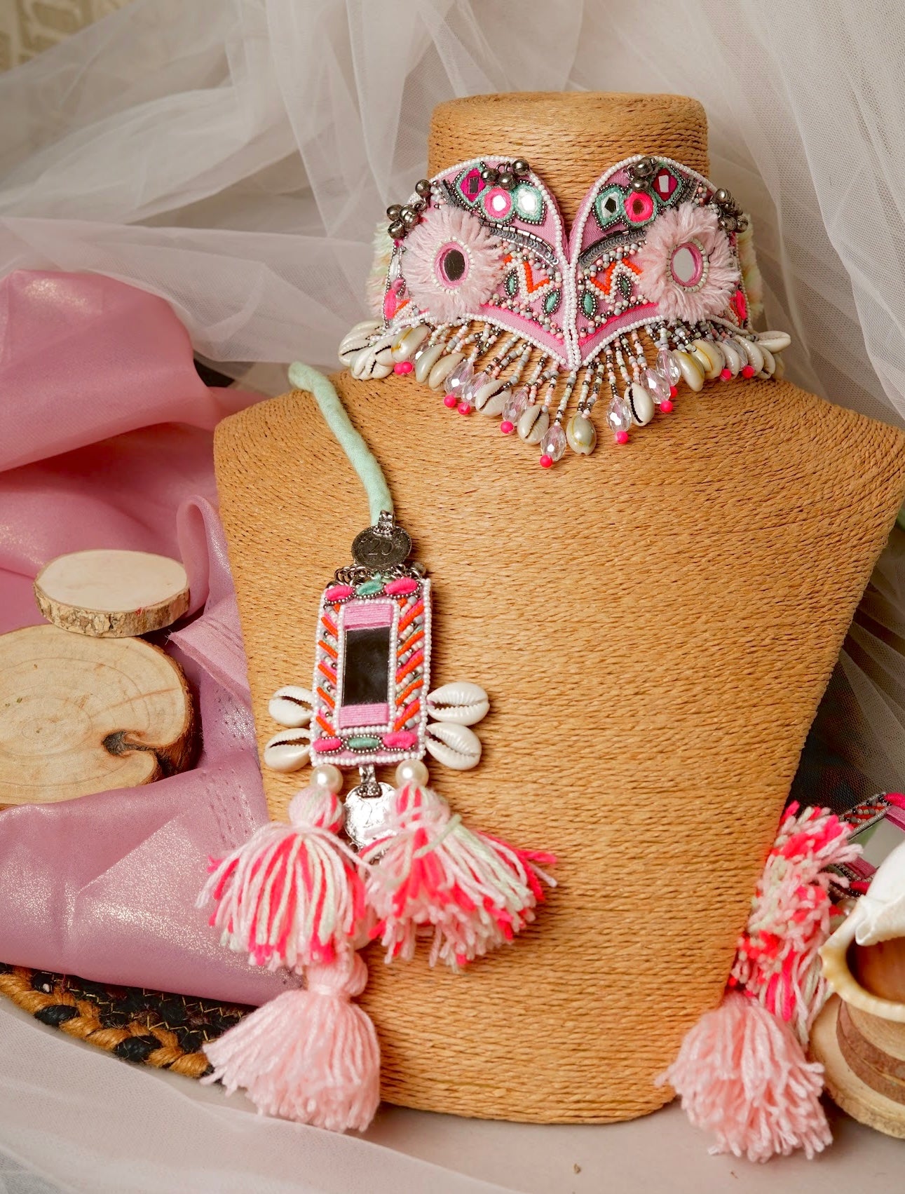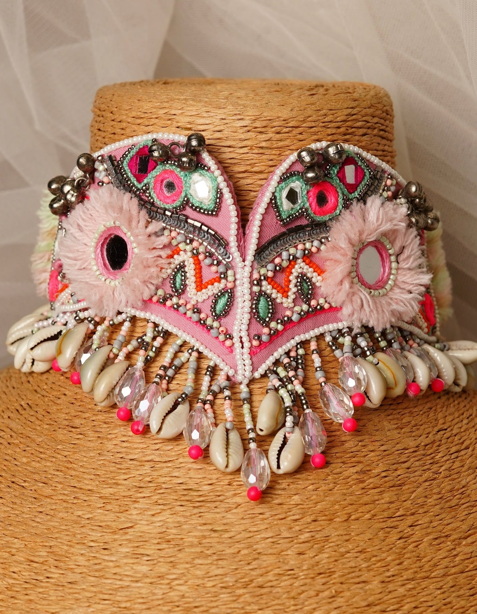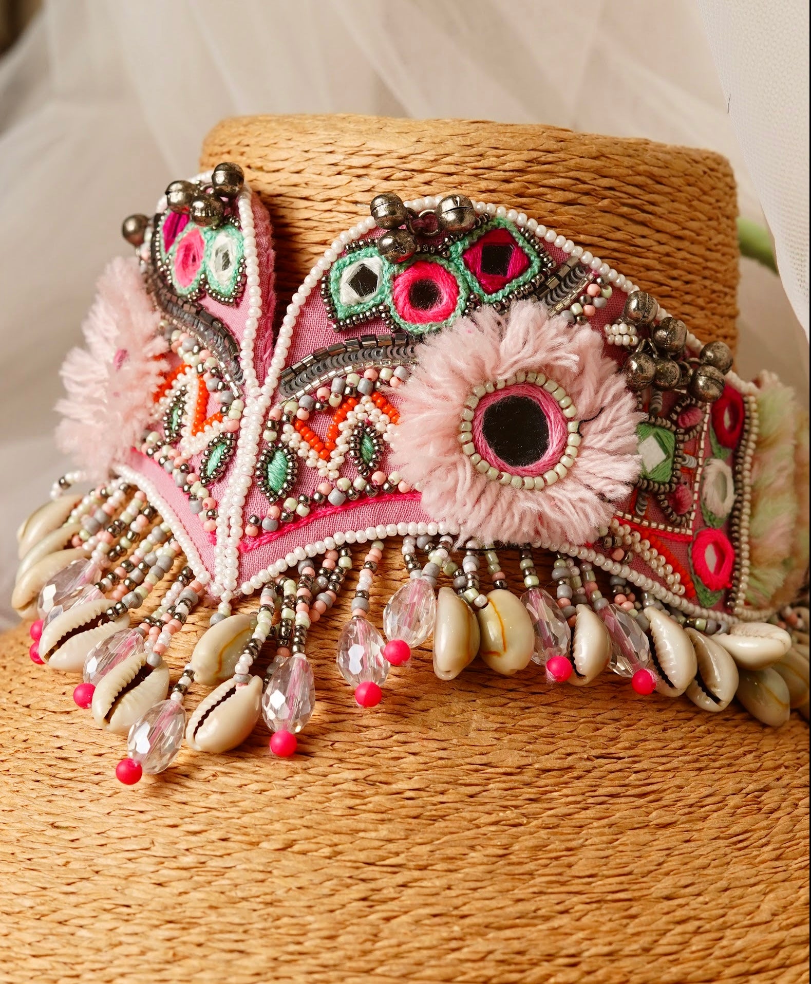 Handcrafted mirrorwork Kutch embroidery inspired from Gujarat is such a statement piece to be worn in festivities , it has the pastel pop of colours with bohemian essence and tassel details which ads the quirk , most important part of the piece is it’s designer neckline shaped which is very unique, with shell and pearl details .