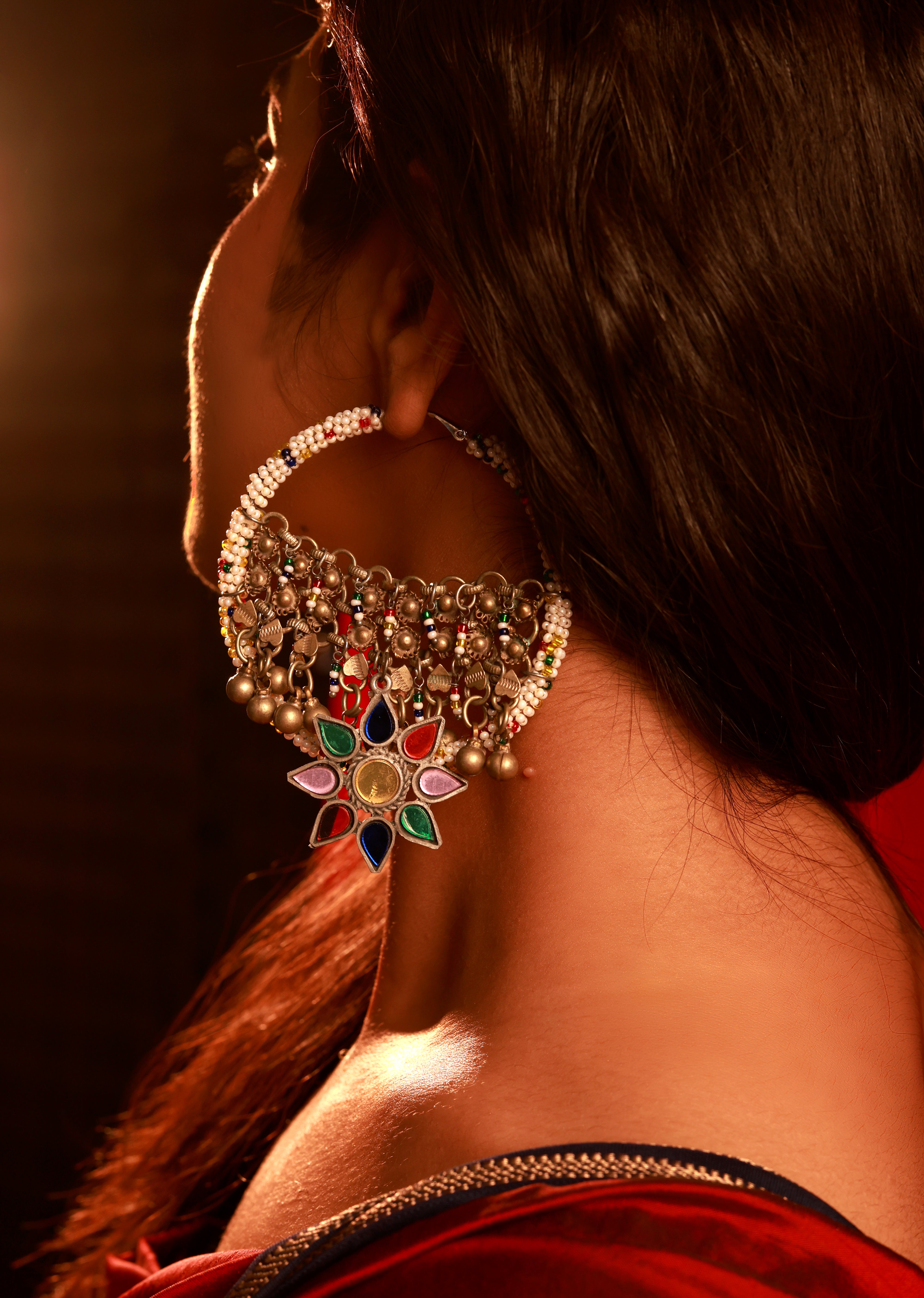 The Adya Hoop is an oversized, multicoloured statement earring featuring Afghani-inspired embellishments at the centre and a mirror charm that adds a unique touch of sparkle. Perfect to pair with vibrant outfits, it’s designed for moments when silver alone isn’t enough — choose something unusual, choose the Adya Hoop.