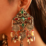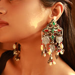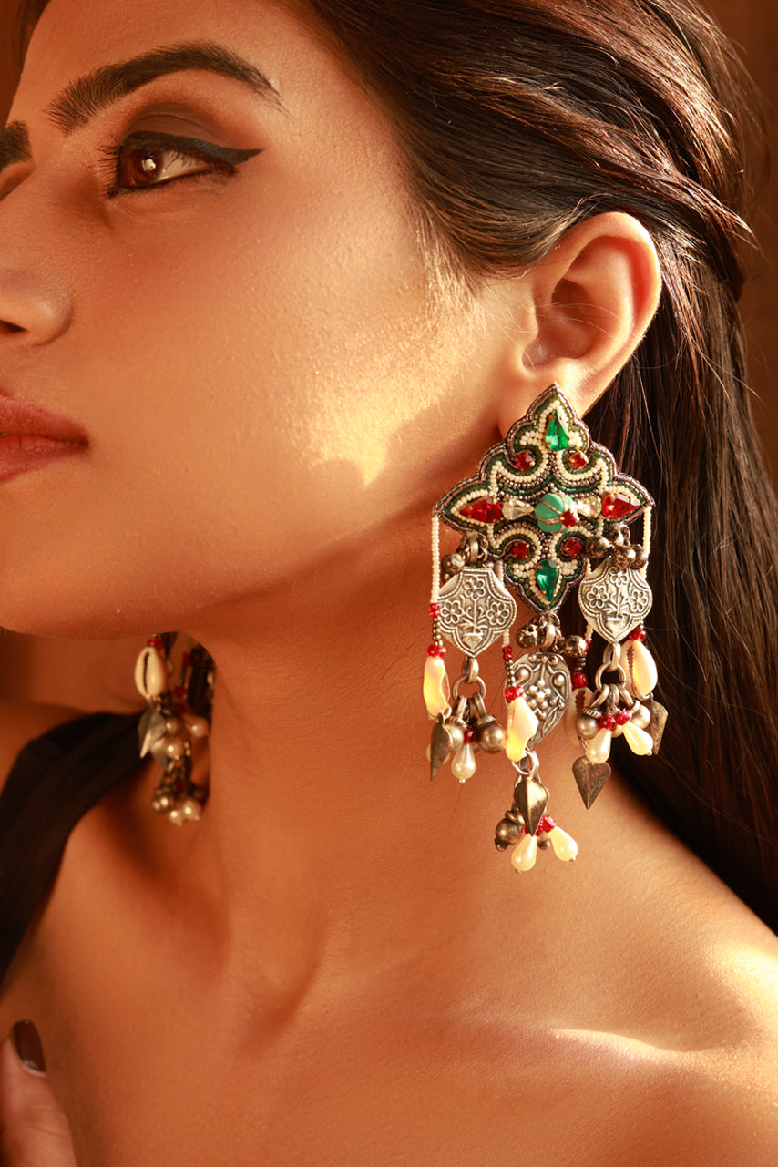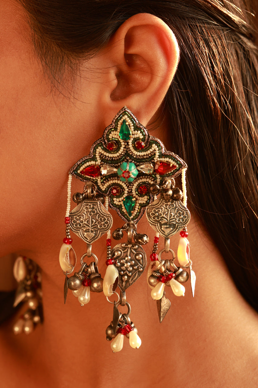 Affrang stud danglers are handcrafted danglers with multicolour glass stones along with pearls embellishments of brass metal charms complimented with intricate bead details of handwork and a centre stone to grab all your attention.
