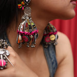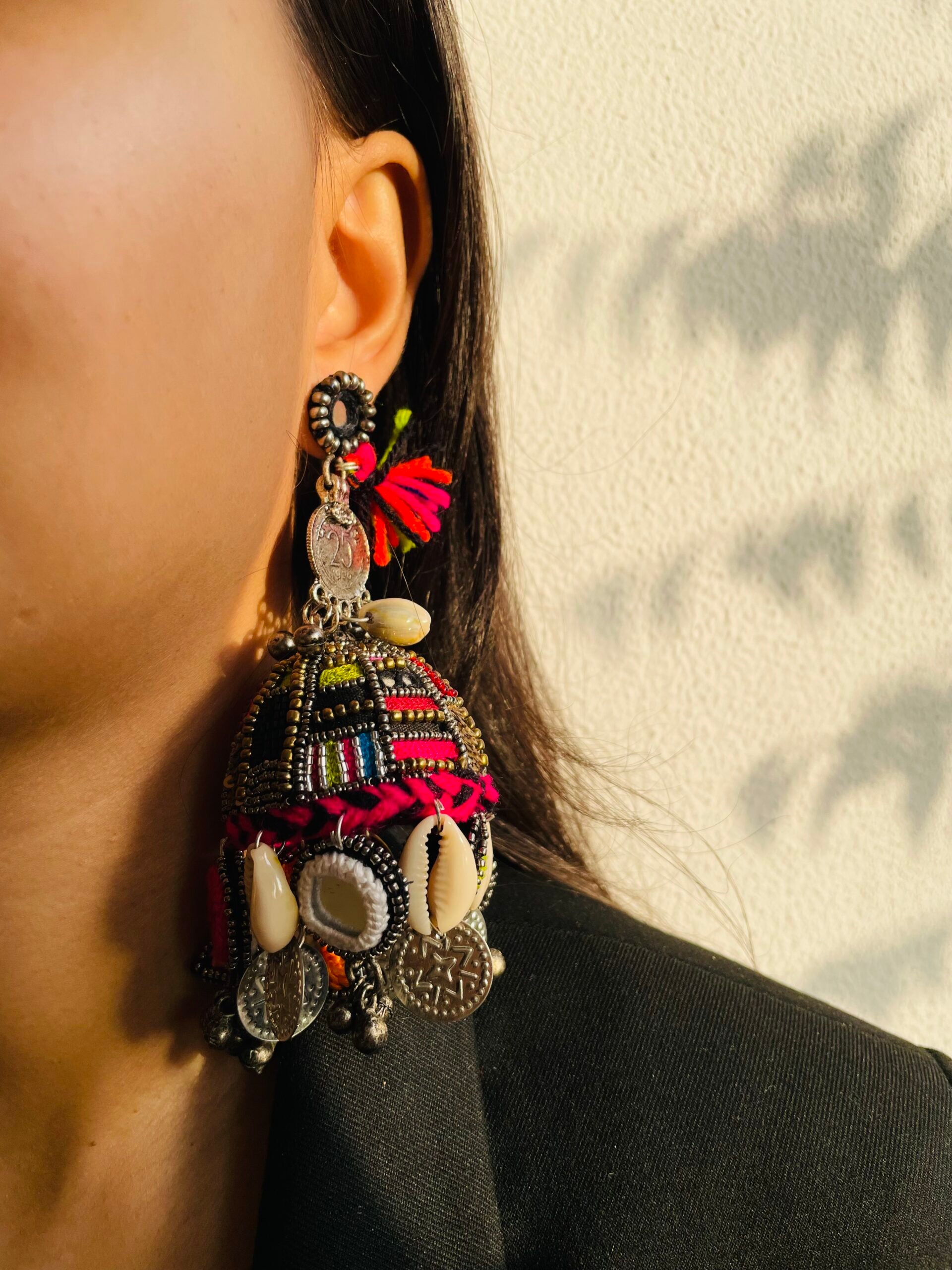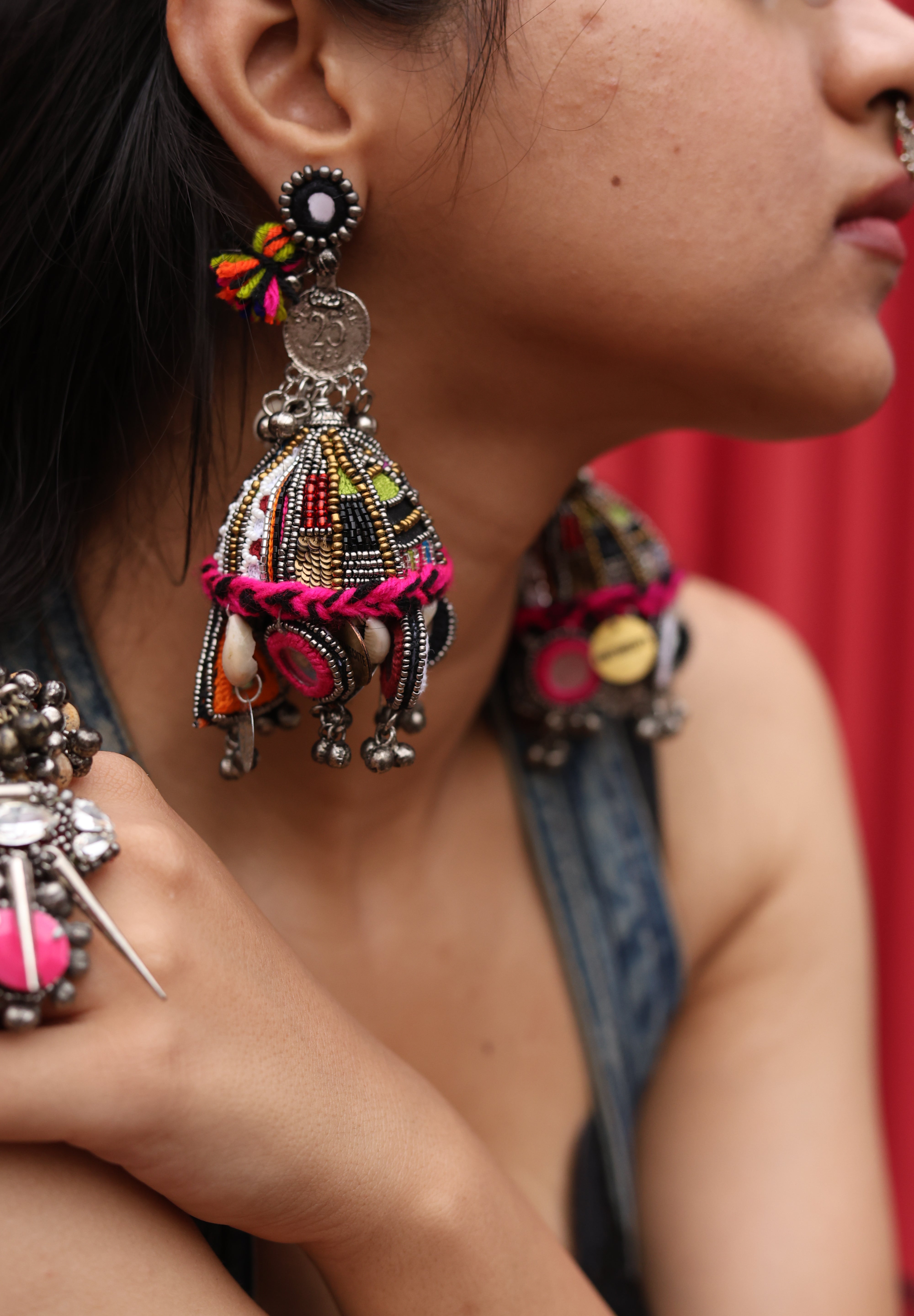 Handcrafted Banjara jhumki which is inspired by bohemian elements , this range of jewellery is an amalgamation of colours and tribal essence. This piece is hand embroidered using all mirrors , metal embellishments to complete the look.