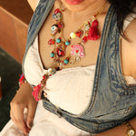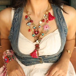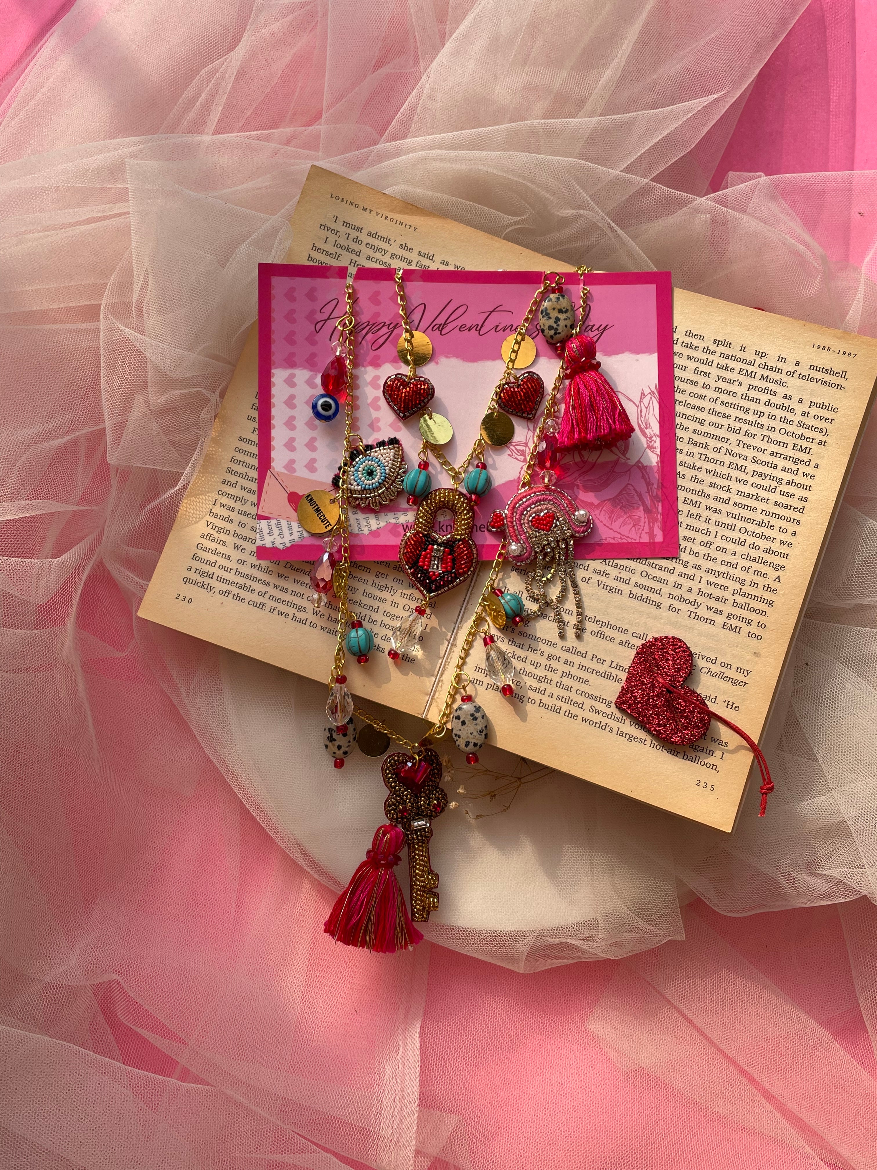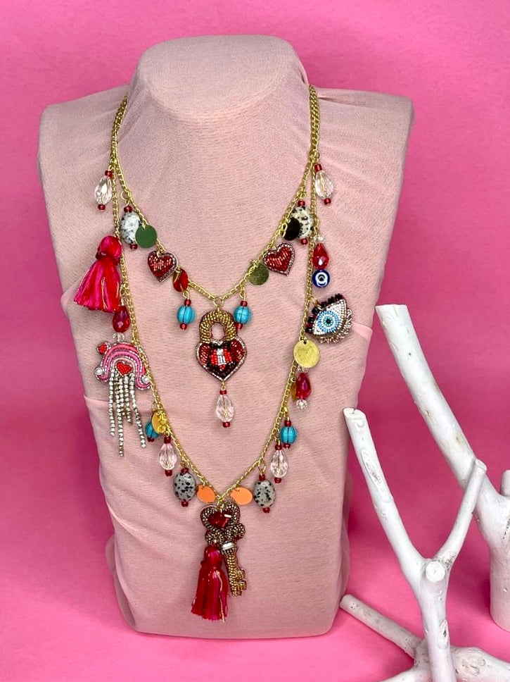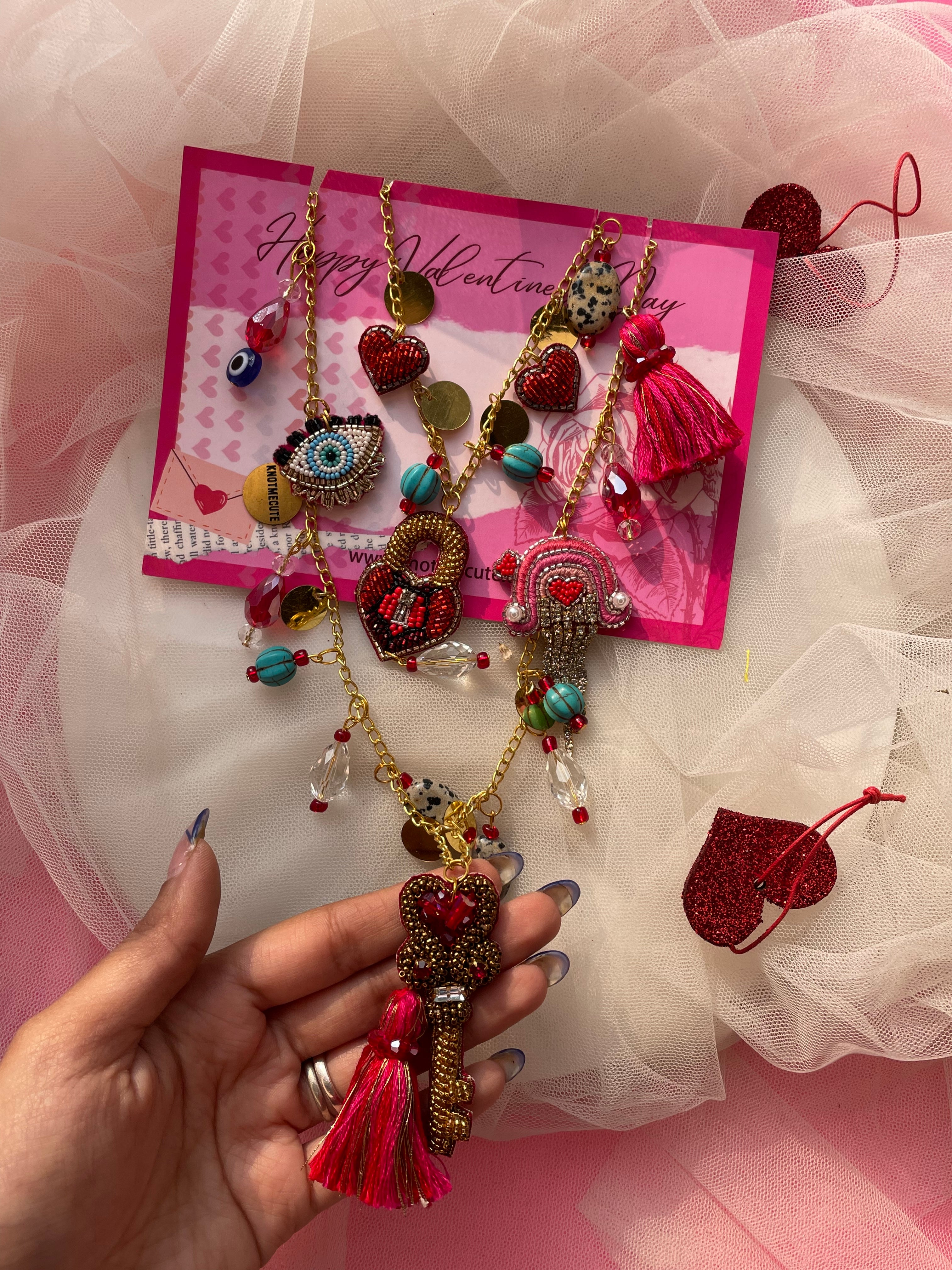 Amour necklace Is twin metallic chain necklace with high luxurious handcrafted jewelled charms , evil eye , love heart , lock and key charm embellished with high glossy lustrous crystals with combination of mixed beads and tassels . Perfect to gift her this Valentine’s Day