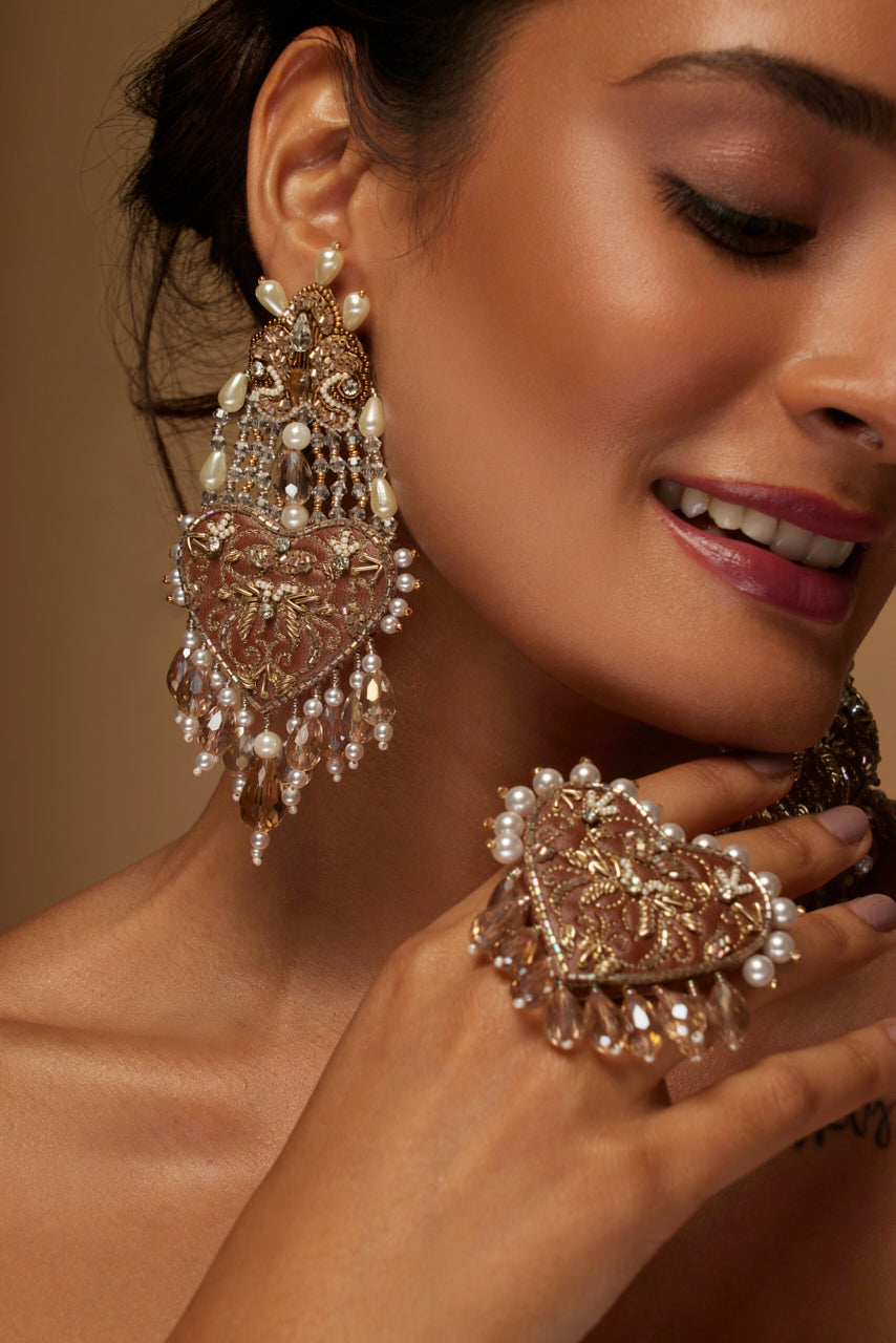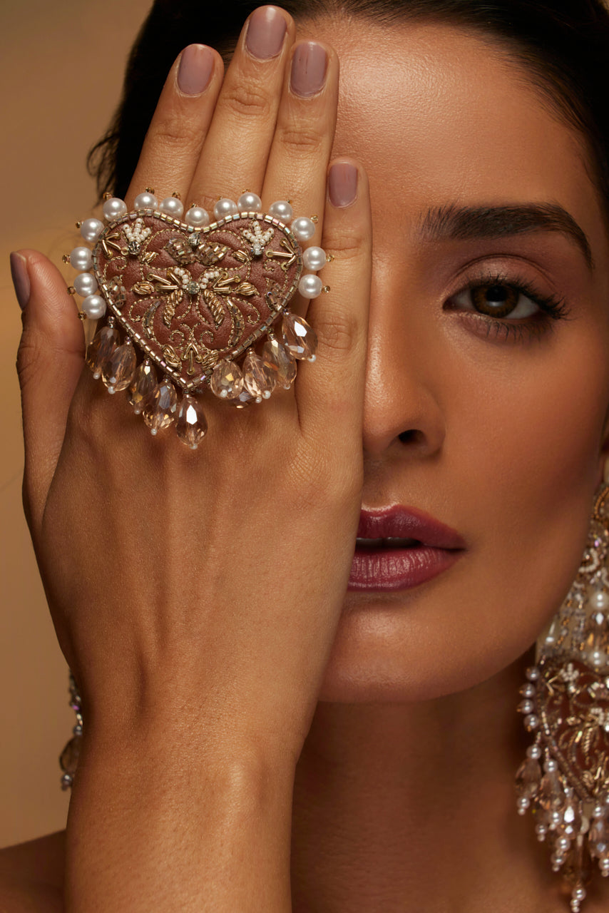 Anne Heart tan leather Ring is handcrafted balanced between Mughal Era Designs and modern textures to work on. The idea is to break the stereotypes that Indian jewellery be worked on fabrics or metals. In leather also we many fine detail work can be embroidered as seen in Anne Heart tan leather Ring.