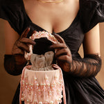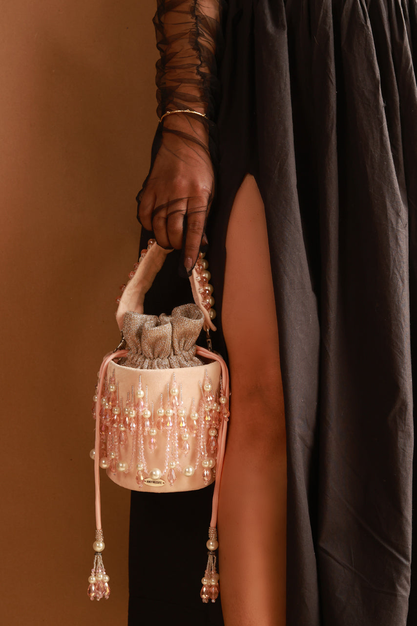 The Apricot Blush Bucket Bag is a luxurious accessory that blends elegance with functionality, crafted in a soft light peach shade and adorned with high-gloss crystals meticulously arranged around its round shape. The velvet base adds a plush, refined touch, while the shimmering crystals catch the light with every movement, making it the perfect statement piece for the wedding season. Designed to hold your essentials, whether it's accessories or makeup, this bag effortlessly complements pastel-toned outfits, adding a touch of glamour to any ensemble. With its high-quality craftsmanship and timeless beauty, the Apricot Blush Bucket Bag is the ultimate accessory to elevate your wedding season look and an ideal addition to a bride to be’s trousseau, ensuring a touch of sparkle on her special day