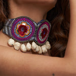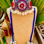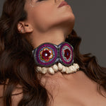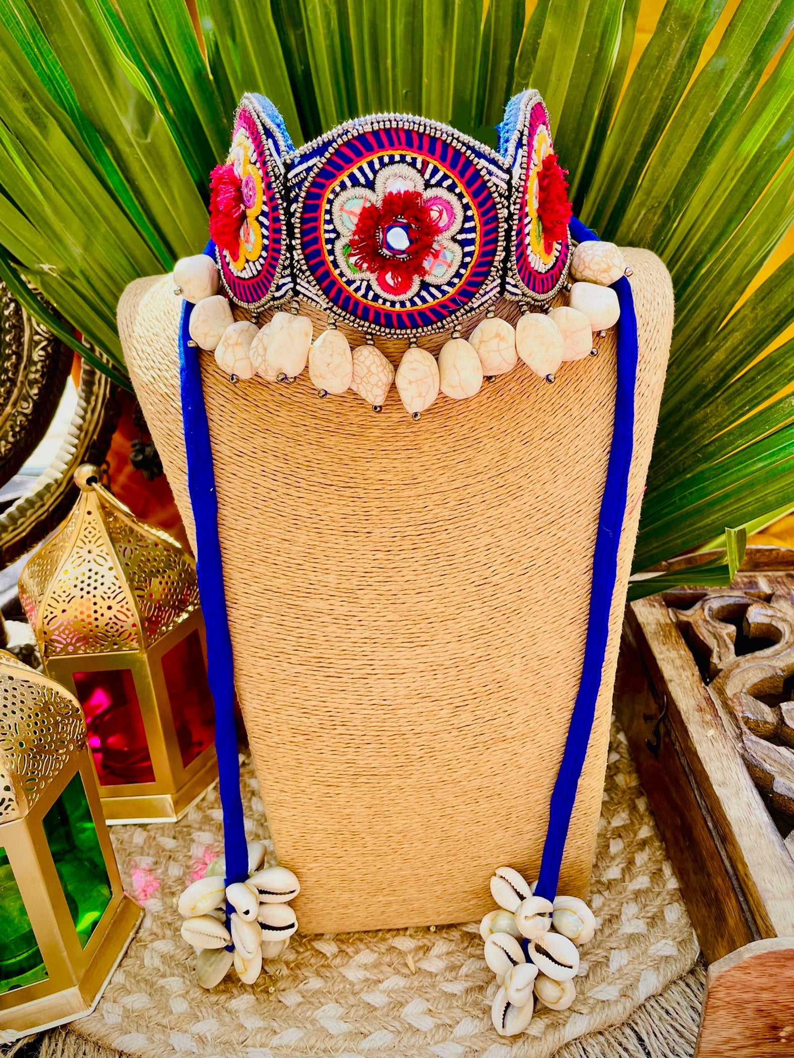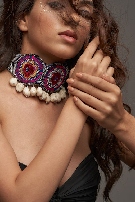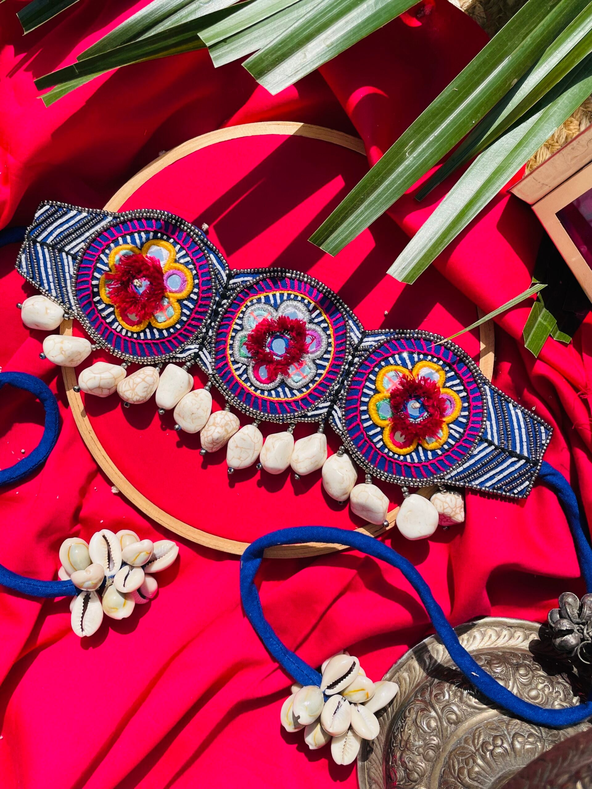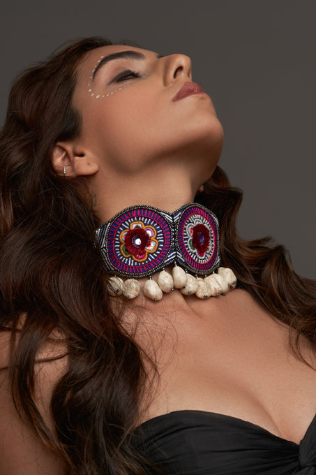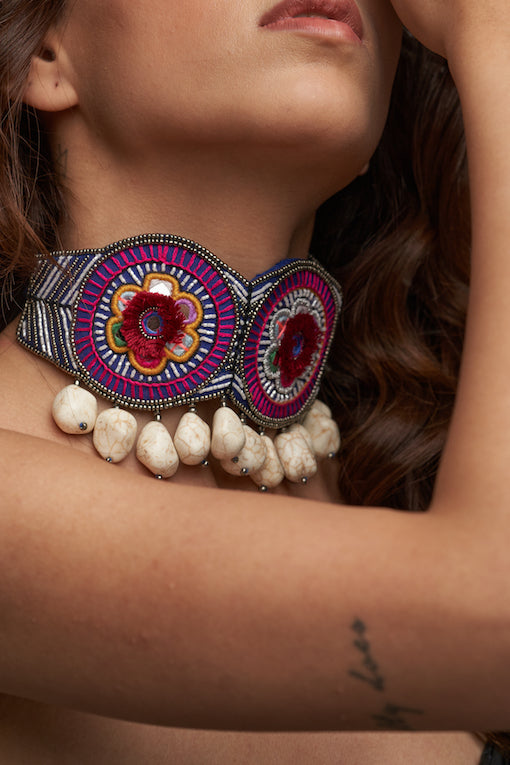 Araish choker is beautifully designed and handcrafted inspired from Indian gujrati kutch embroidery how it is used in mirror work to seal the corners of the mirrors , with thread detailing in centre and its little broad shape will be perfect to add statement to your everyday look and bring that missing colour to the look !