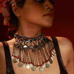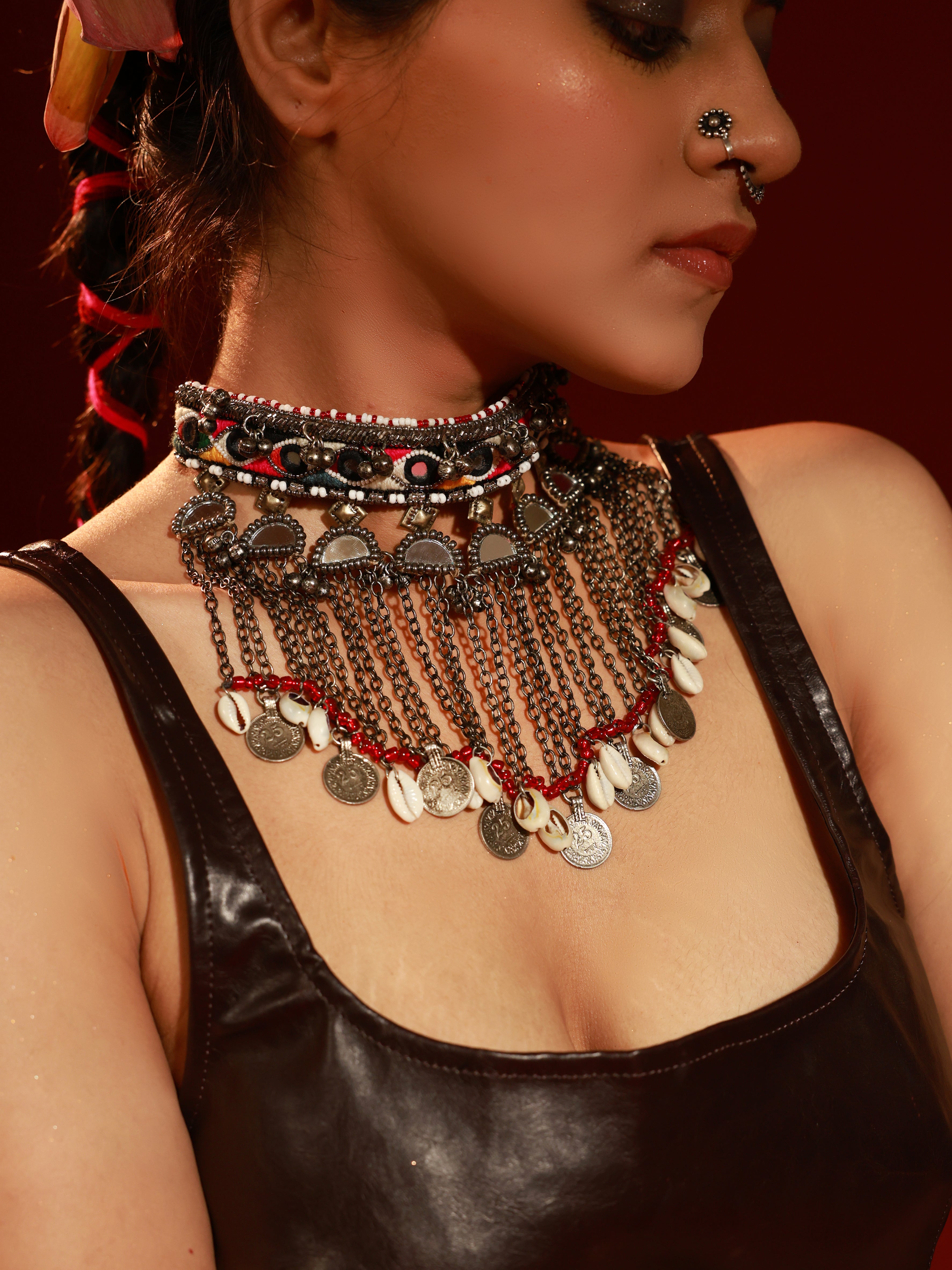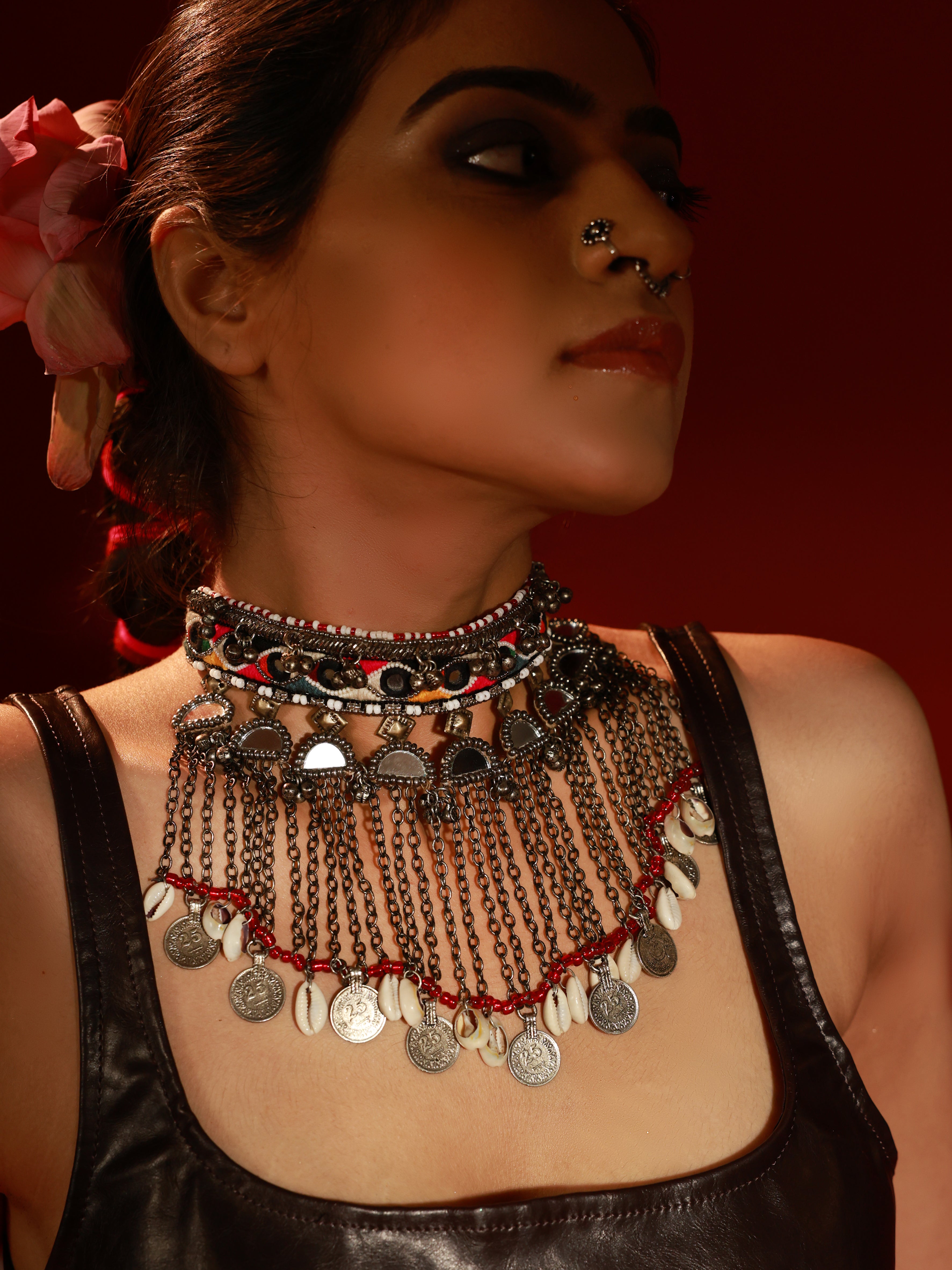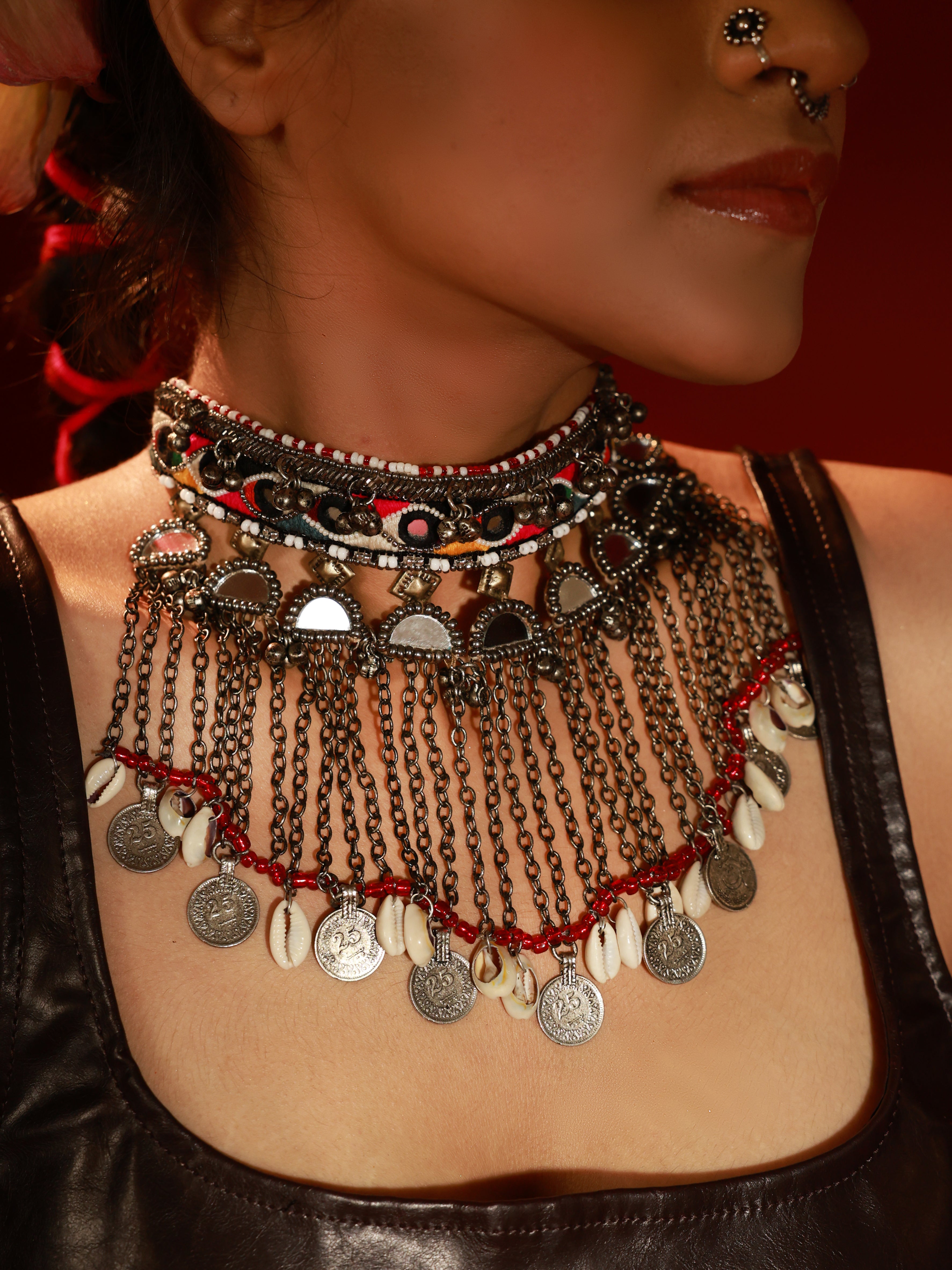 Azaan multicoloured choker is handcrafted with perfection to detail , embellished with mirrurs in semi cut along with metallic chains , shells and metalic coins complemented the complete choker so well , which can be styled for Navratri , festive season .