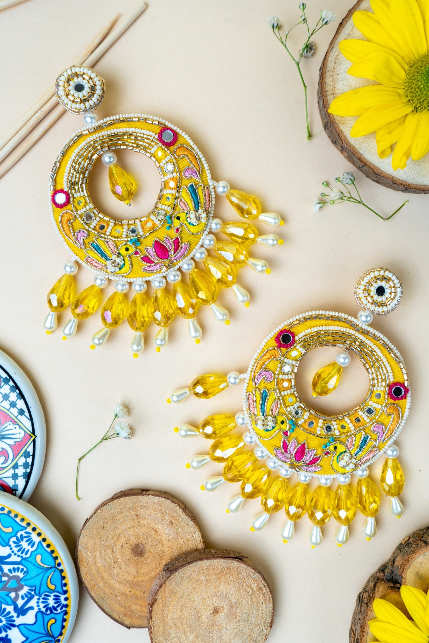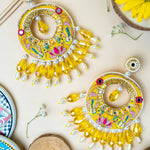 Handcrafted chandballis with intricate details ,inspired from nature embroidered motifs in yellow sunshine colour is what all is required this wedding season , symmetrical shape with pearls attached and to finish the look with some high grade crystals giving out most lustrous shine , dangler drop earrings in yellow colour which is a perfect match for haldi or mehndi jewellery for an indian wedding this summer .