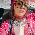 Azaira is a handcrafted choker amalgamation of contemporary and modern motifs, different type of embroidery detailing is done over with beads and mirror work which enhance the beauty of this piece is the contrasting colours with the base adding an instant pop of colour to any look. metal charm embellishments are added with cowrie shells and a top tassel detailing a perfect blend of bohemian charm with modern look jewels.