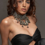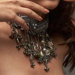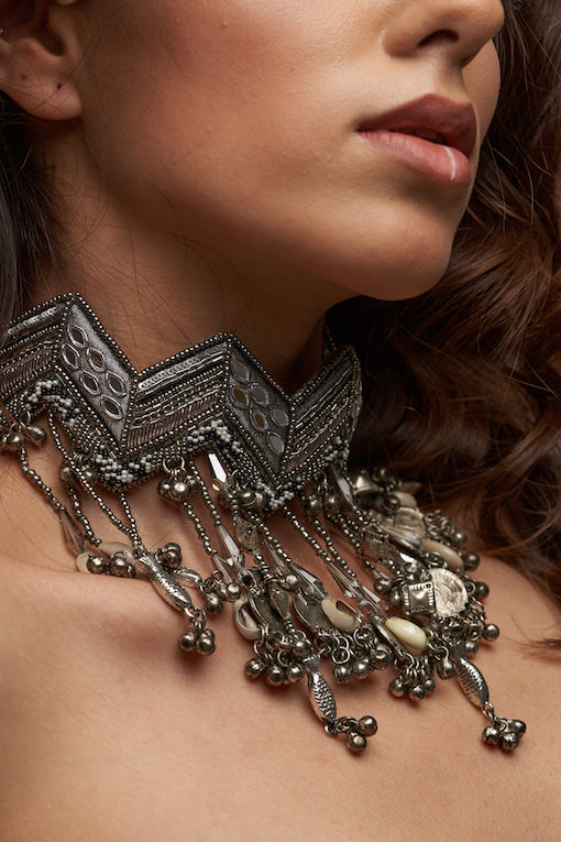 Azha Neckpiece silver is handcrafted neckpiece inspired from bohemian elements , each and every piece of this collection is an amalgamation of modern and tribal essence , 3d dimension techniques are used at the base , its zig zag shape came from tribal patterns with mettalic charms at the bottom hanging which is very graceful and bohemian .