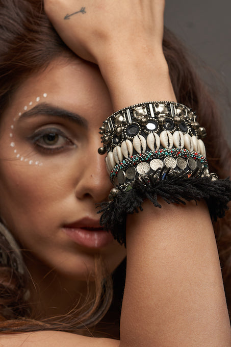 Banjara cuff is handcrafted handcuff which is Inspired by the bohemian elements , This range of jewellery is an amalgamation of colours and tribal essence, This piece is hand embroidered using threads , shells with all mirror and metal embellishments to complete the look .