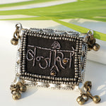 Banjaran ring is handcrafted ring with a metal base in rectangular shape and which has hand embroidery work done on top with beads and threads which says “banjaran” in hindi which is inspired from banjaran tribes and a boho term, all four sides are embellished with oxidised ghungroos .