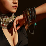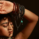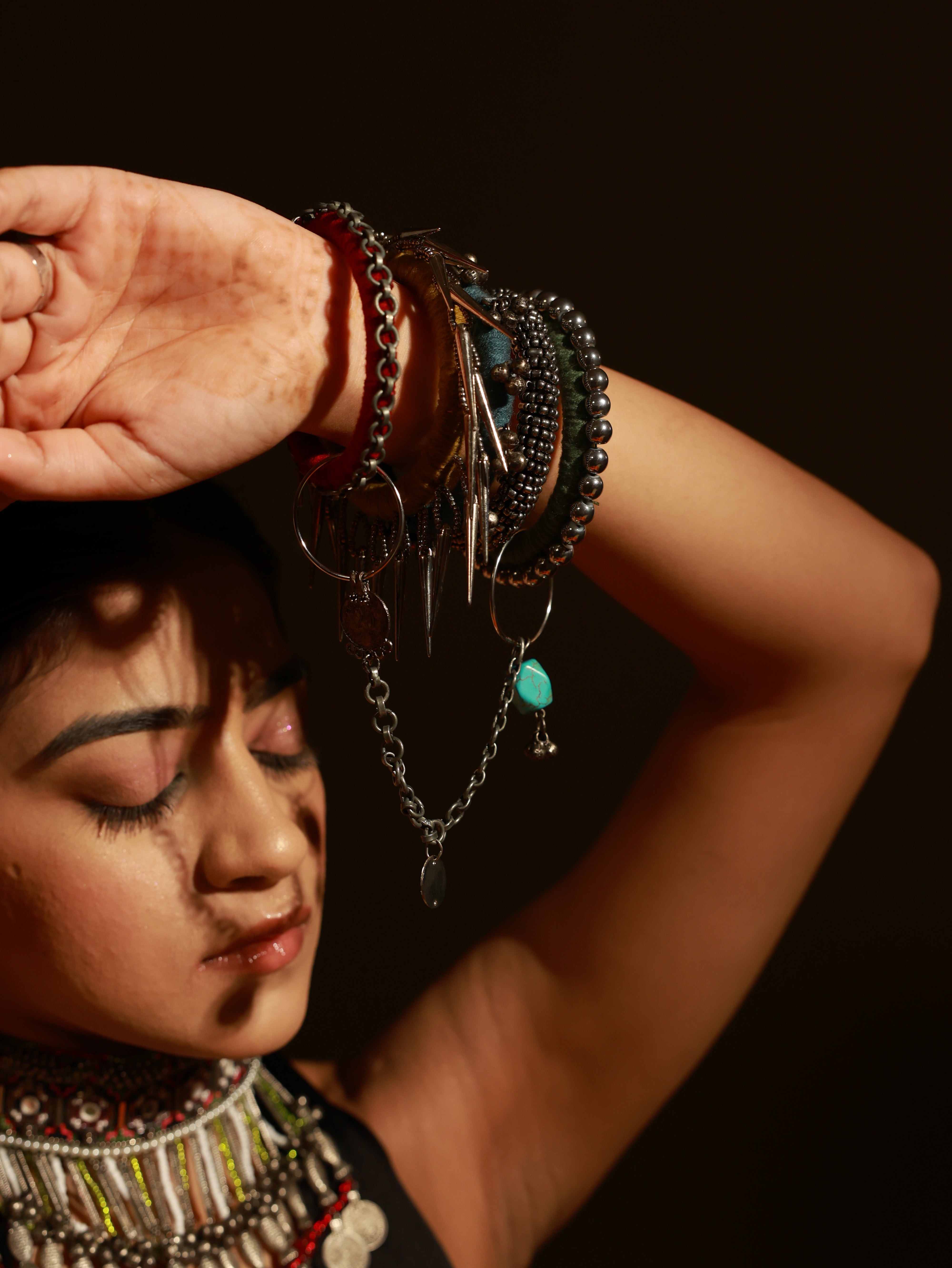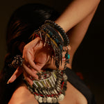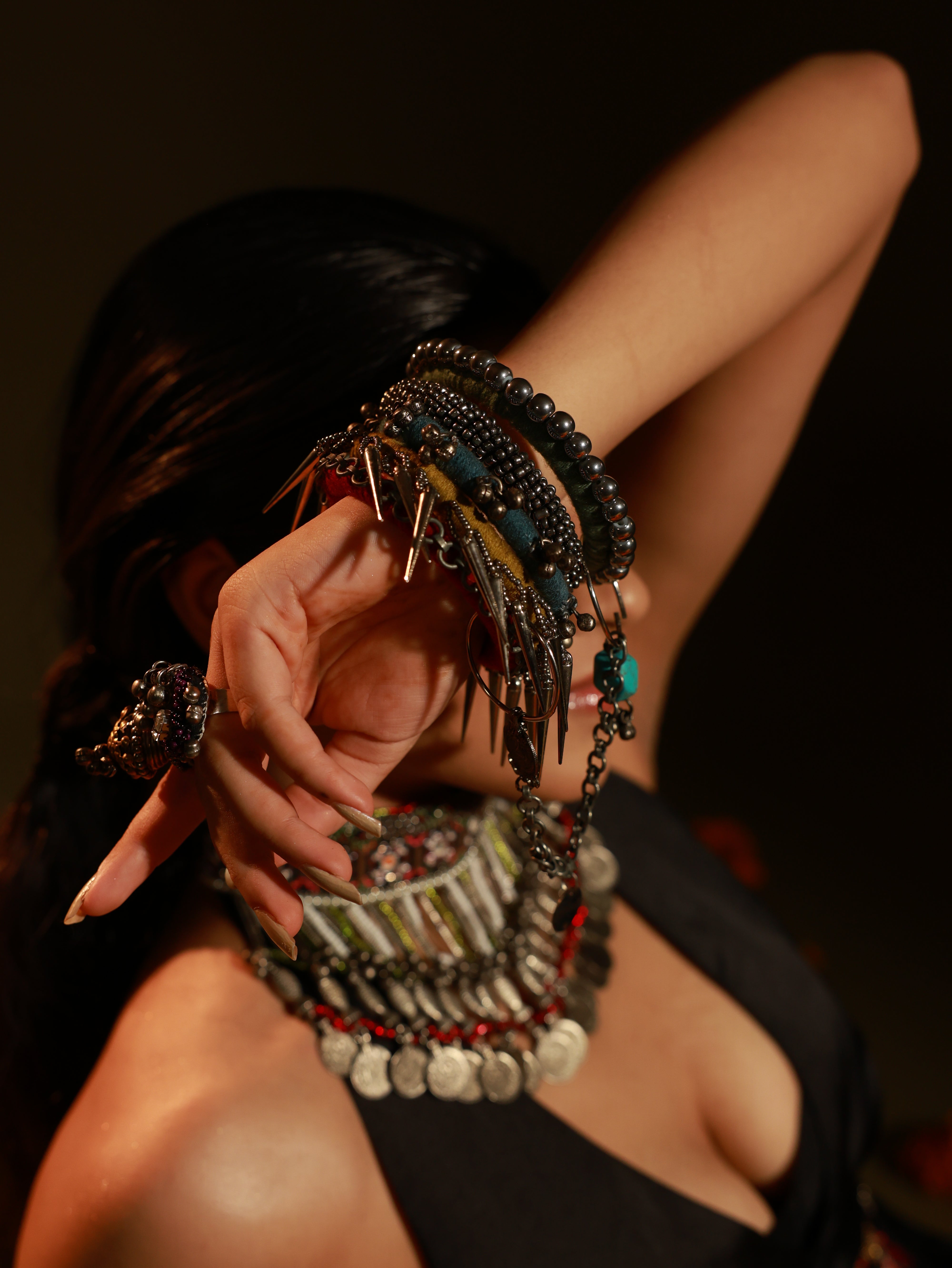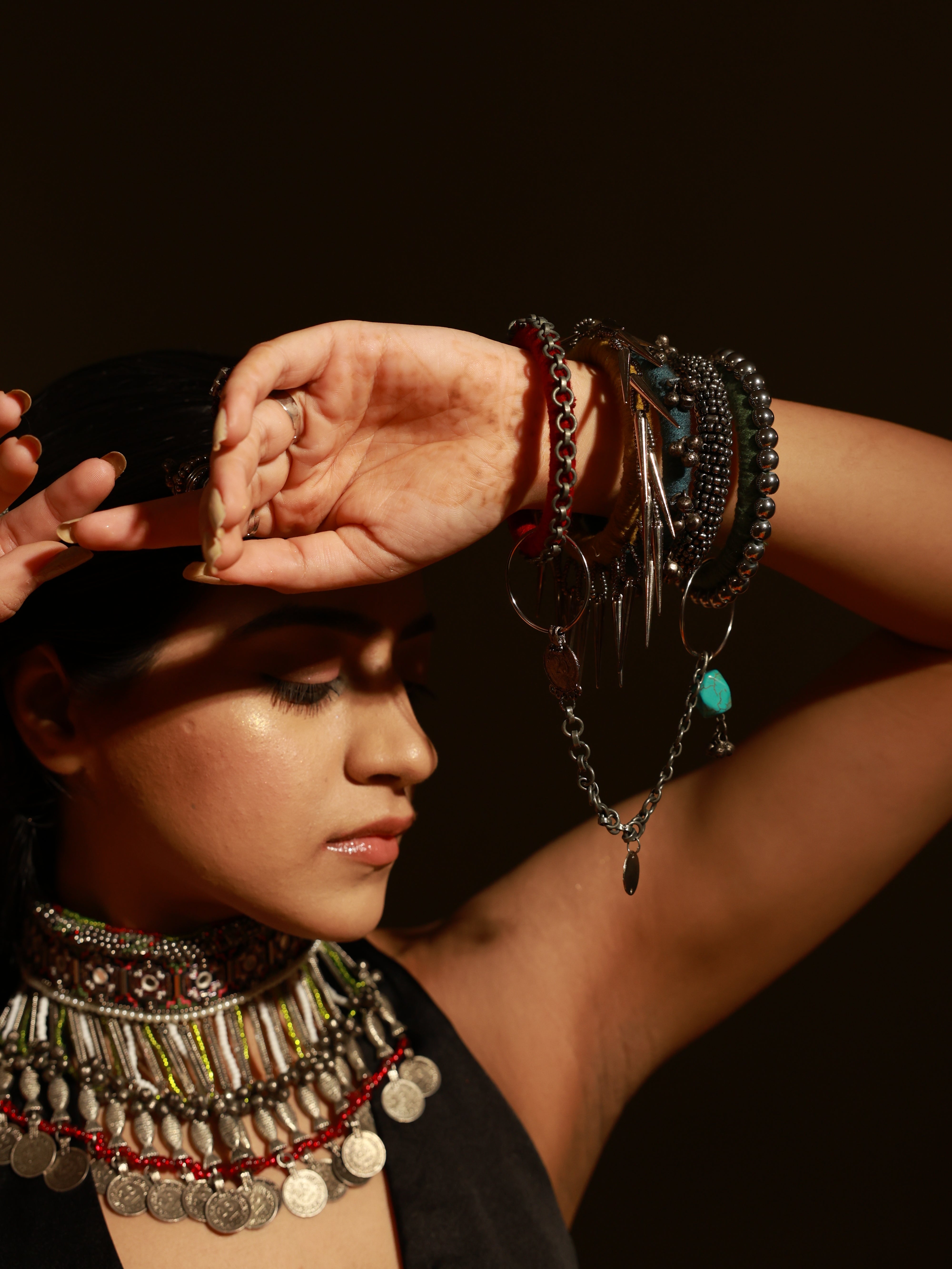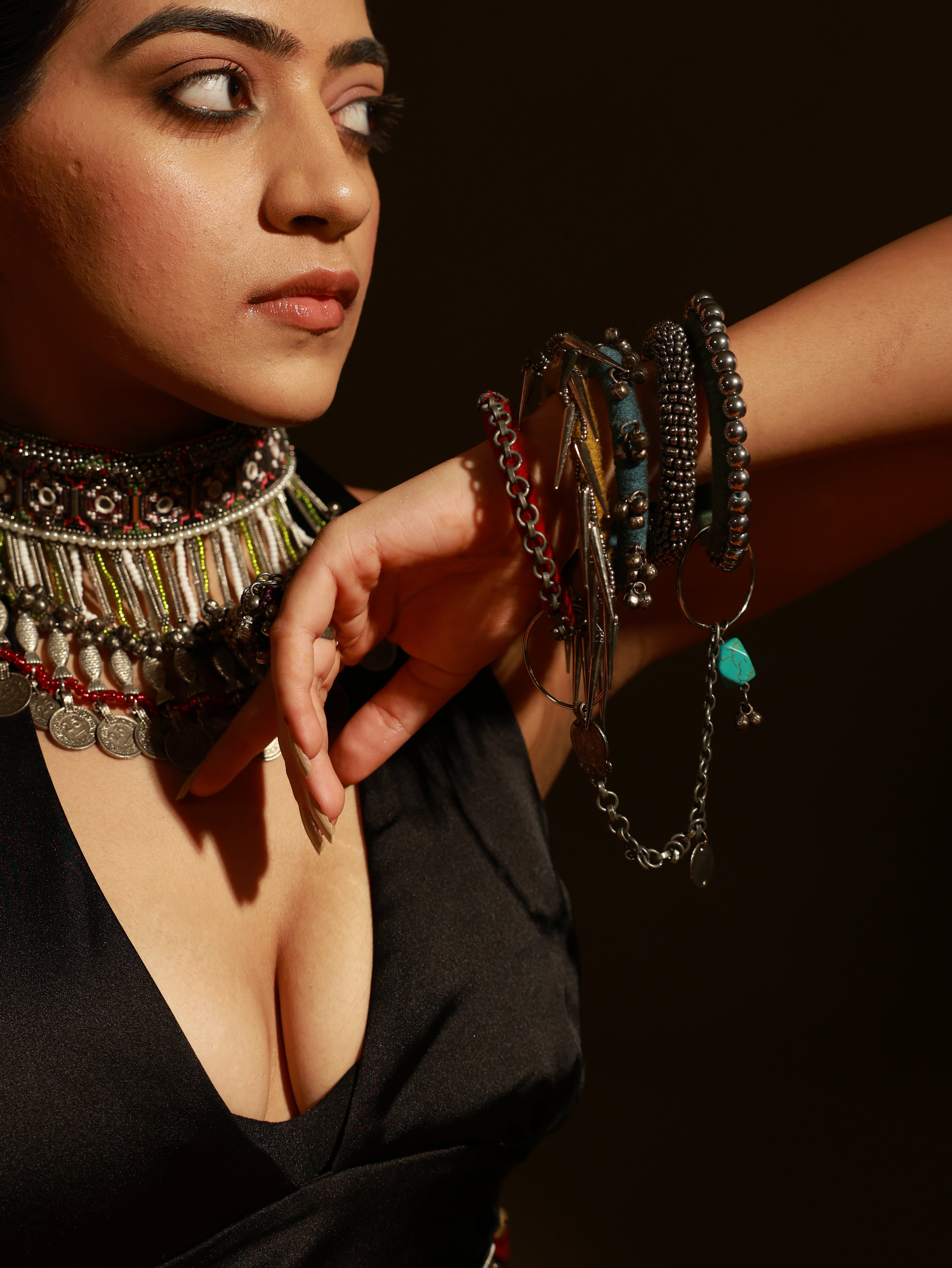 Boheme bangles set is handcrafted with metallic embellishment with bohemian essence the colour palette of this stack has all dull colours best to style in fall season . Each bangle is hand embellished with charms , chains and label .