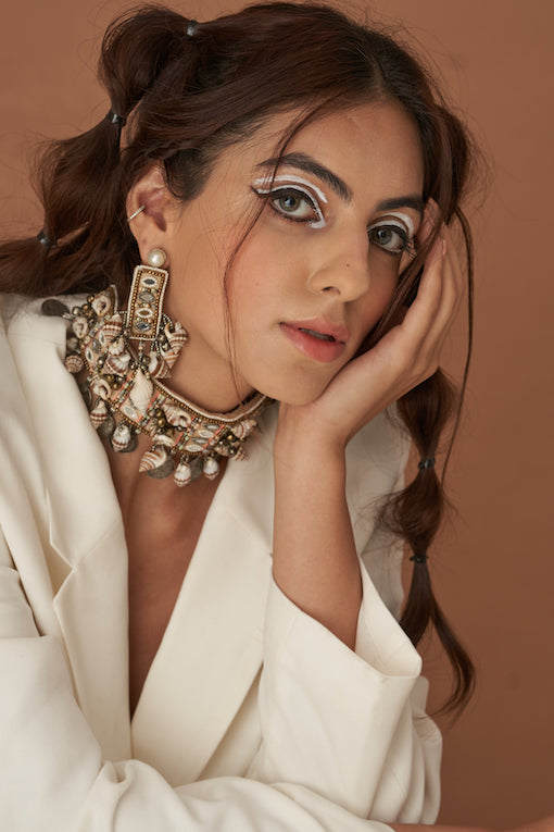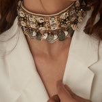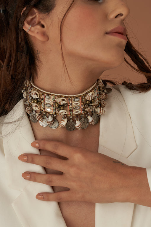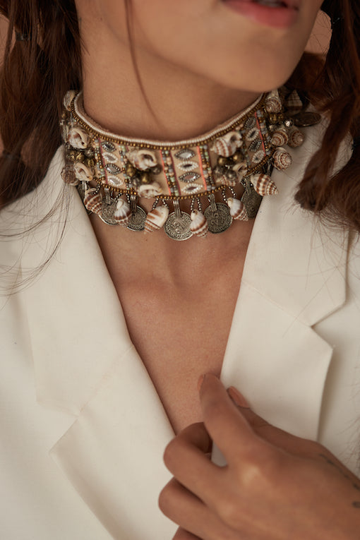 Bohemian SeaShells choker is handcrafted neckpiece on textile base which is Inspired by the bohemian elements ,everypiece in this collection is Amalgamation of bohemian and tribal essence which makes it different and statement for different occasions to style it .