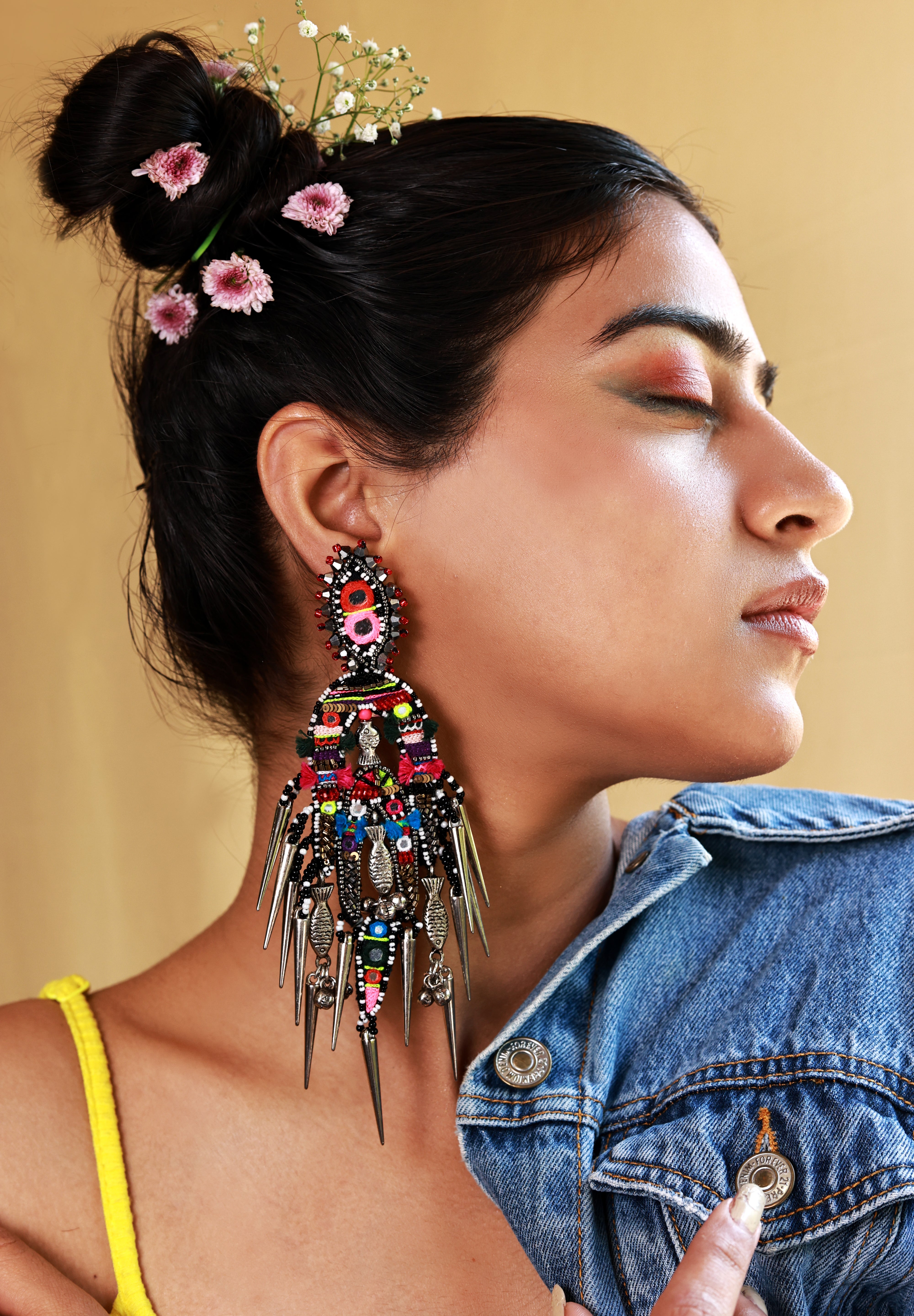 Turn heads with the boho Bloom Statement Earrings, a striking fusion of vibrant hand-embroidered details, bold beadwork, and metallic charms. Adorned with metal fish and spike accents for a fierce edge, these earrings blend traditional tribal artistry with contemporary fashion. Perfect for festive occasions, destination weddings, or a boho-chic day out, they are a true celebration of color, craftsmanship,