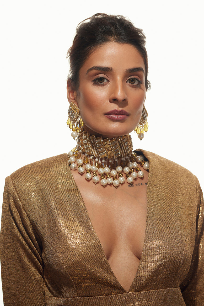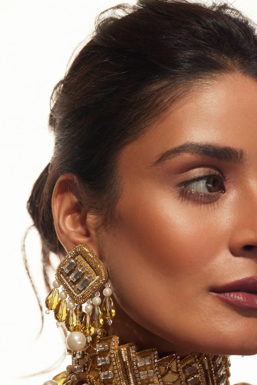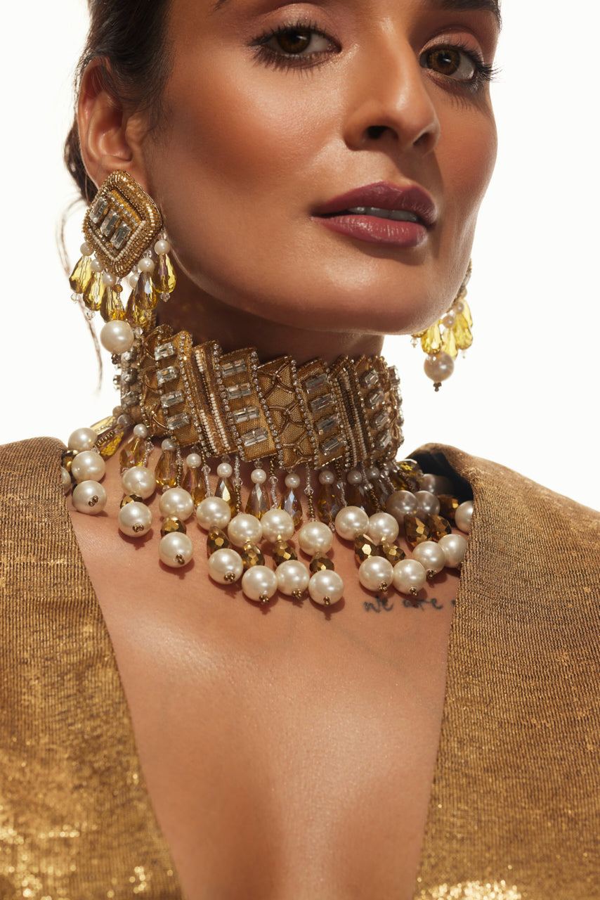 The Briana gold necklace set is elegantly designed with intricate hand embroidery using crystal embellishments baguette crystals and dressed with pearl hangings.