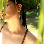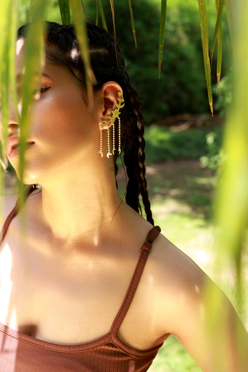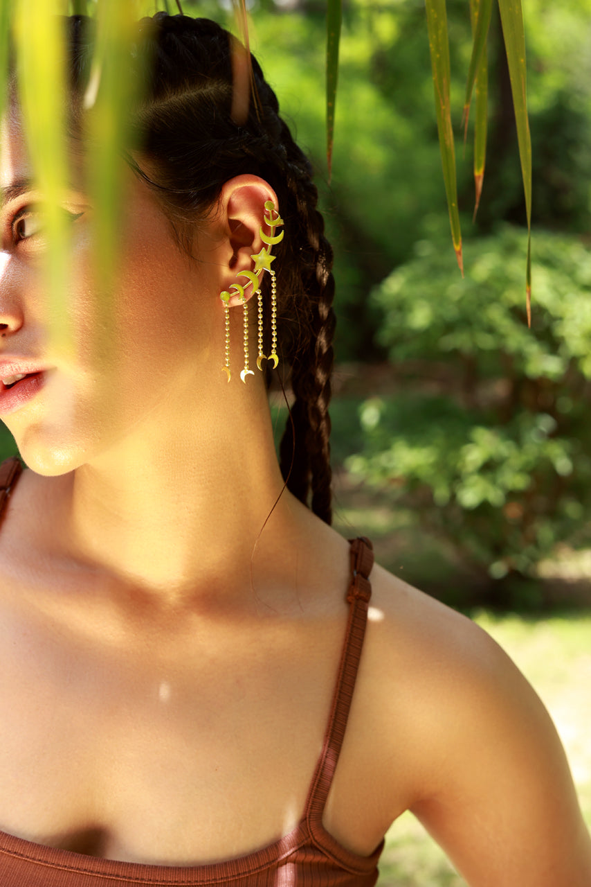 These celestial-themed earrings are a whimsical fusion of fantasy and elegance. Designed as an ear cuff and drop earring combo, the piece features a sequence of golden moon phases, crescent moons, and stars that delicately climb the ear and cascade down in graceful strands. Each strand is adorned with tiny golden chains ending in crescent charms, creating movement and a magical, starry-night allure.