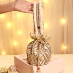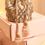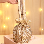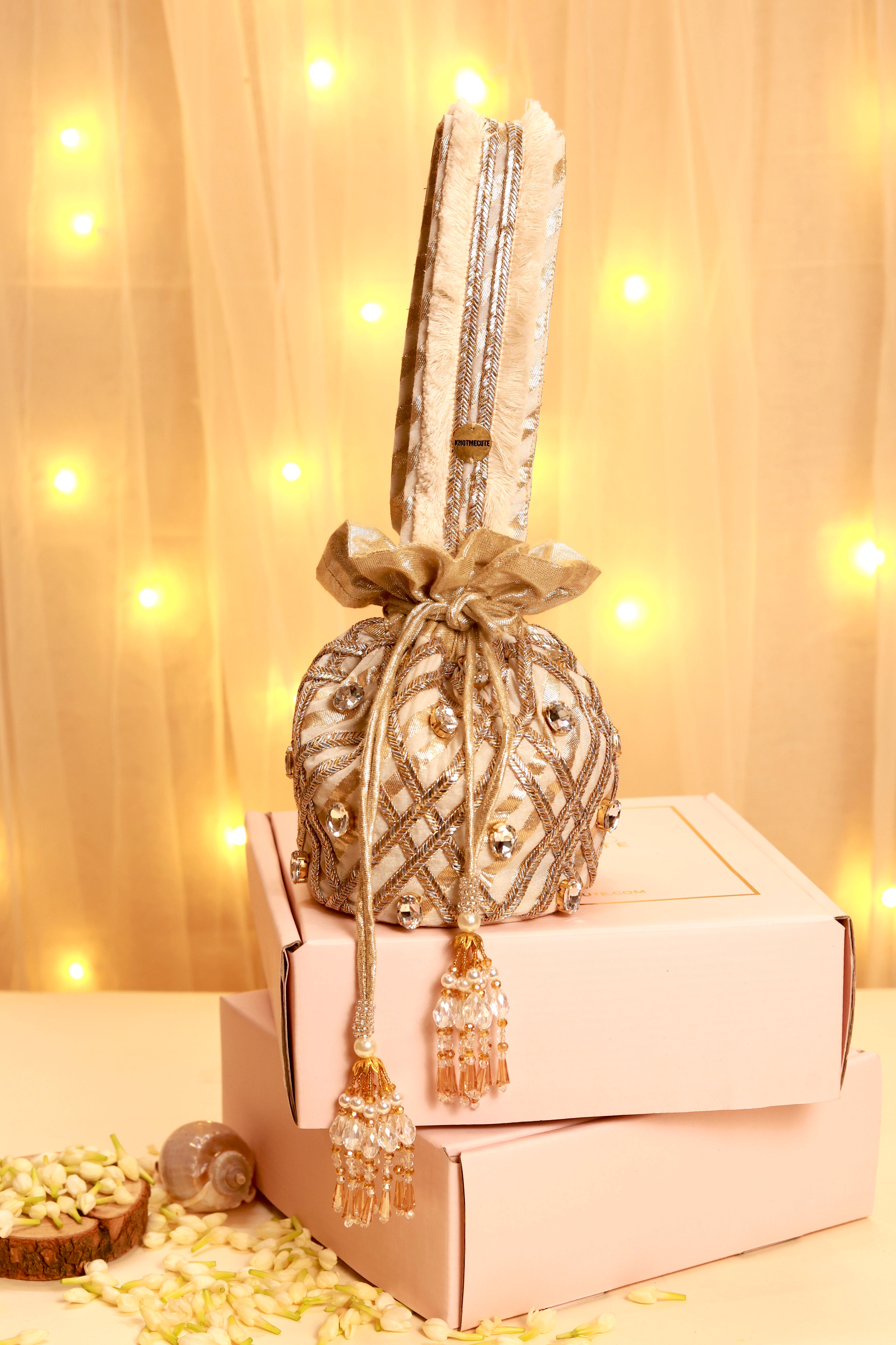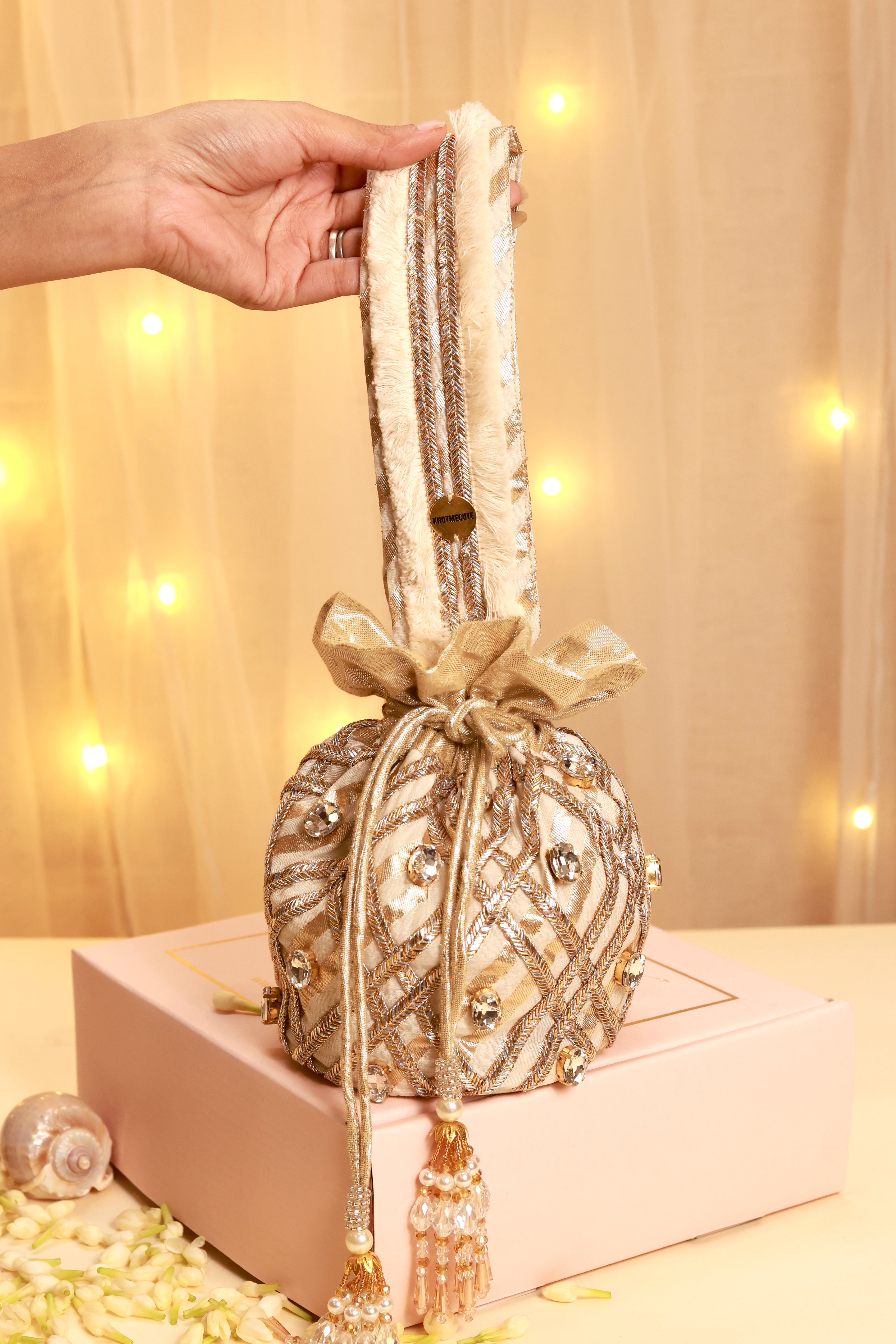Ivory cham cham bag us handcrafted with most luxurious crystals which shines bright when a party light strikes , perfect to grab this bag for weddings, parties and wedding favours . comes with detachsbld handles and drawstring hangings with most luxurious crystals and pearls .