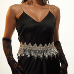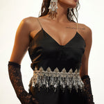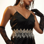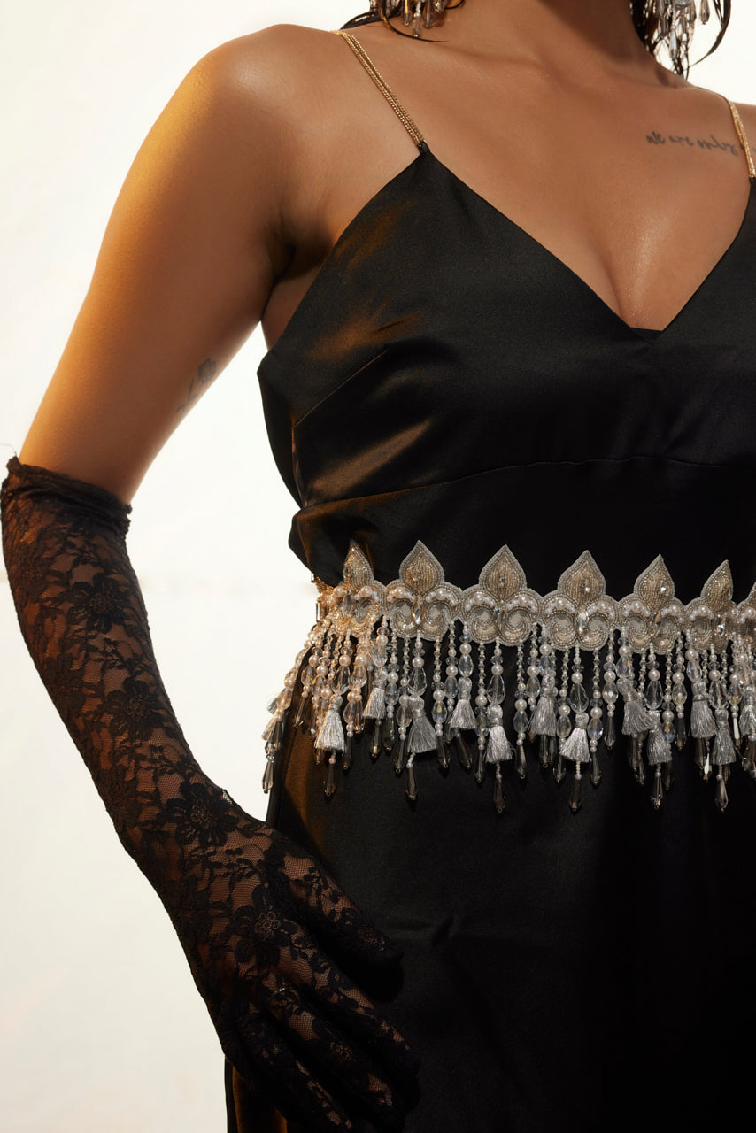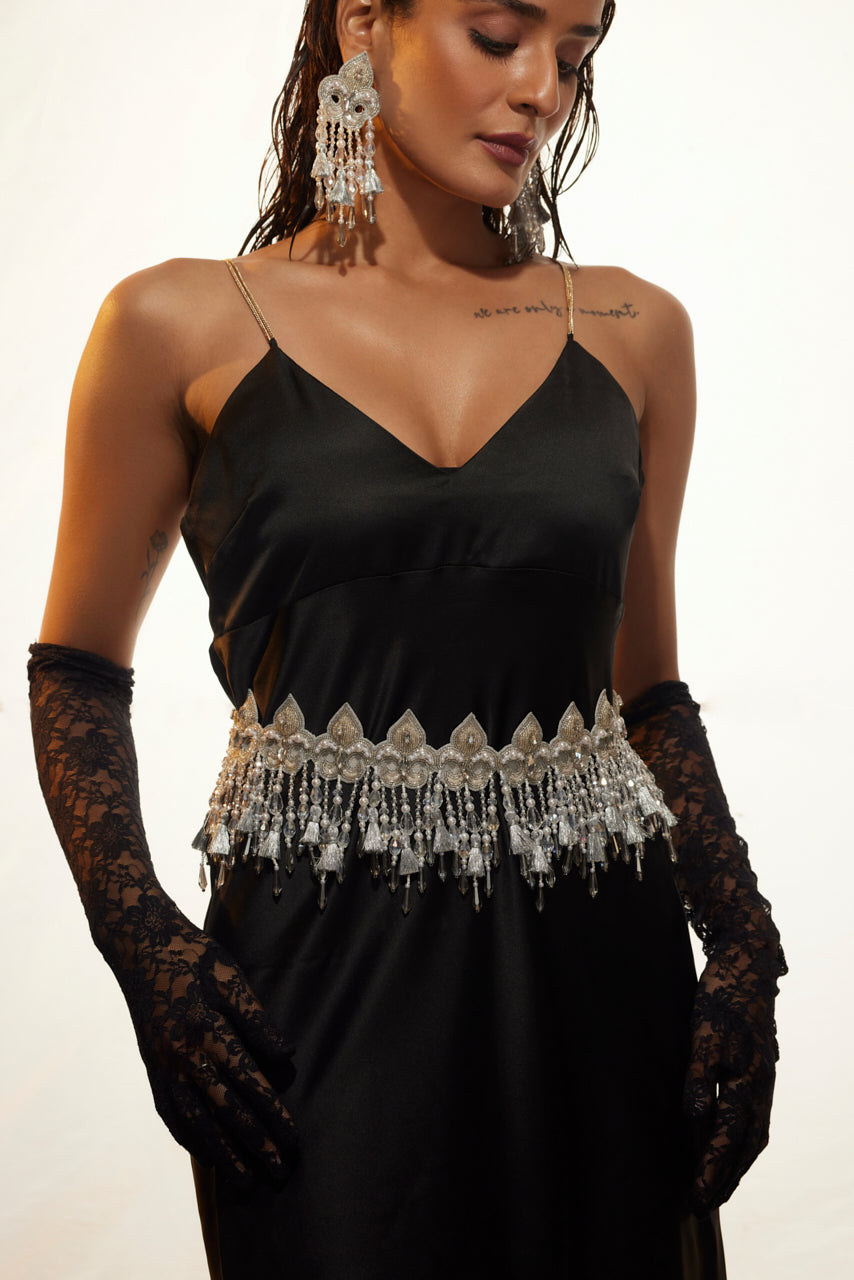 Chloe silver shimmer belt is designed with 3 D extravagant beaded clustered earrings with lustrous shinning crystals and silver metallic tassel featuring delicacy of pearls . Shimmer silver tassels with luxurious shine crystals in geometric shapes are perfect to add grace . It comes with tie knot closure at back which fits easily .
