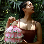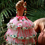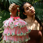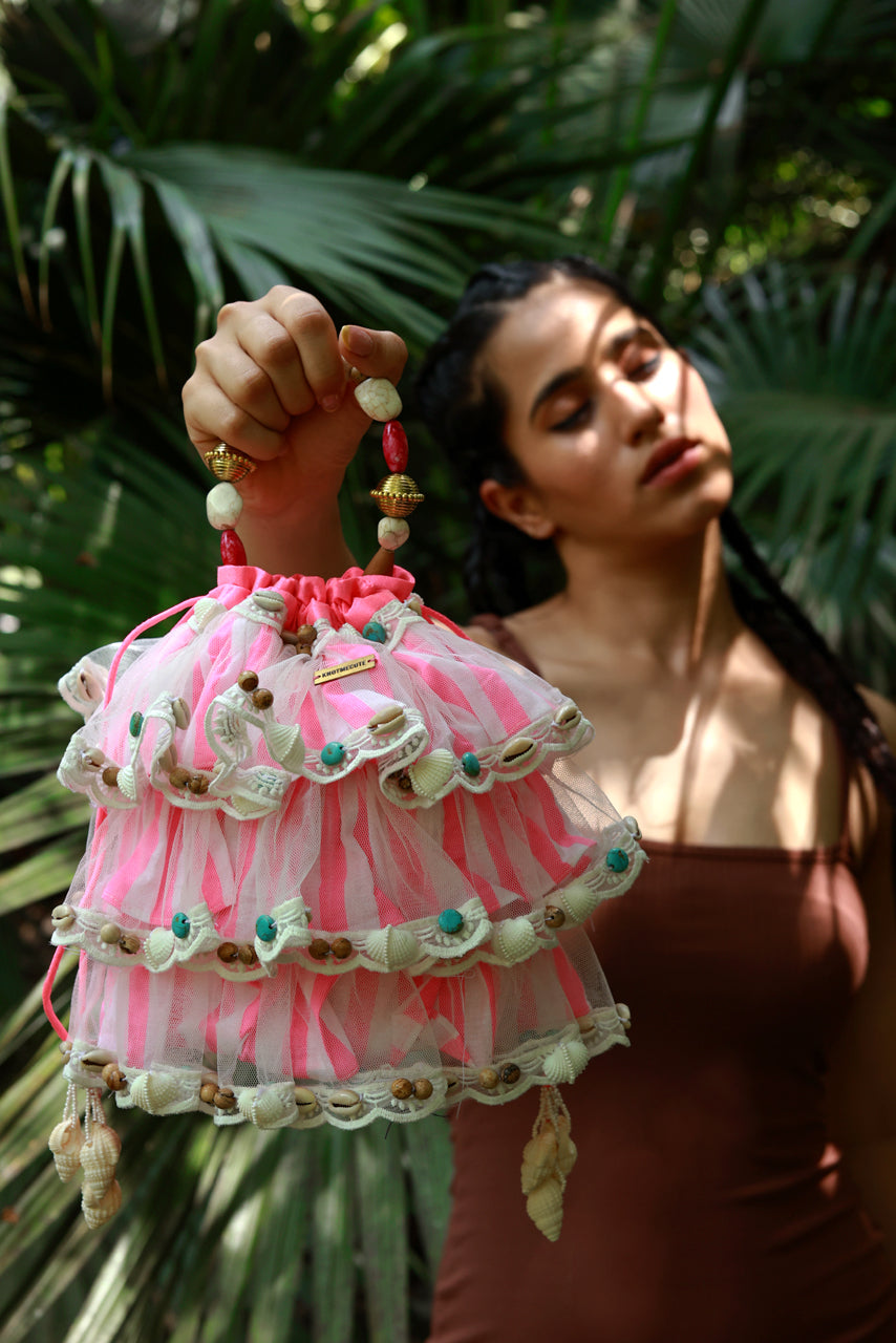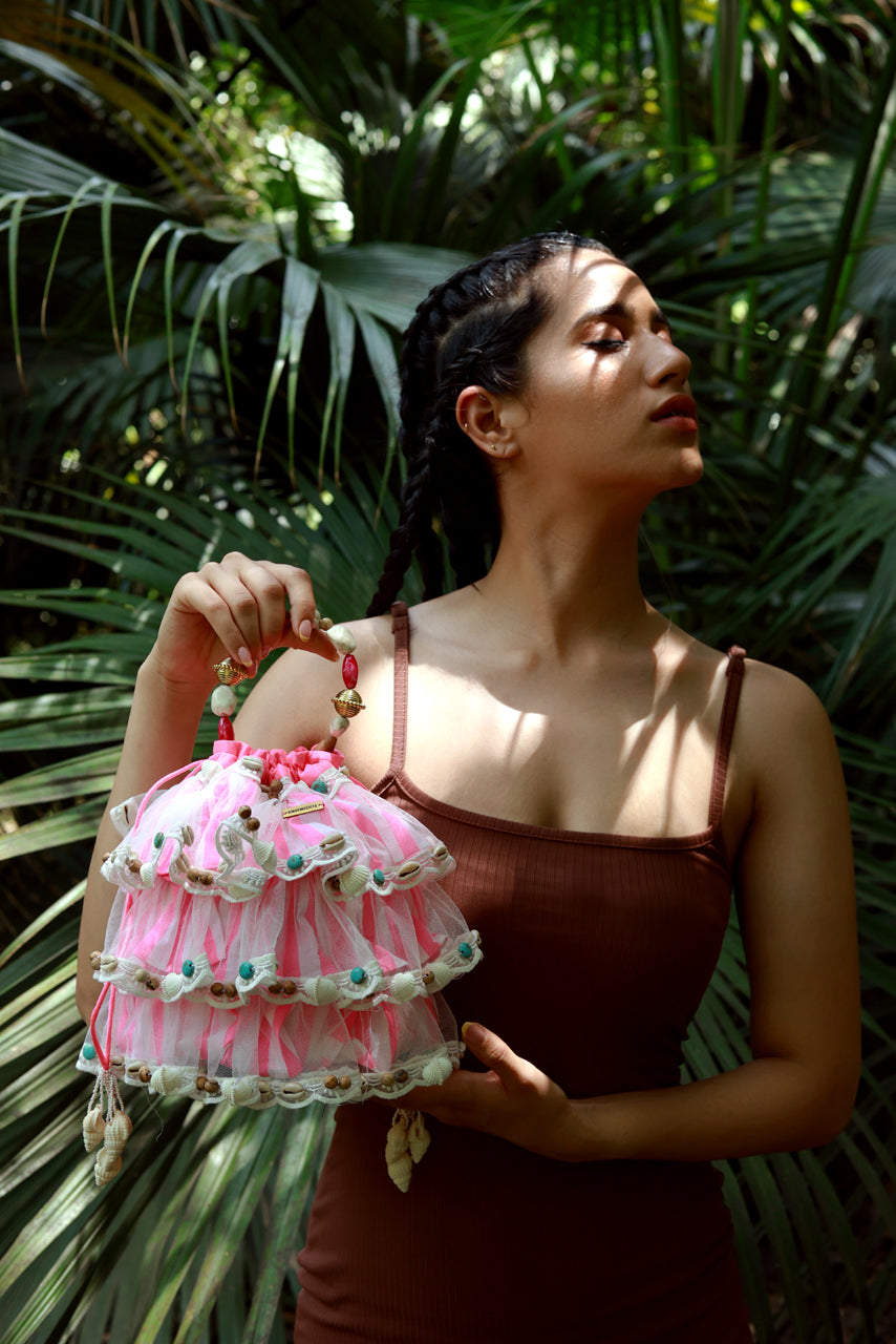 Coastal ruffle bag is perfect for every beach walk into a runway moment with this handcrafted ruffled potli, drenched in sunset pinks and adorned with rows of cowrie shells, turquoise beads, and wooden accents. Layers of soft net frills flow like ocean waves, while the chunky beaded handle adds a bold, artisanal charm — making it the perfect carry-along for resort brunches, tropical weddings, or coastal vacays.