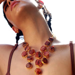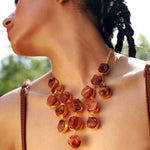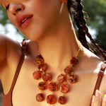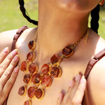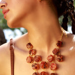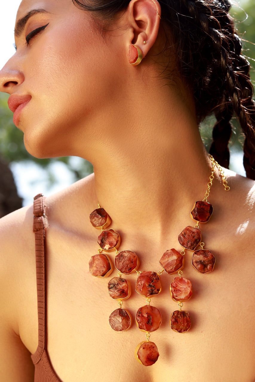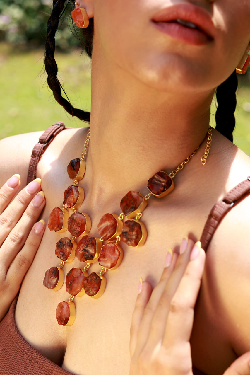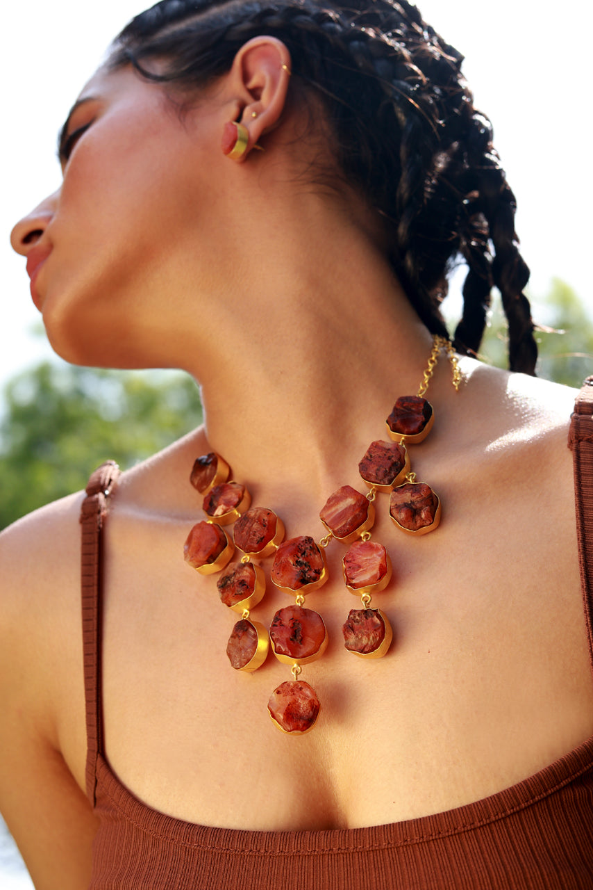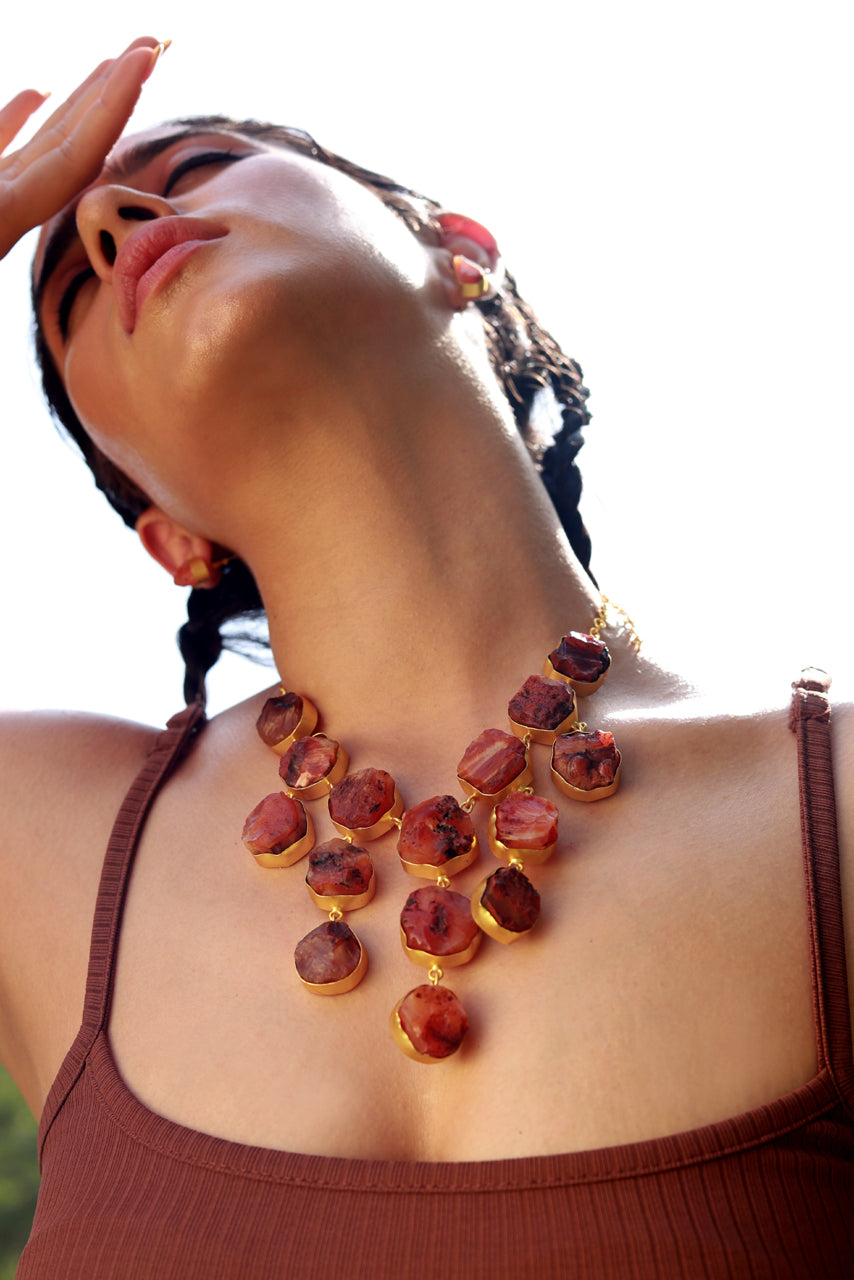This statement necklace features organic crimson-toned stones delicately set in handcrafted gold-plated brass bezels. Inspired by the textures of coastal rocks kissed by sunset waves, it brings together natural imperfection and regal finish — LUMIRAE