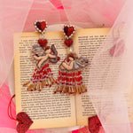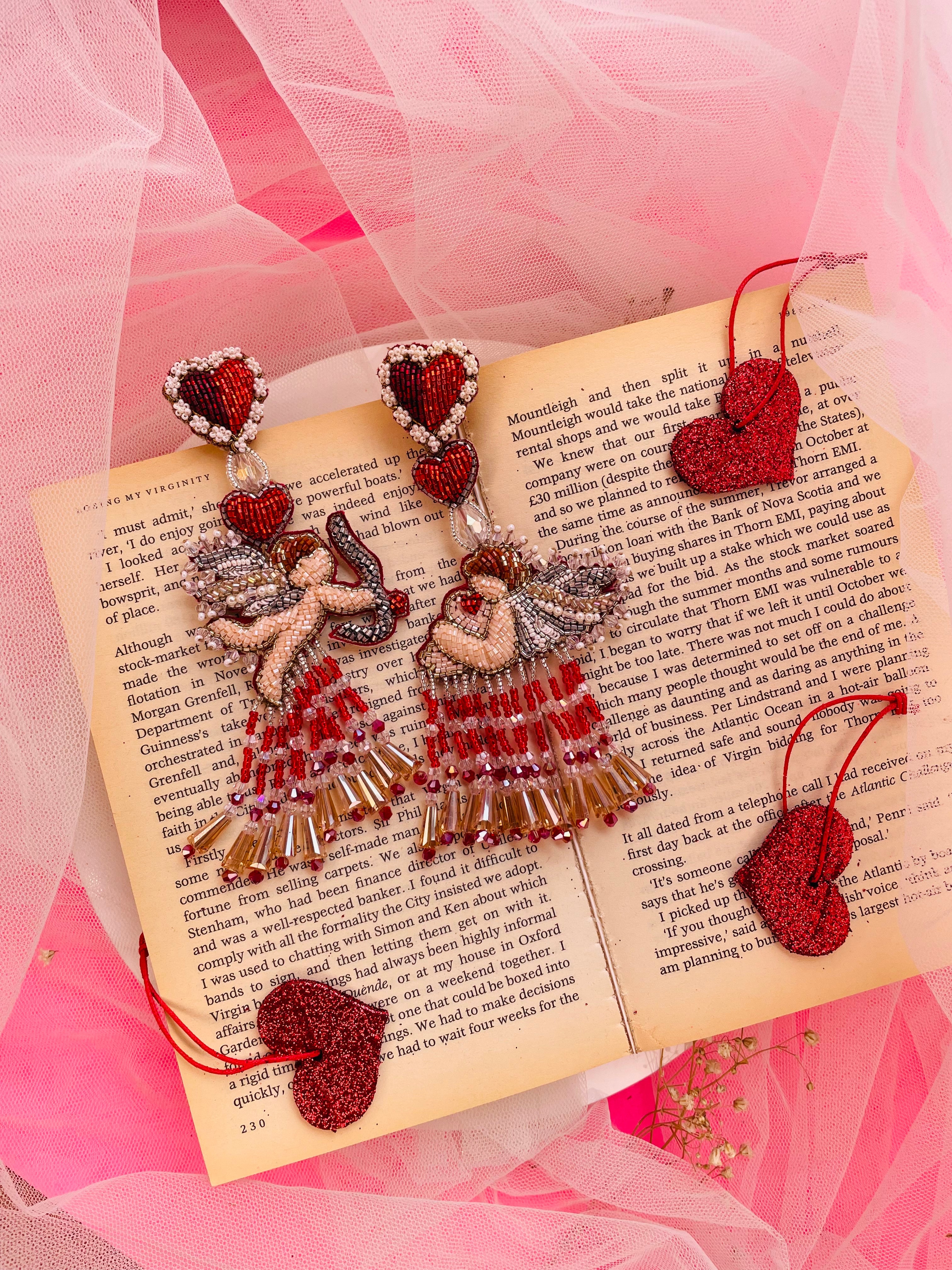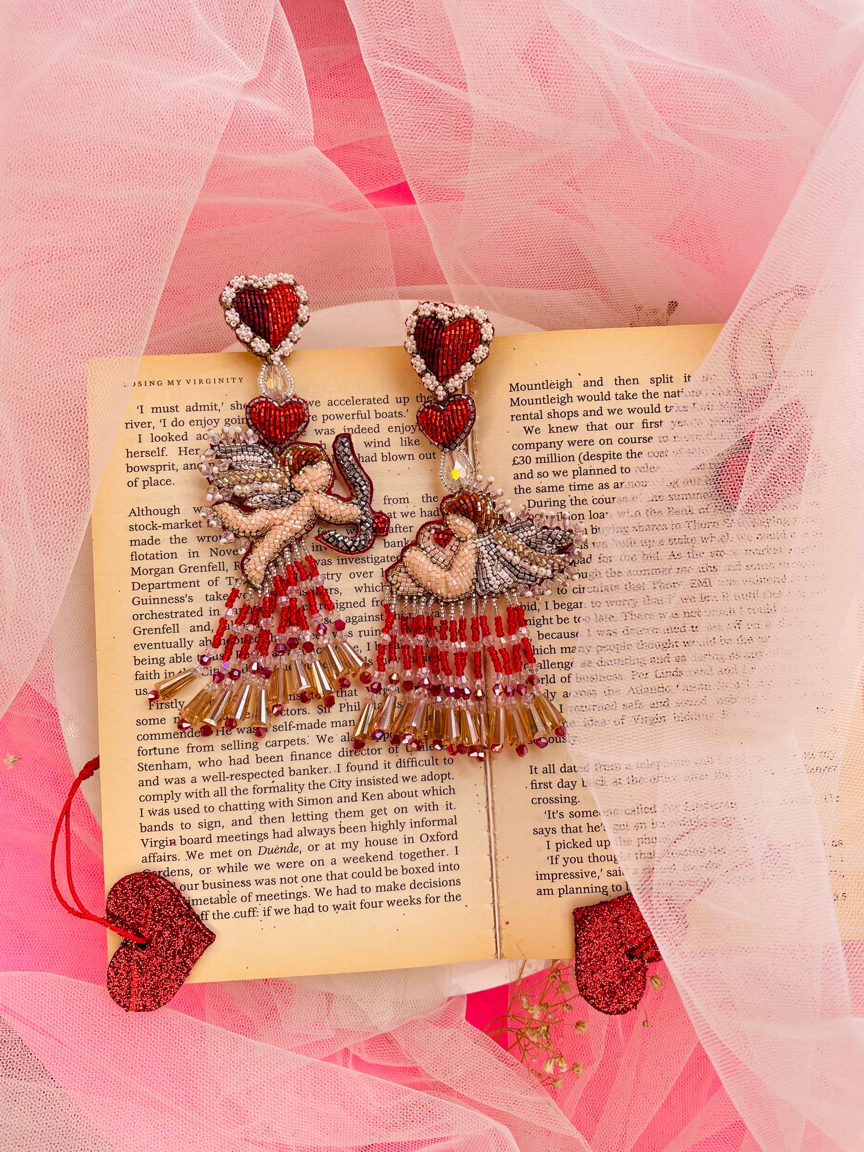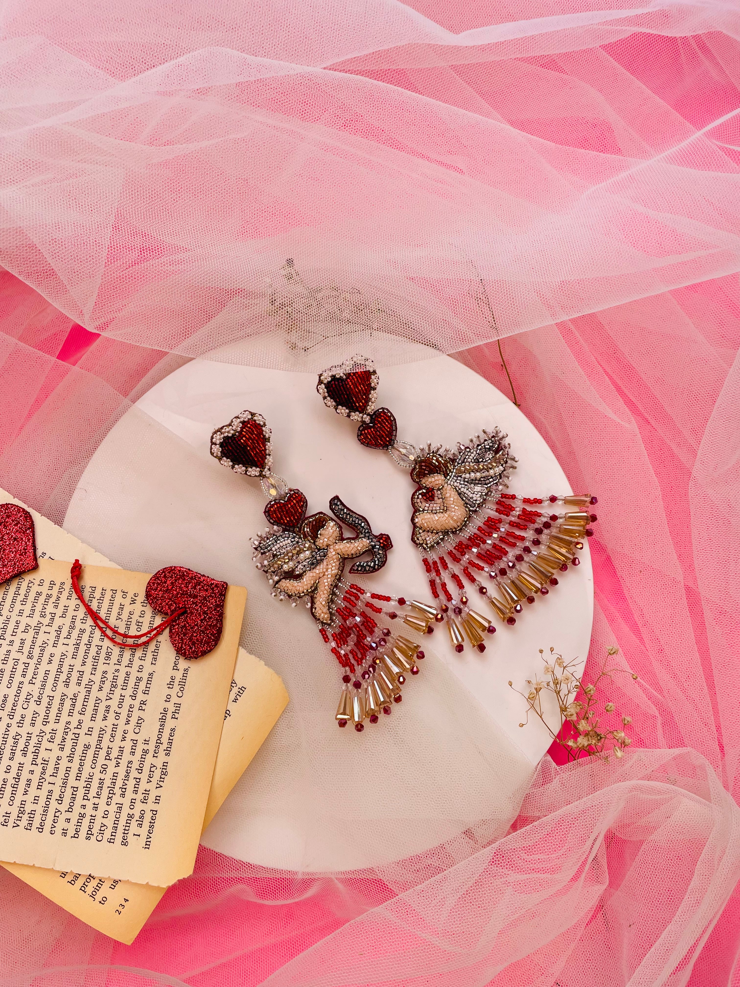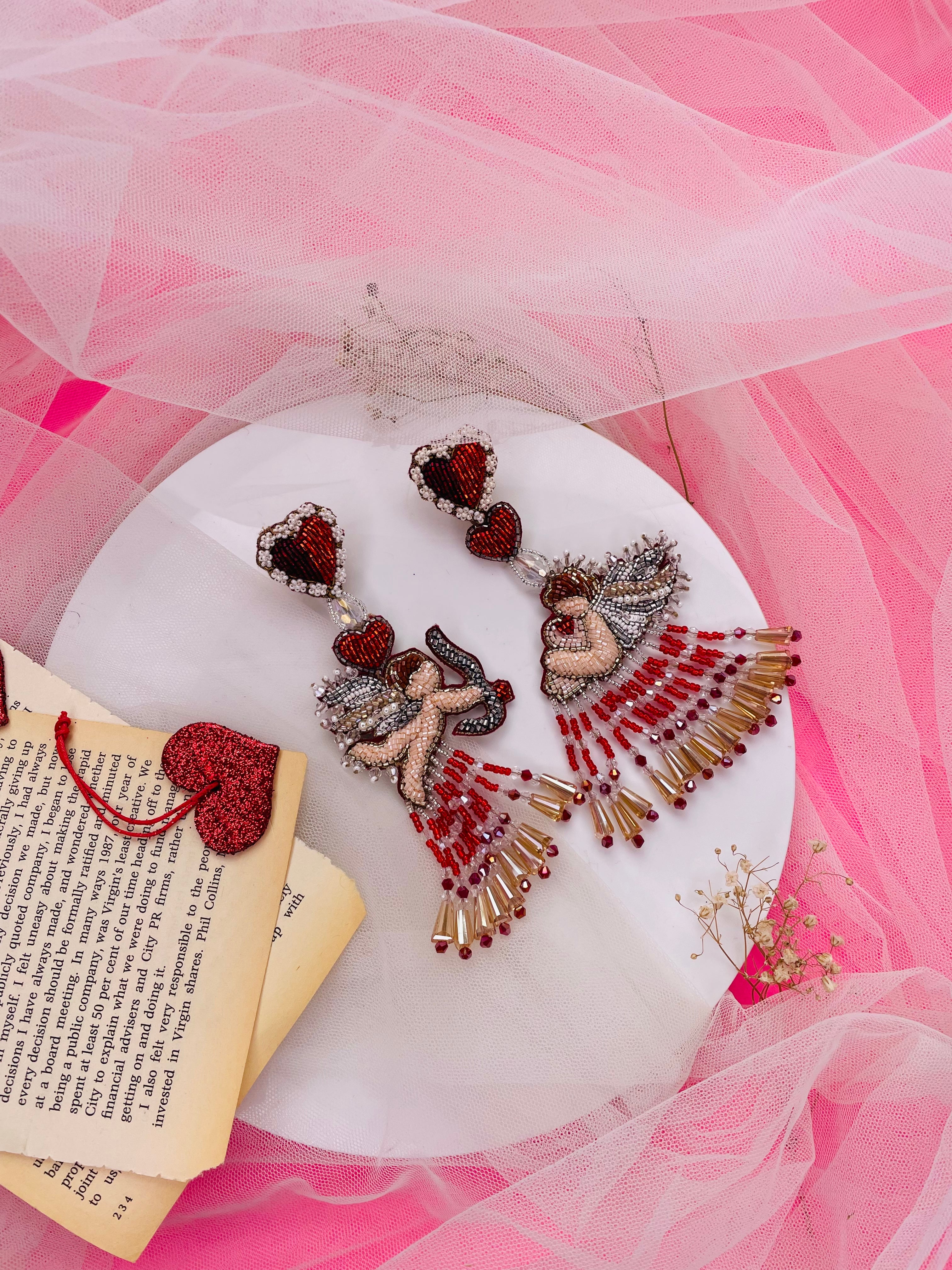 Cupid’s love danglers are handcrafted with hundreds of fine lustrous glass beads which compliments with glass crystal hangings and cute pair of cupid which symbolises love . Perfect gift for her and very lightweight .