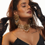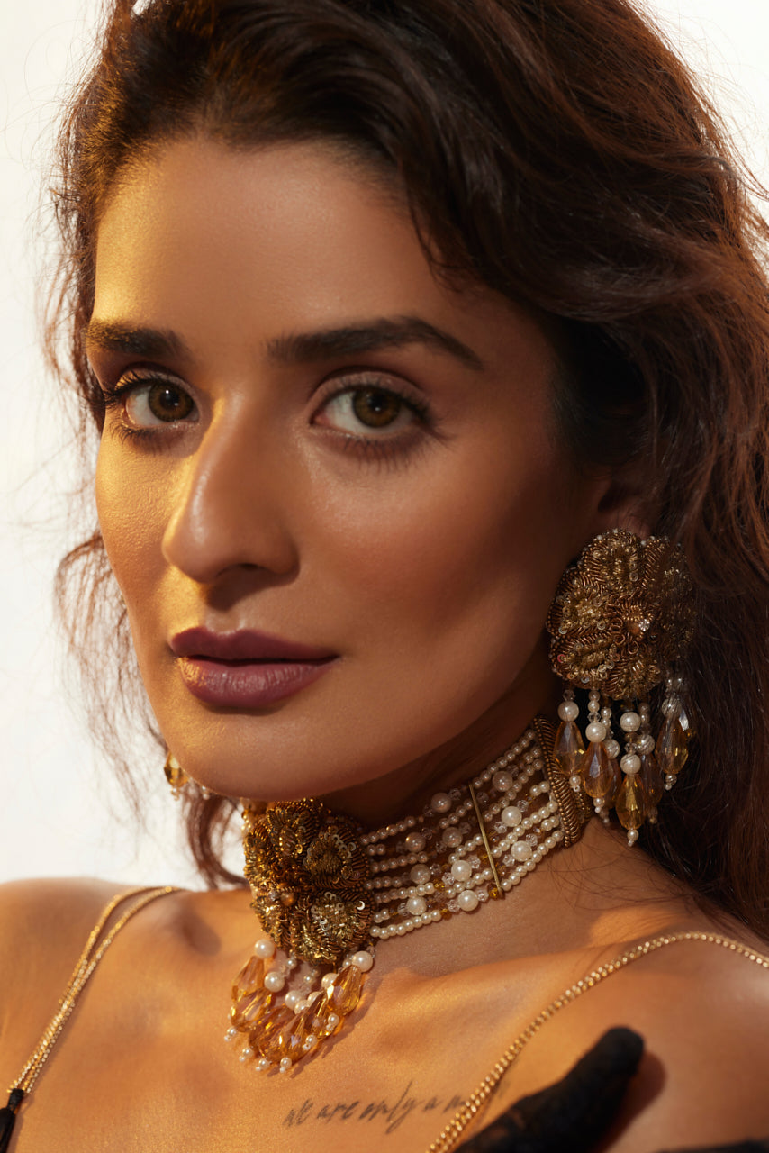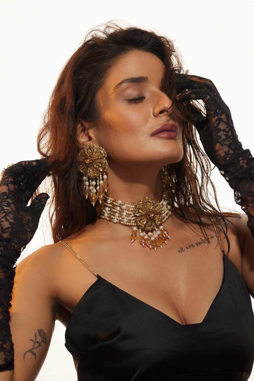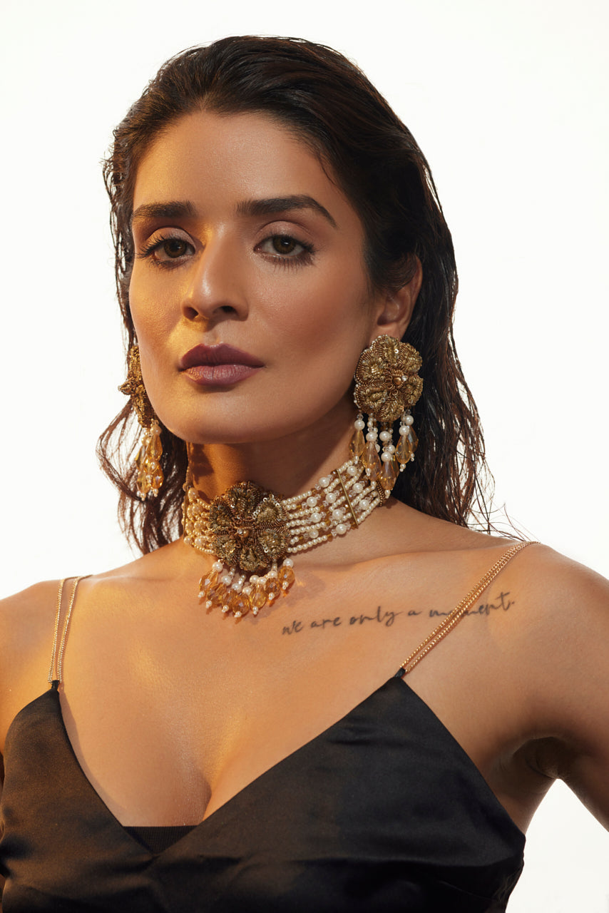Cyra gold is combination of creativity and exquisite craftsman-ship. The set is designed with intricate Zari gold embroidery that feature pearls and crystals