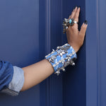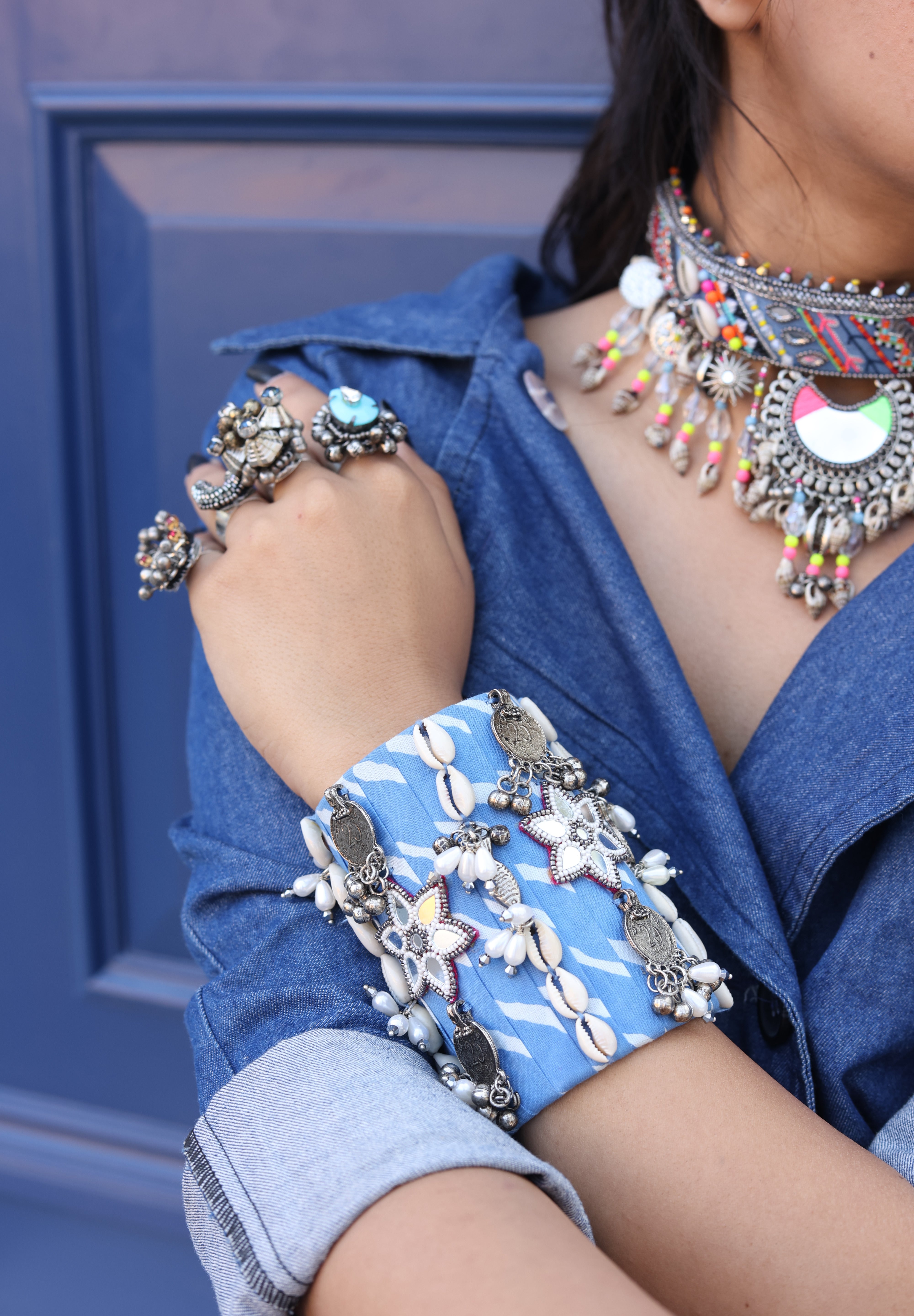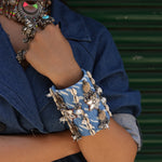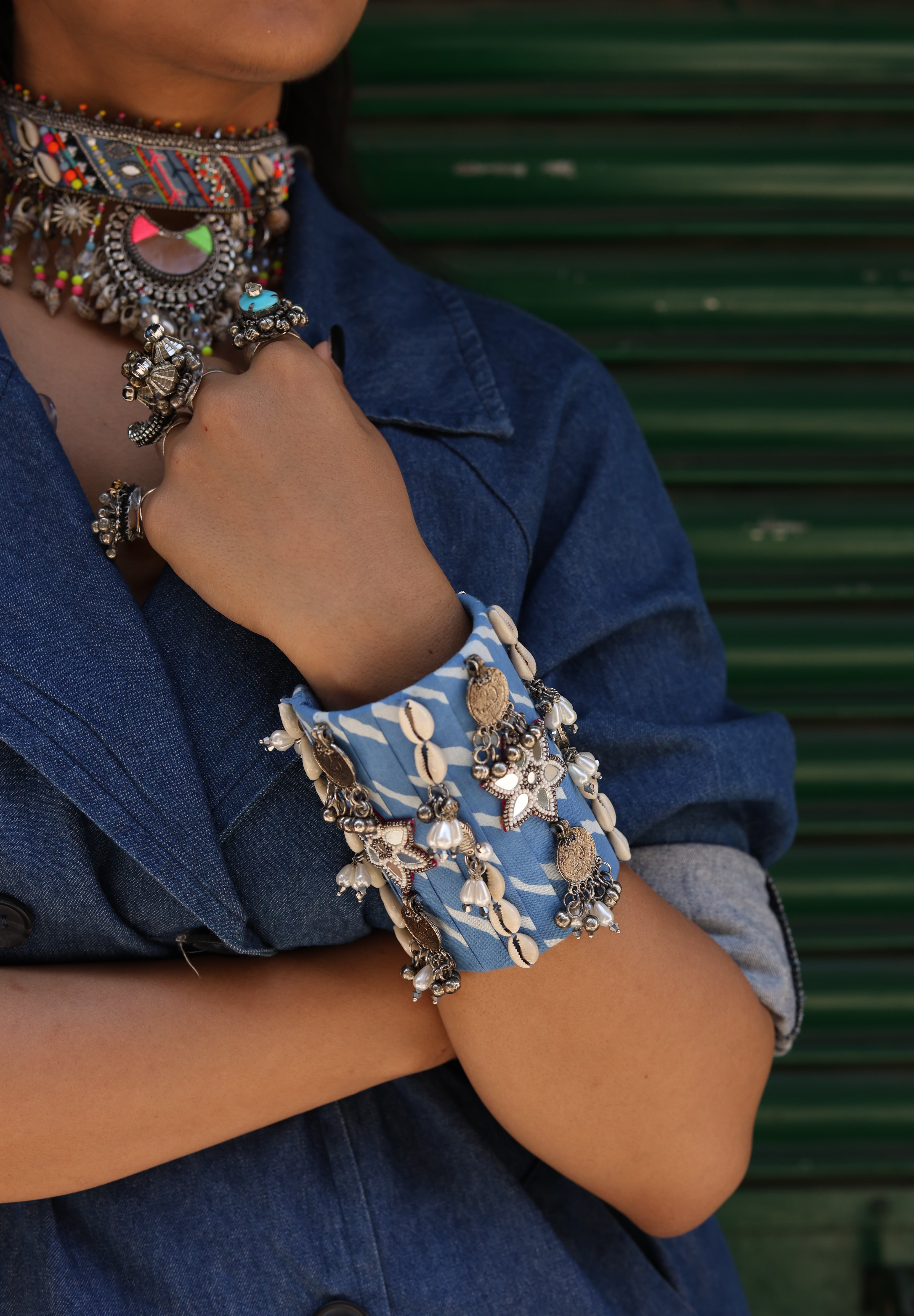 Denim Mogra handcuff is handcrafted cuff which is Inspired by the bohemian elements , This range of jewellery is an amalgamation of colours and tribal essence, cuff is light blue leheriya base with complementing flower shaped mirrors with ghungroos , pearls and shells embellishments on the top and sides which makes it different and statement hand accessories .