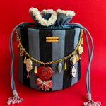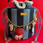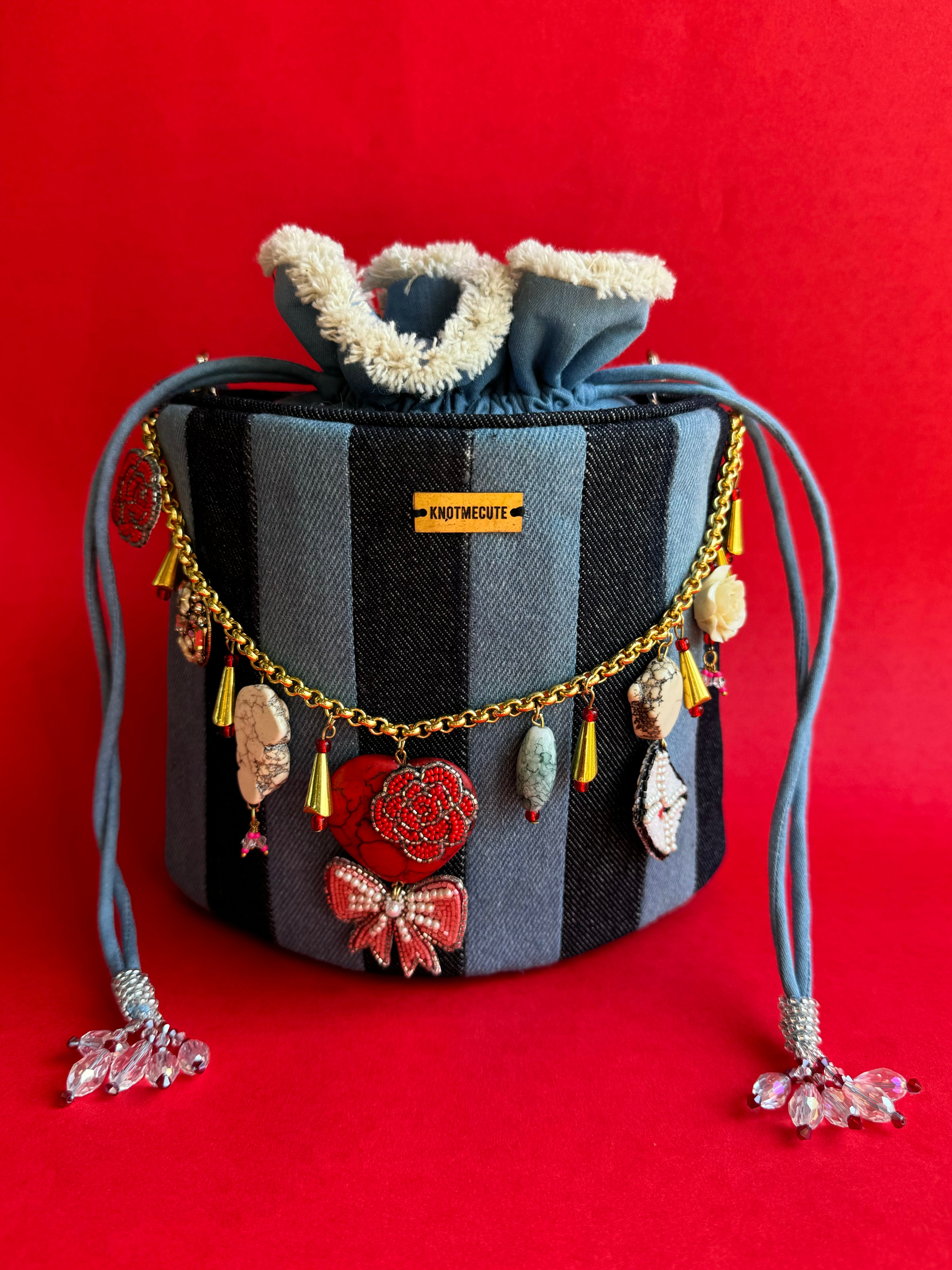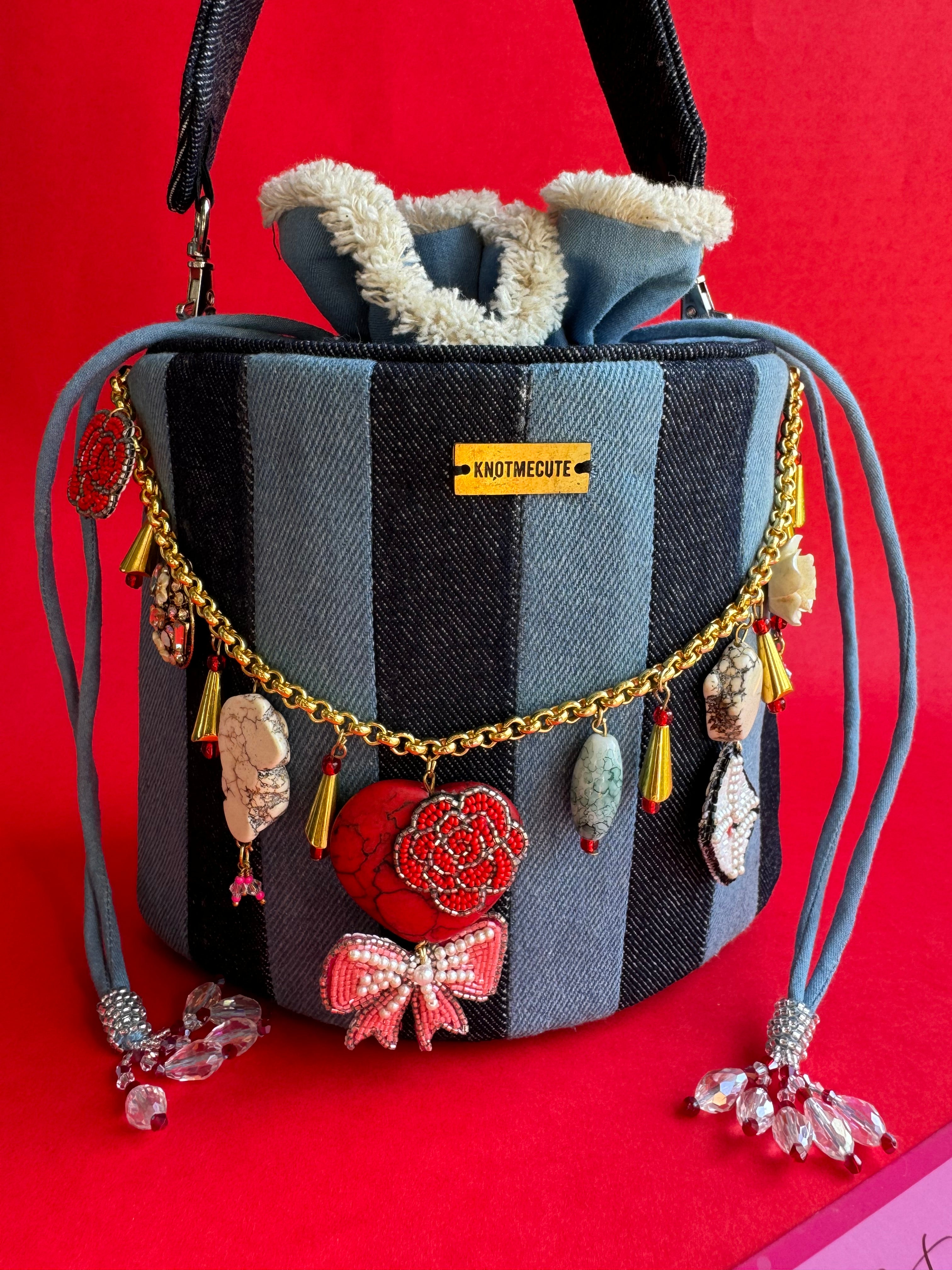 Denimize love bag is sculpted handcrafted bag with unique shape , two tone denim is patched and sewed to perfection along with charms and a brass gold chain .
