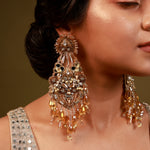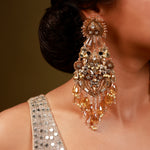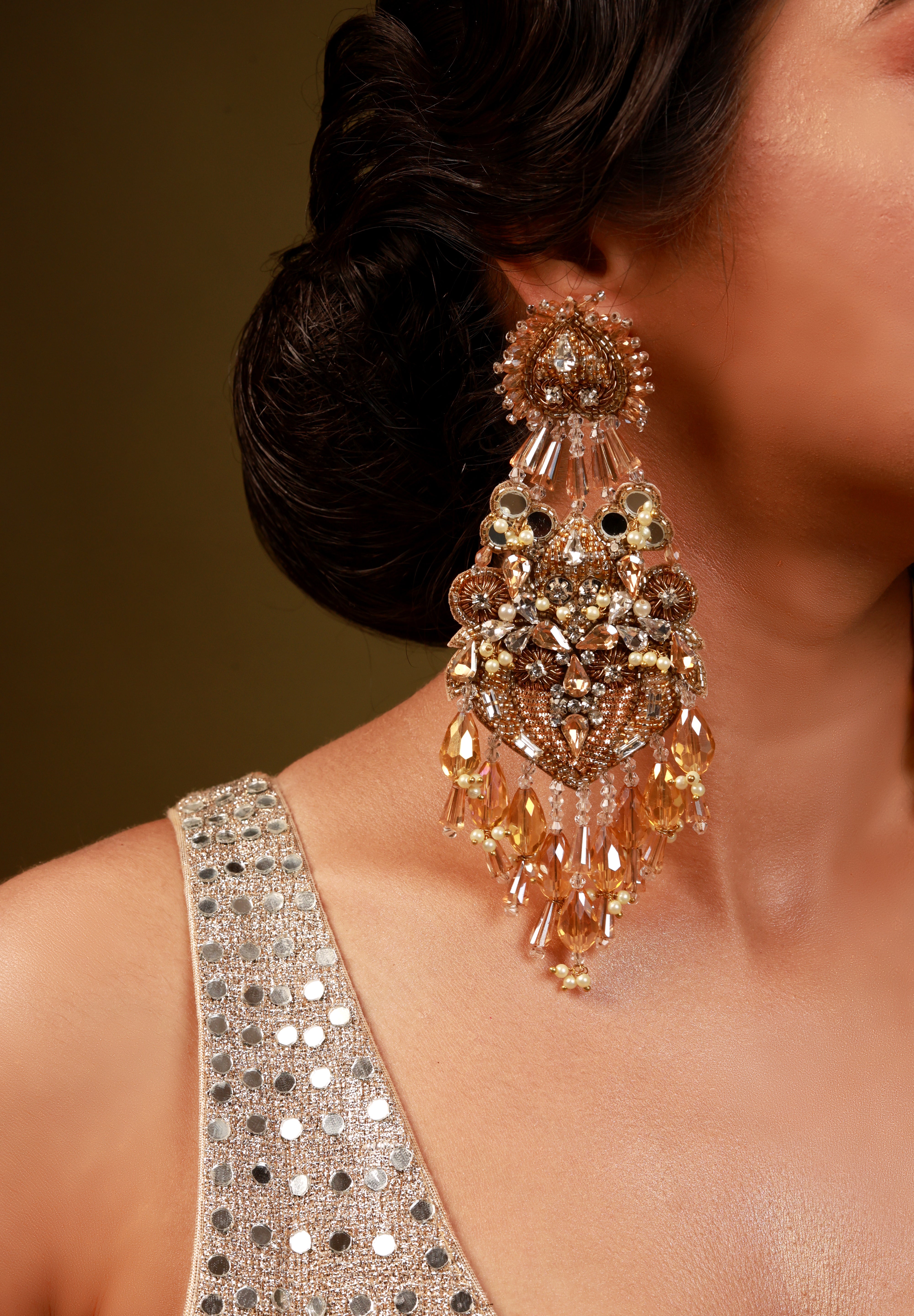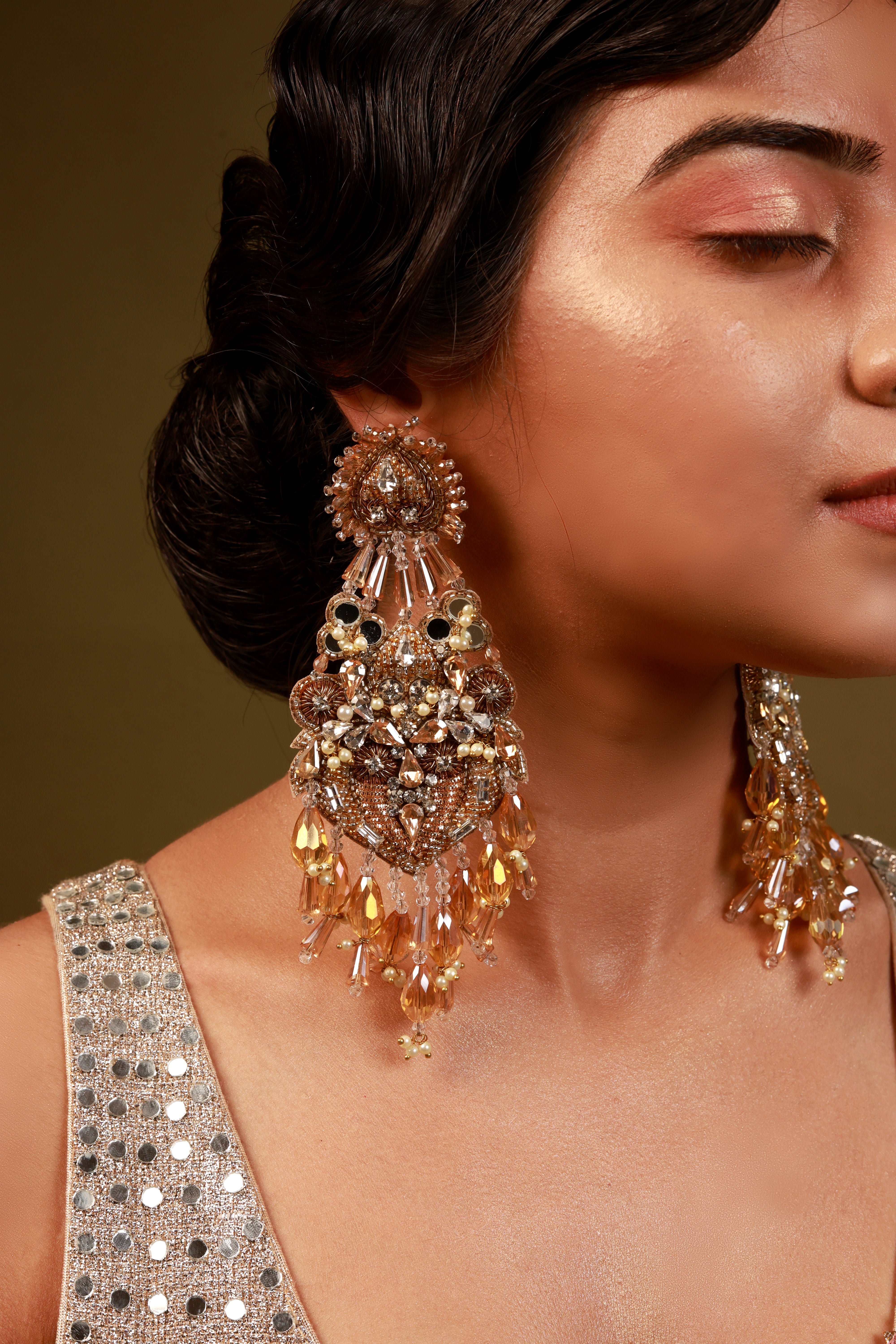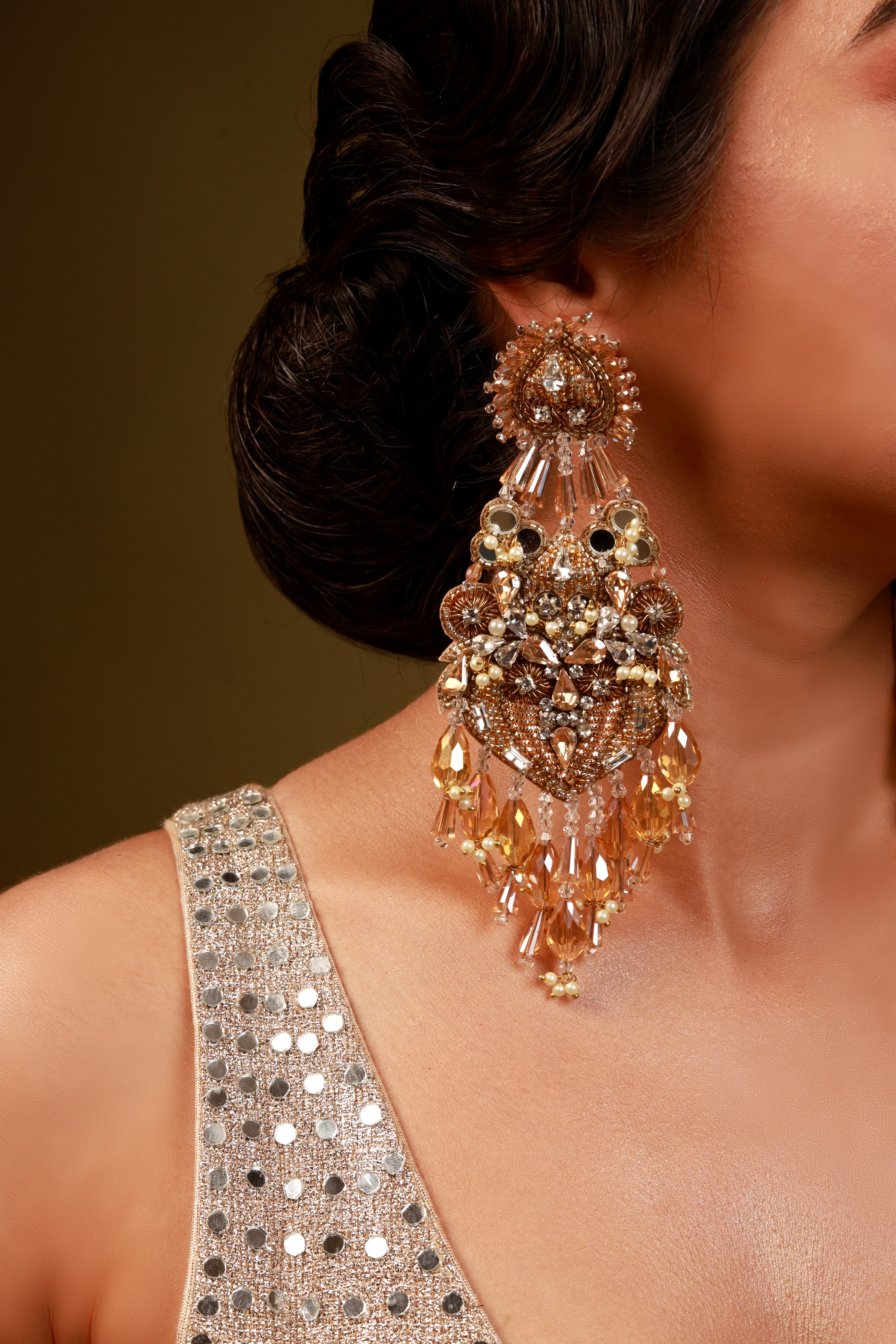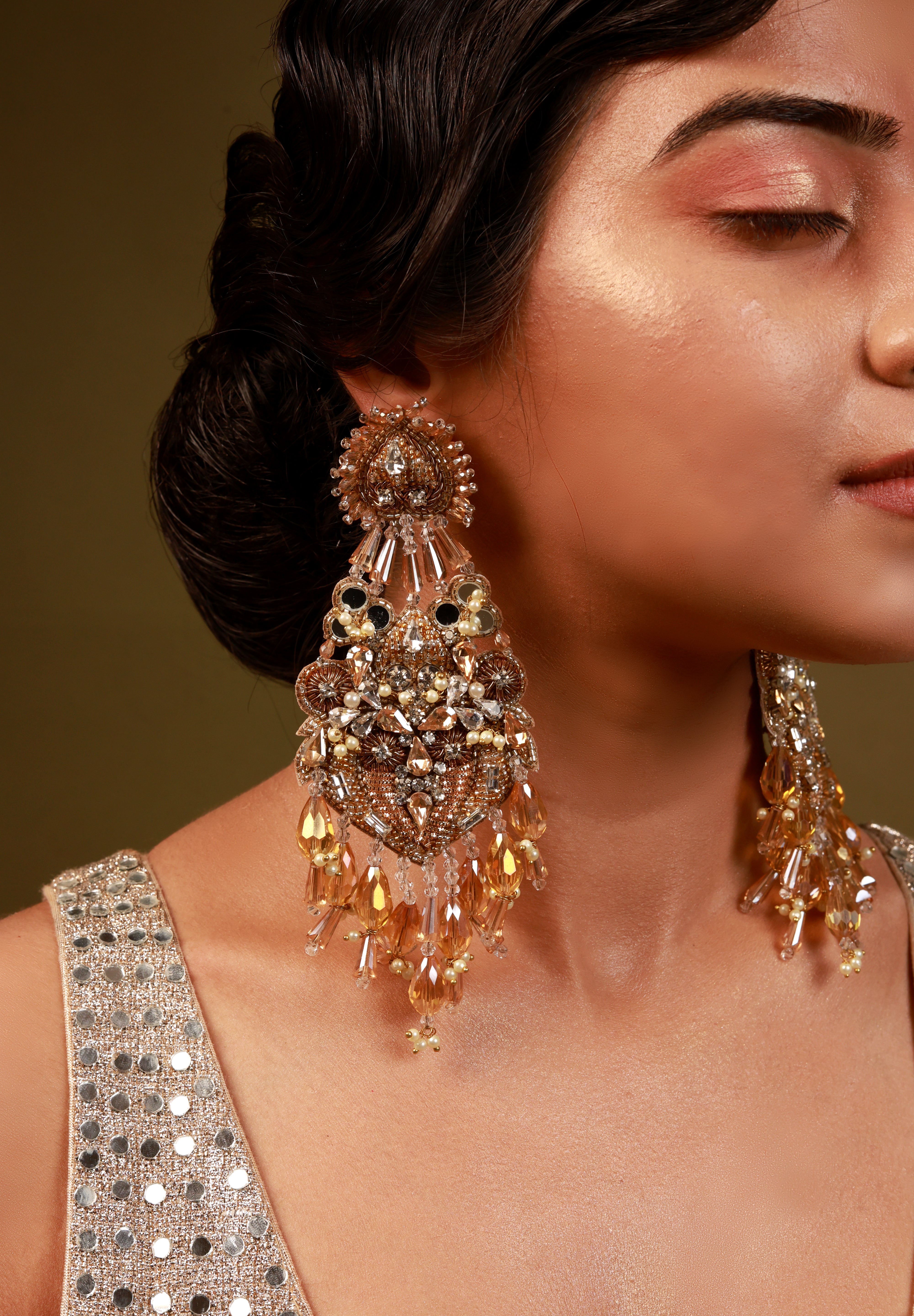 Featuring Dilbagh Rani danglers- Radiating regal charm, these handcrafted statement chandbali earrings are intricately detailed with zardozi embroidery, golden beads, crystals, and mirror accents. Each layer is meticulously handwoven with glimmering threads and drop beads in soft amber tones, creating a luxurious cascade of sparkle and movement. A perfect fusion of traditional artistry and modern elegance — ideal for brides, festive occasions, or anyone looking to make a striking statement with timeless Indian craftsmanship.