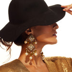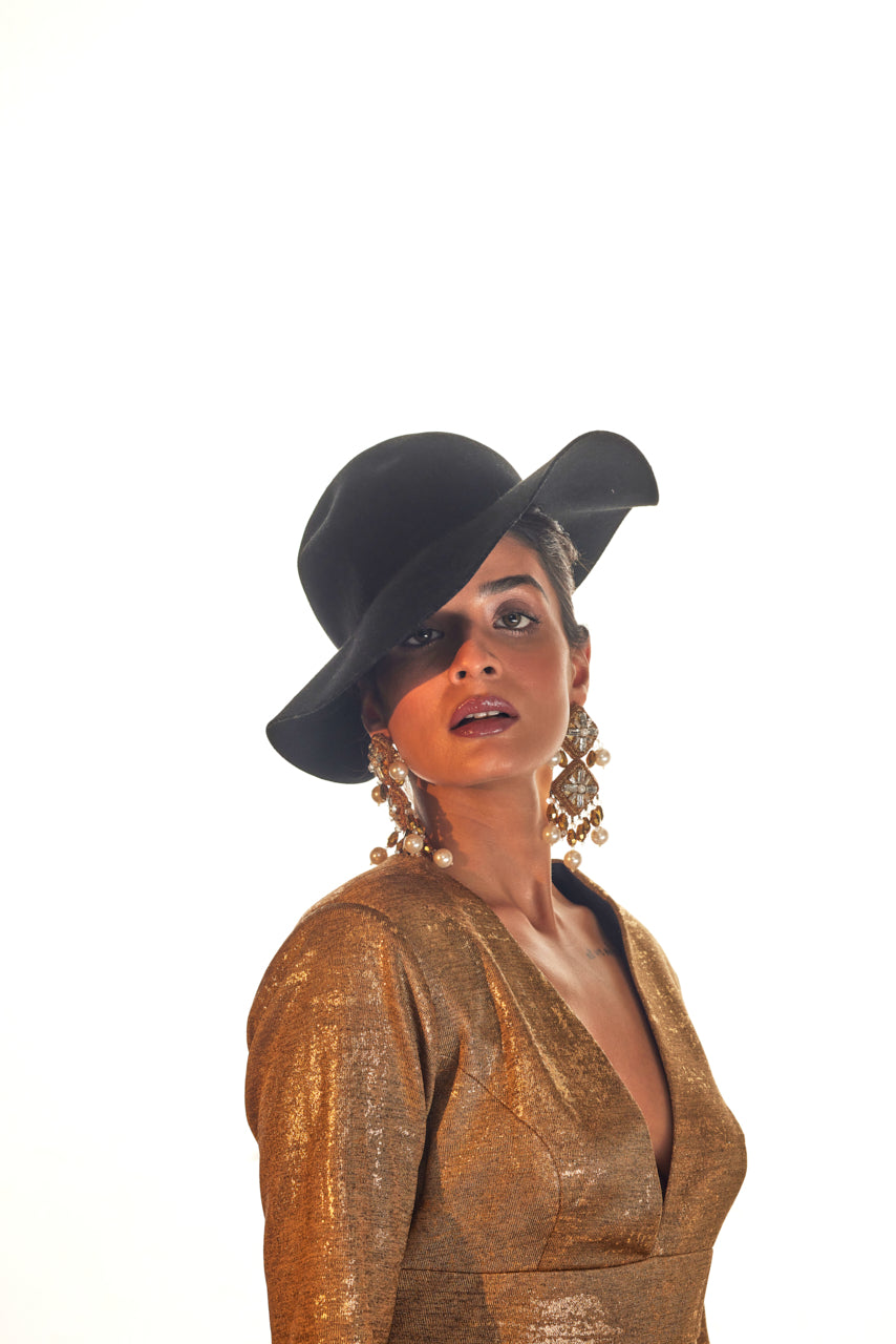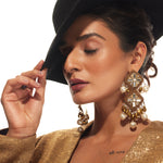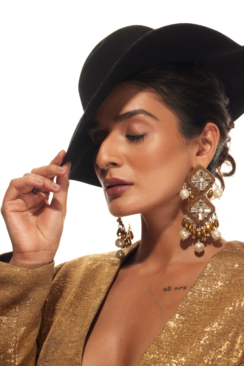 Ella Copper Danglers are high-quality lustrous metallic embroidery with high doze of baguette crytalls and fresh pearls with crystals are attached at the bottom to finish to look each piece is so finely handcrafted with metallic wires .
