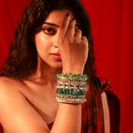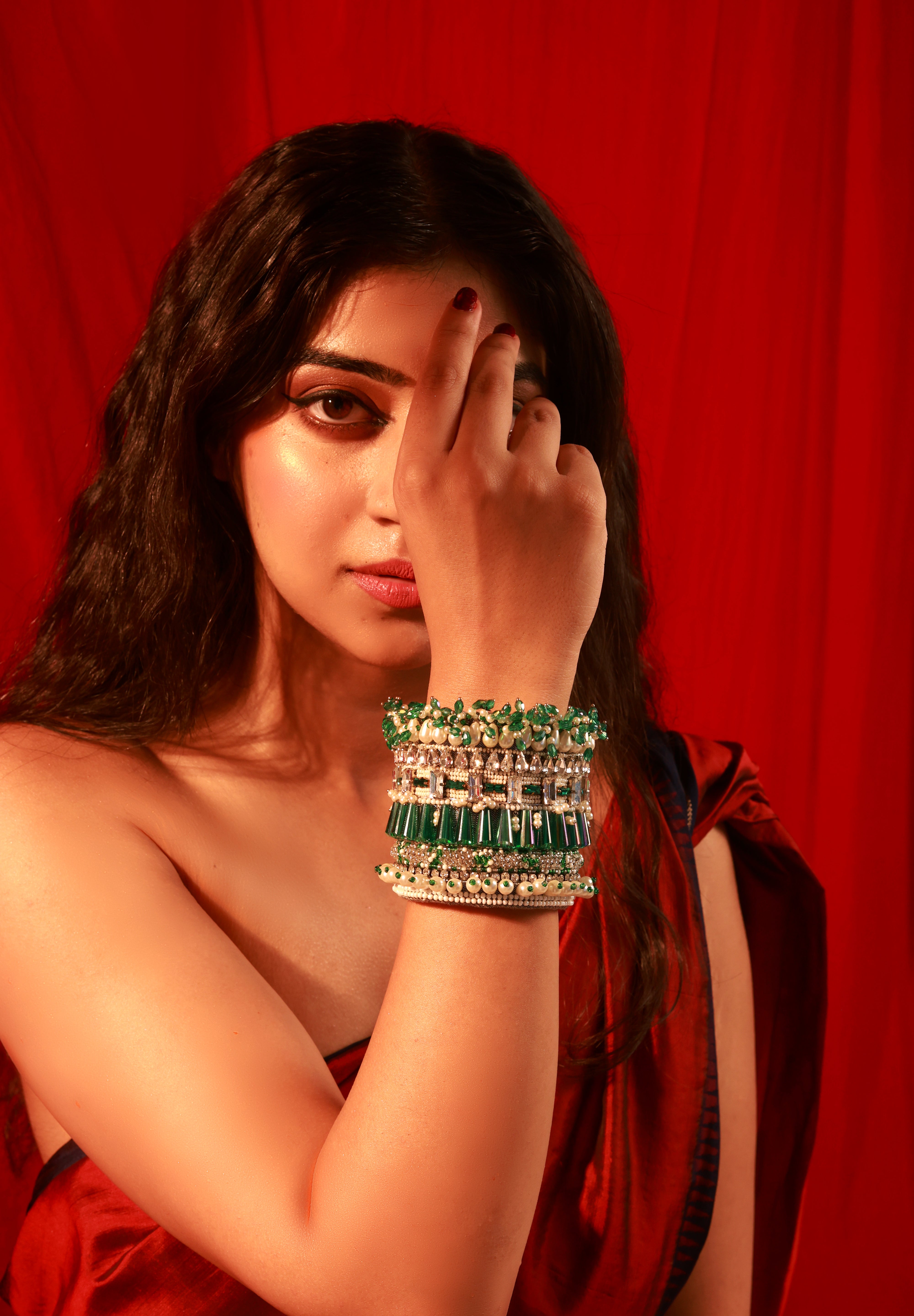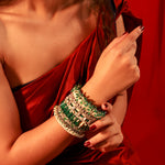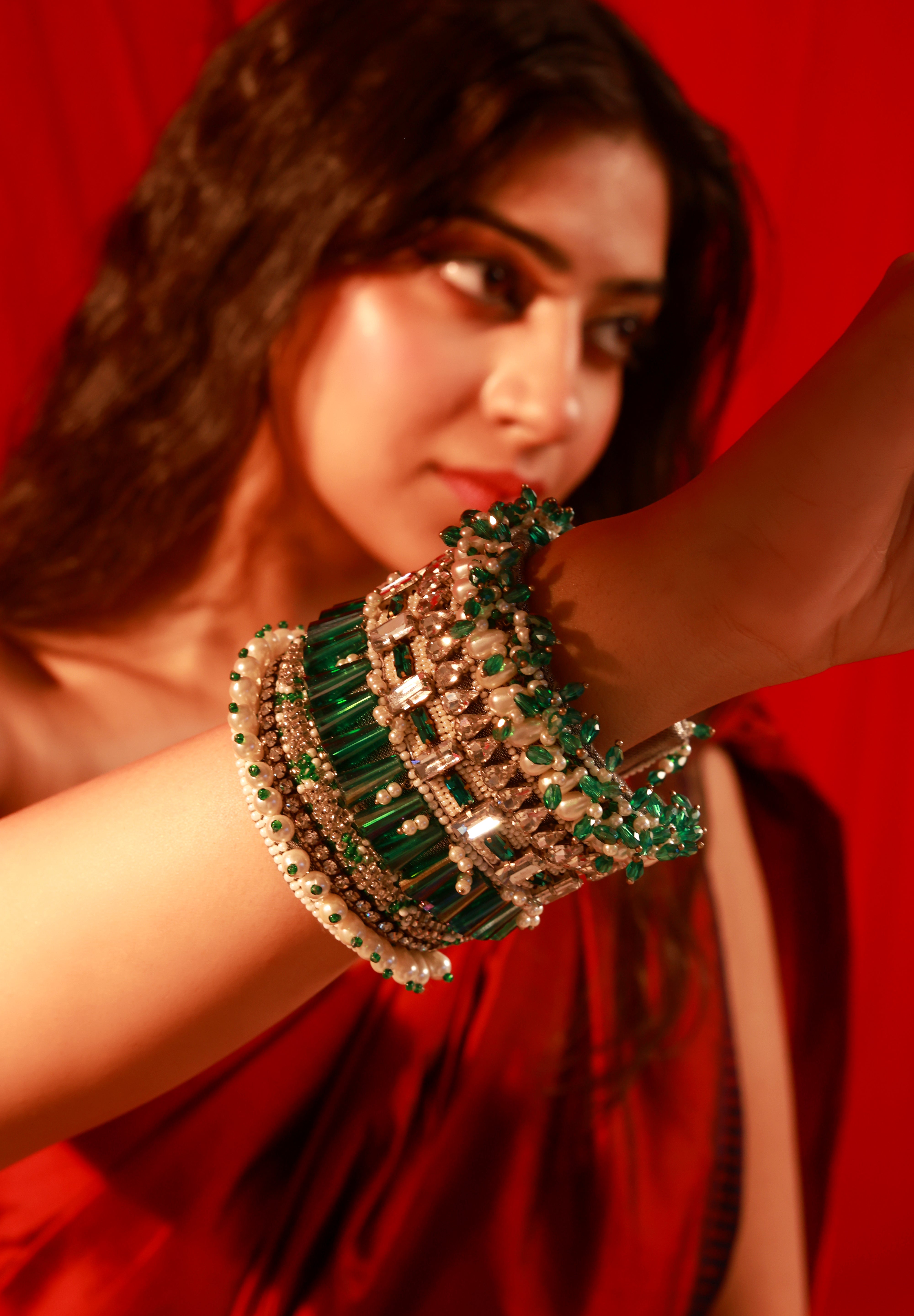 A statement masterpiece that embodies grandeur and elegance. Handcrafted with precision, this handcuff features a striking blend of deep emerald baguette stones, lustrous pearls, and shimmering crystal embellishments. Each layer is intricately designed to create a regal harmony of color and texture, making it the perfect accessory for weddings, festive occasions, or evening celebrations.