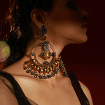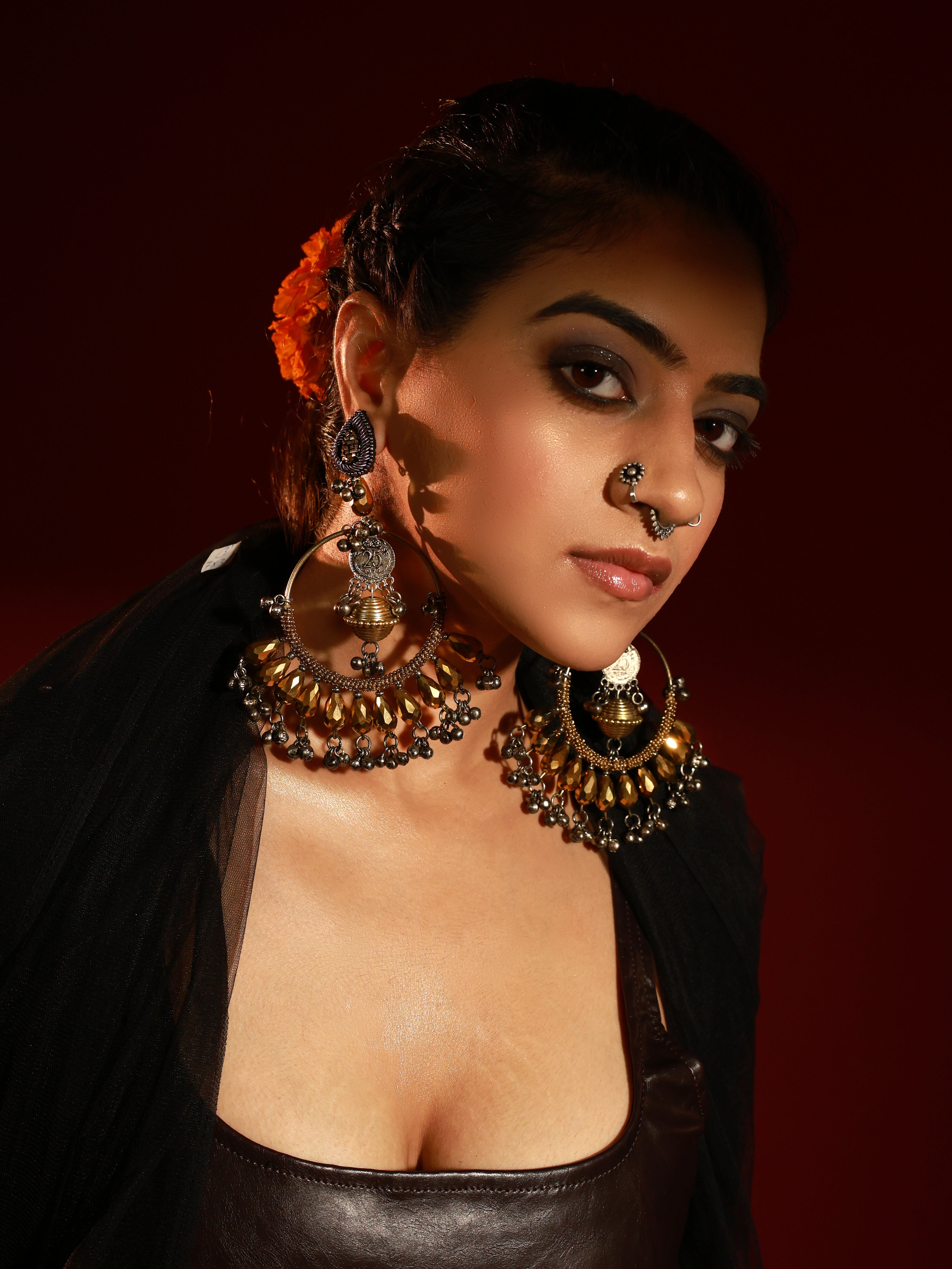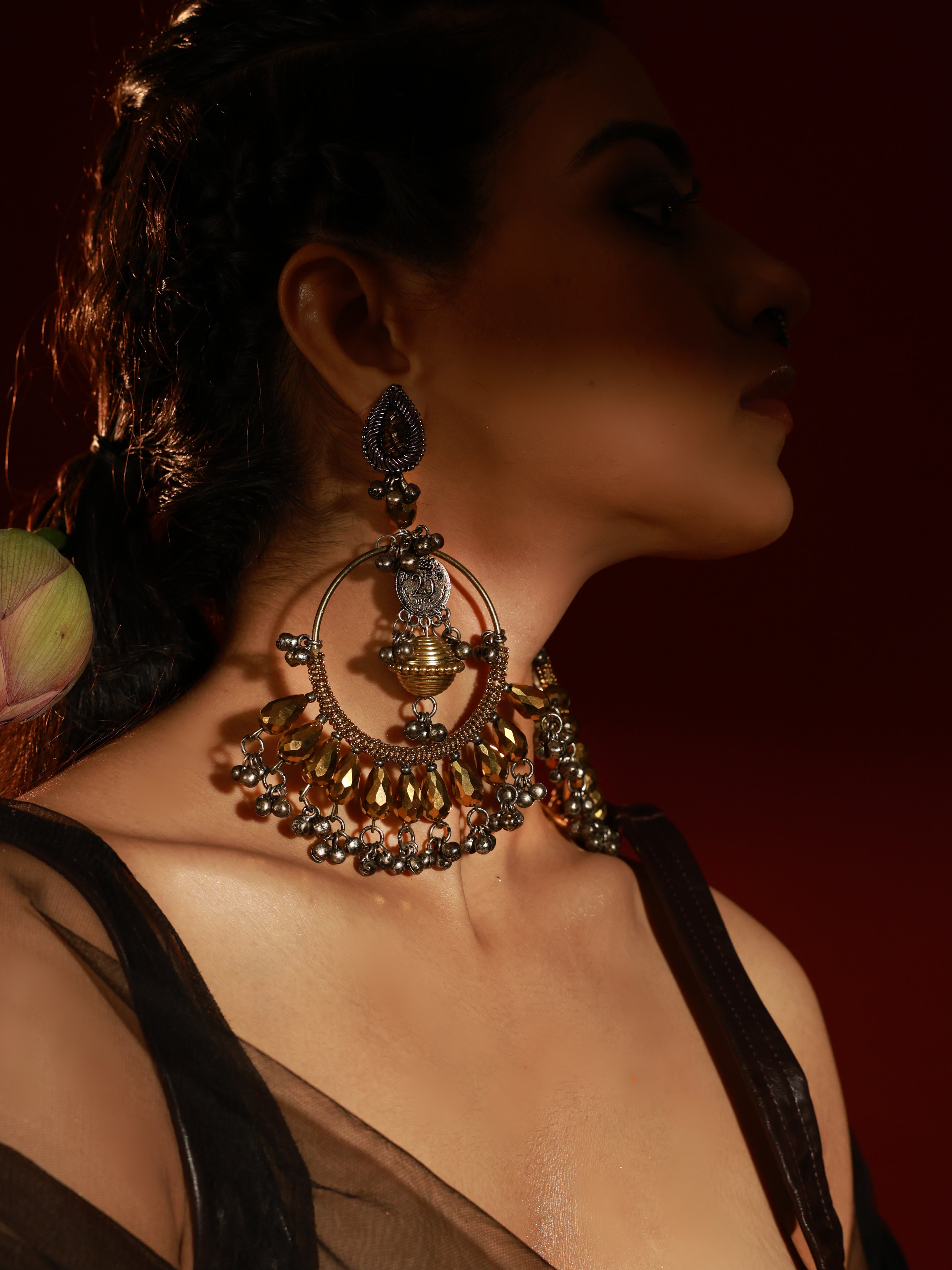Golden crescent earrings are handcrafted on metal base which is Inspired by the bohemian elements , metal embellishments , gold lustrous metallic crystals at the bottom with complementing Antique Ghungroos which makes it different - heavy and statement earrings for any occasion .