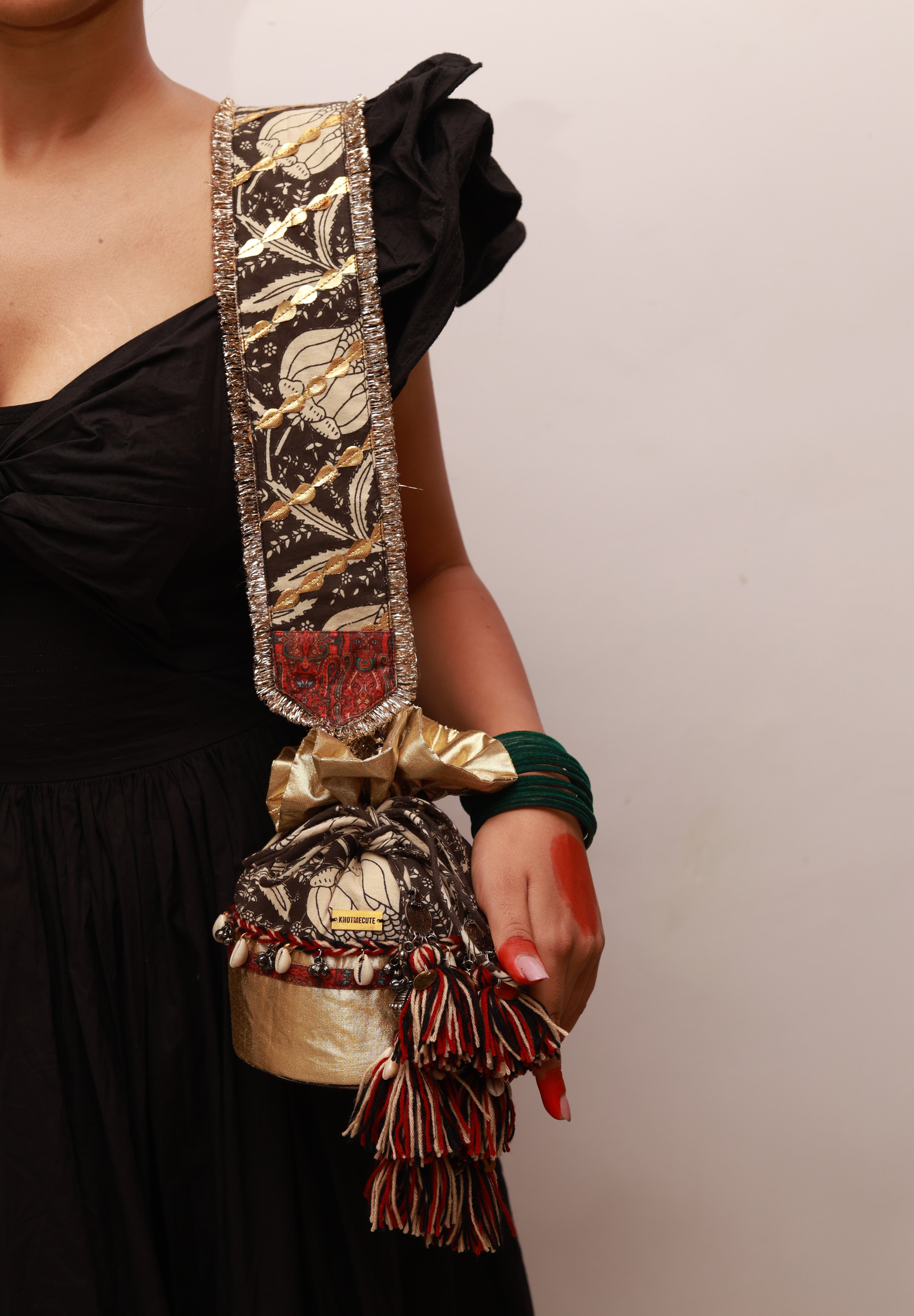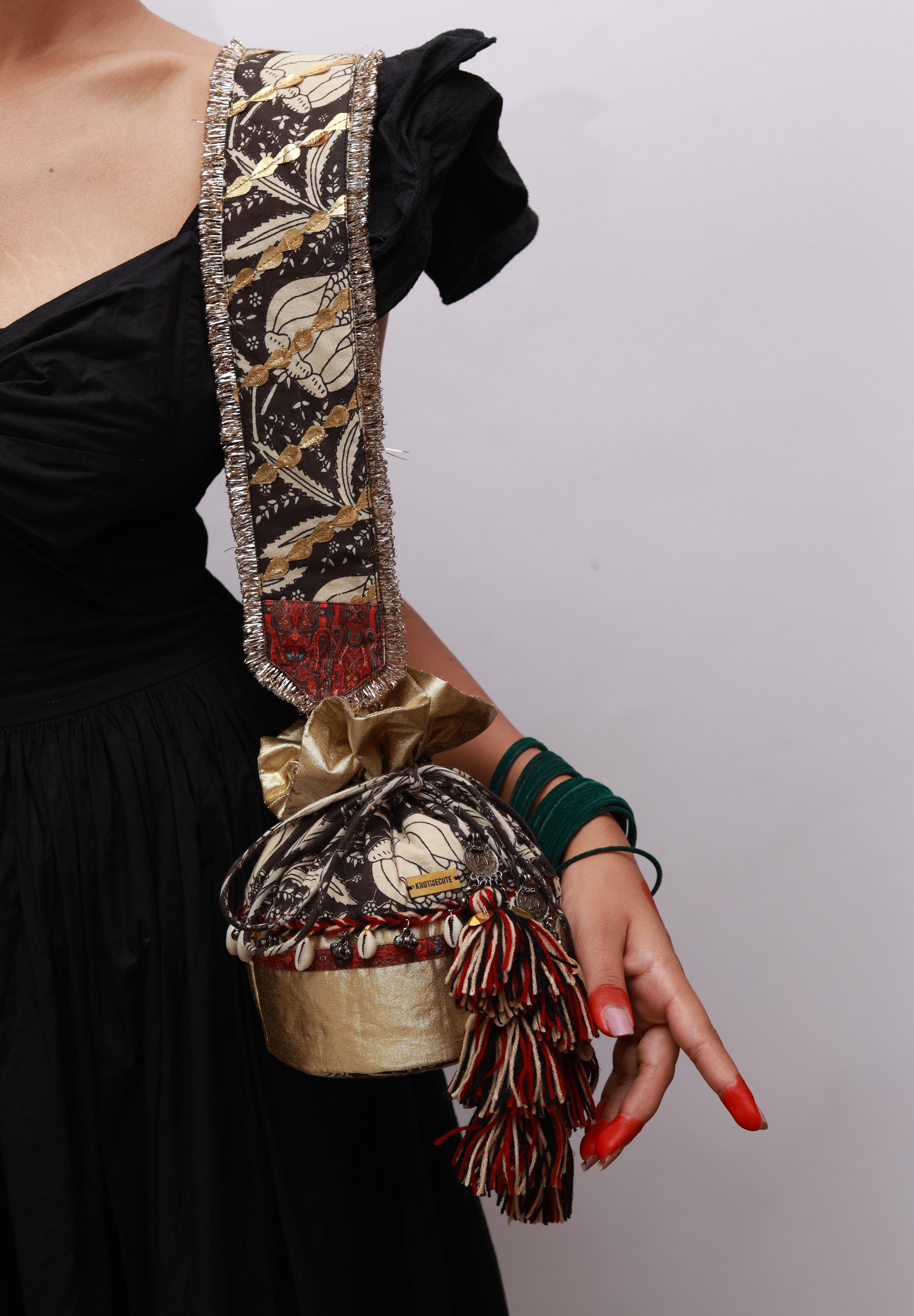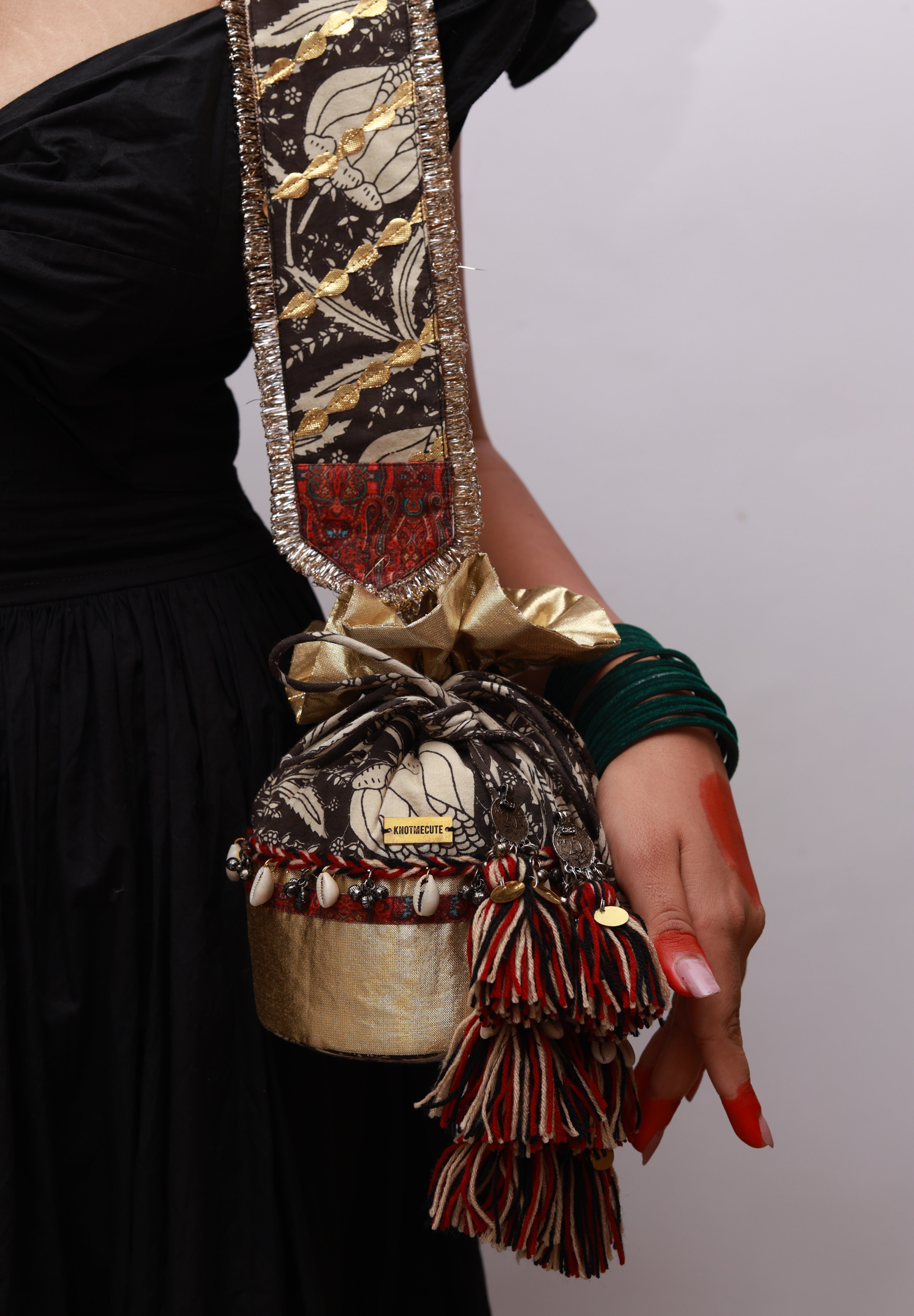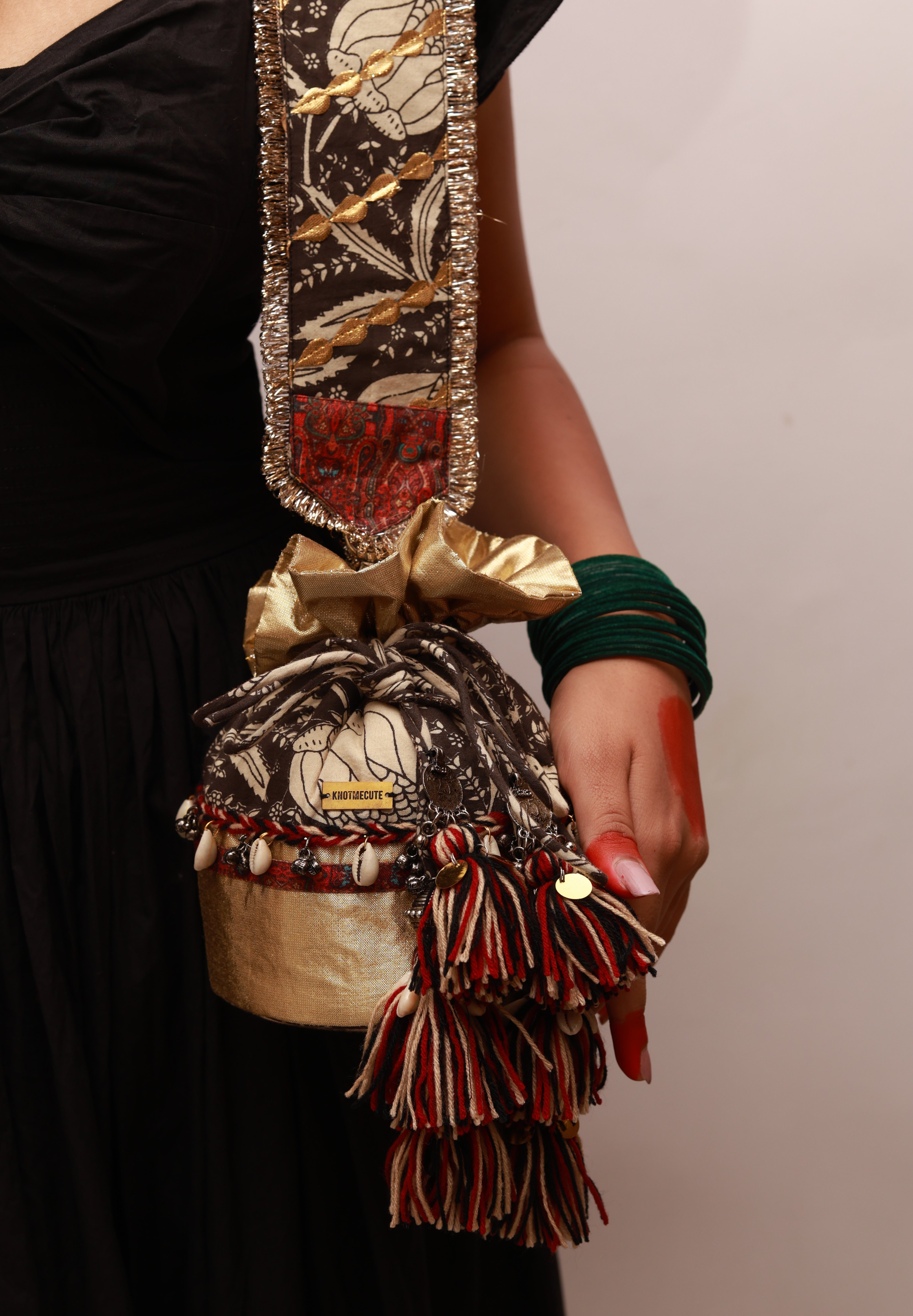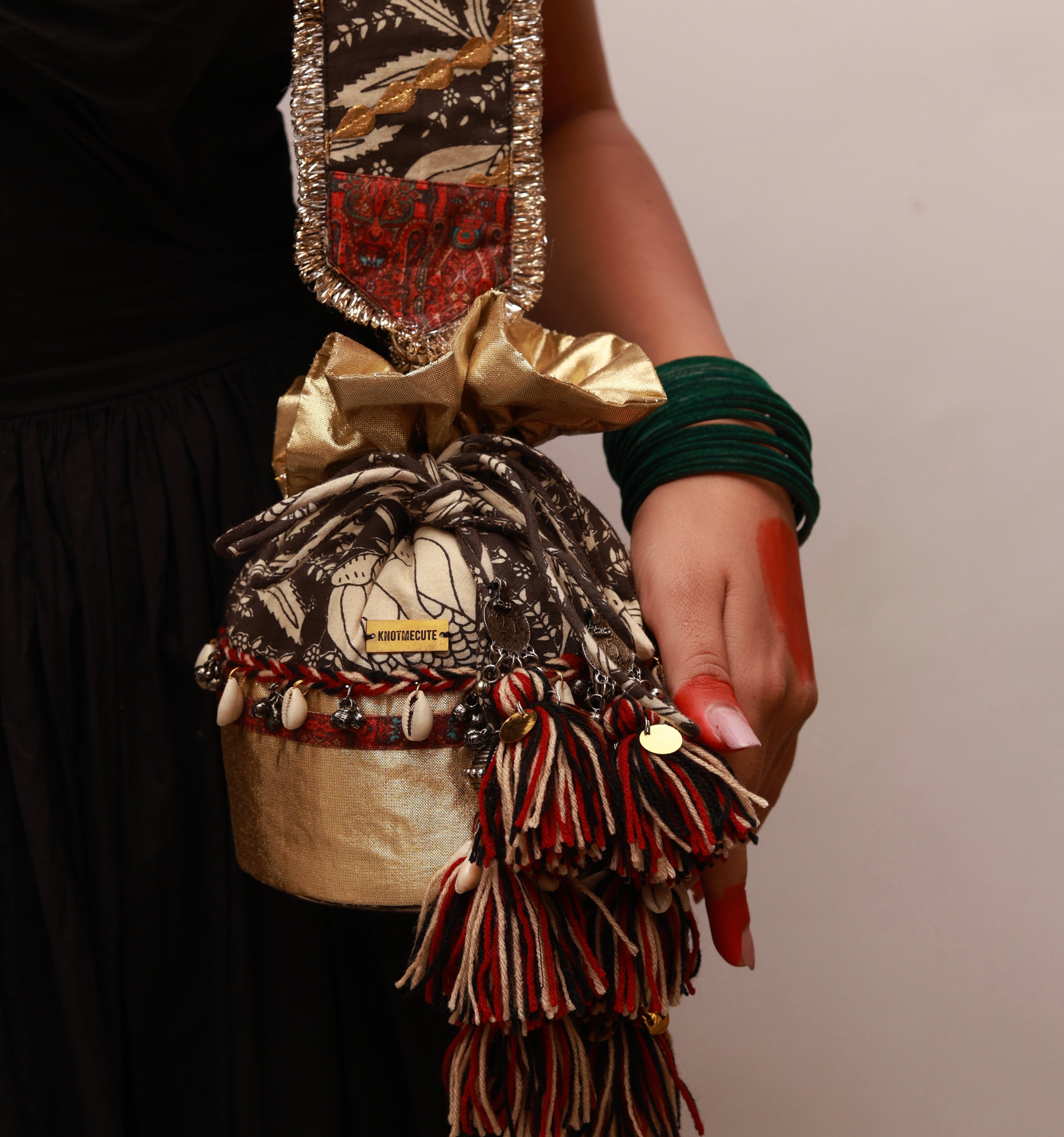 The Gulab jamun Potli bag beautifully blends traditional Indian artistry with modern design. Its vibrant hue, adorned with intricate gold work, captures the essence of Indian sweets. The brown shade with contrasting tassels and charming shells add a playful touch, while the ghungroos provide an elegant flair. Perfect for the festive and wedding season, this spacious potli bag allows you to keep your essentials handy while keeping your hands free. The stylish side sling adds a graceful finish, and the colorful wool tassels paired with metallic charms complete this stunning accessory. Elevate your festive look with this unique blend of tradition and contemporary fashion!