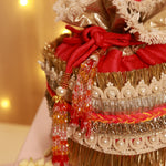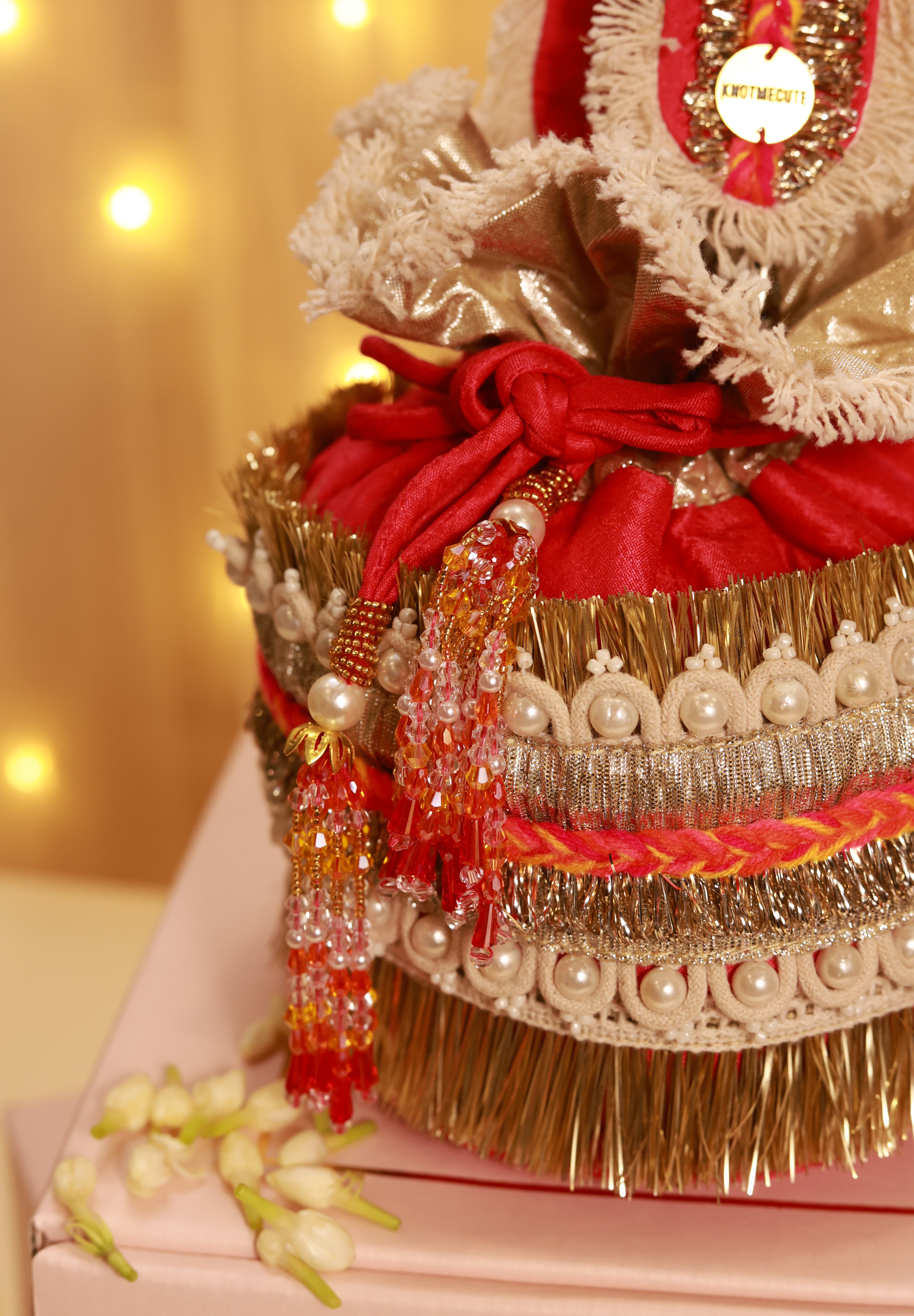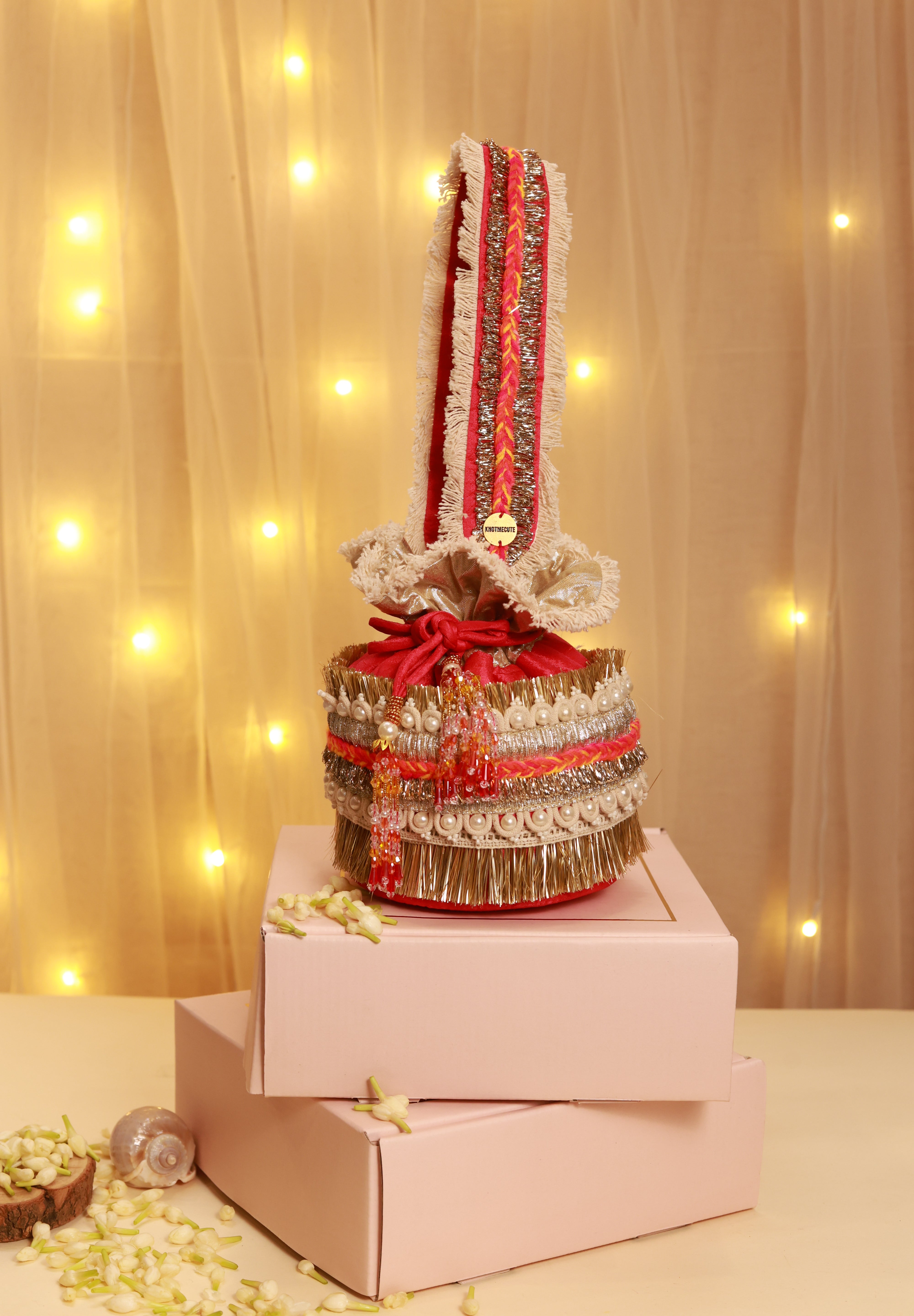 From the renowned House of Knotmecute, the potli bag is designed with a touch of glamour, highlighted by crystals adorning the bottom of the drawstrings. This makes it not only a practical choice but also a stunning addition to any festive outfit. Whether for special occasions or everyday use, the gulabi sandesh Potli Bag is a perfect blend of tradition and contemporary style, intricate gold gotta over hot pink base perfect for wedding season .
