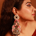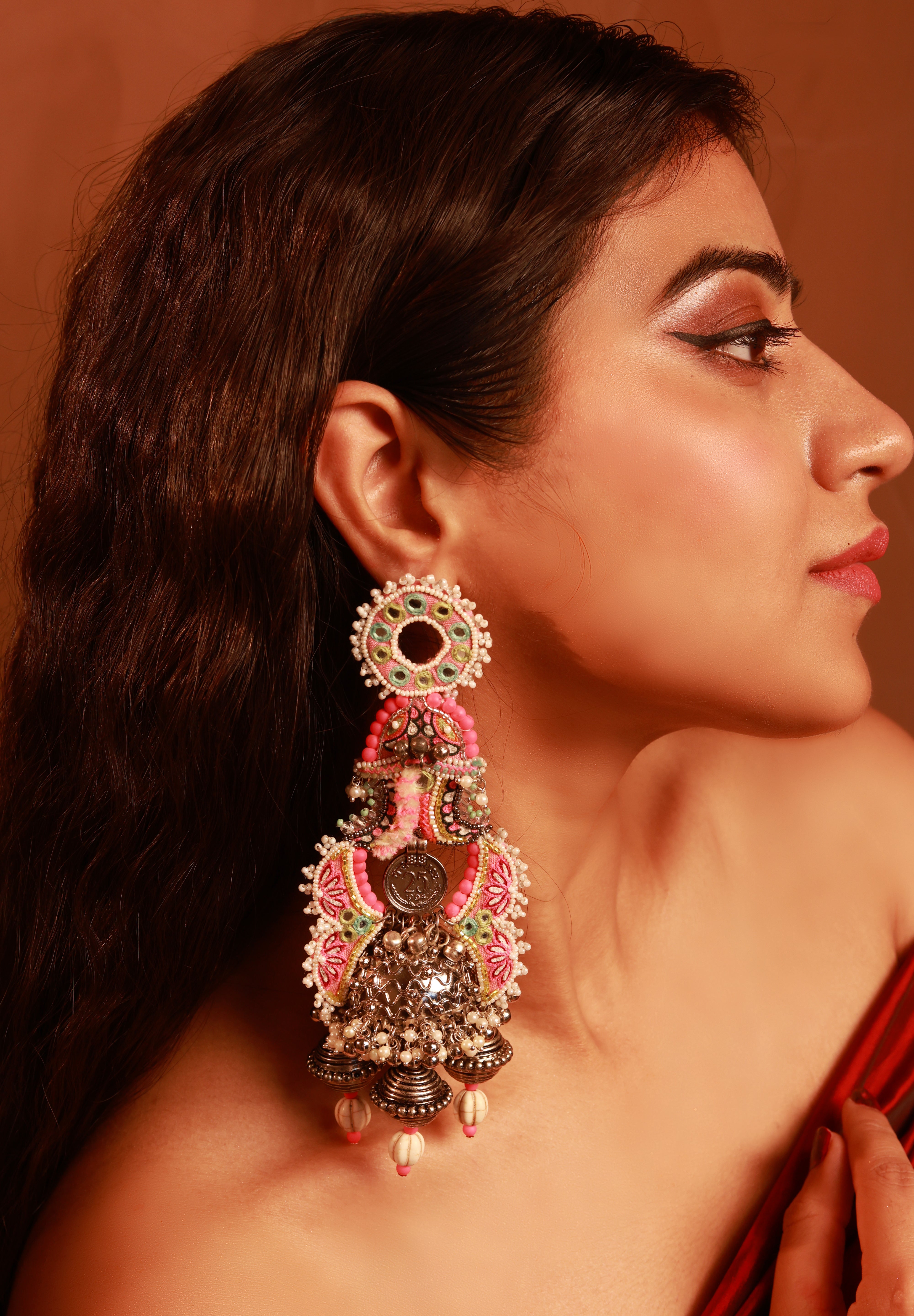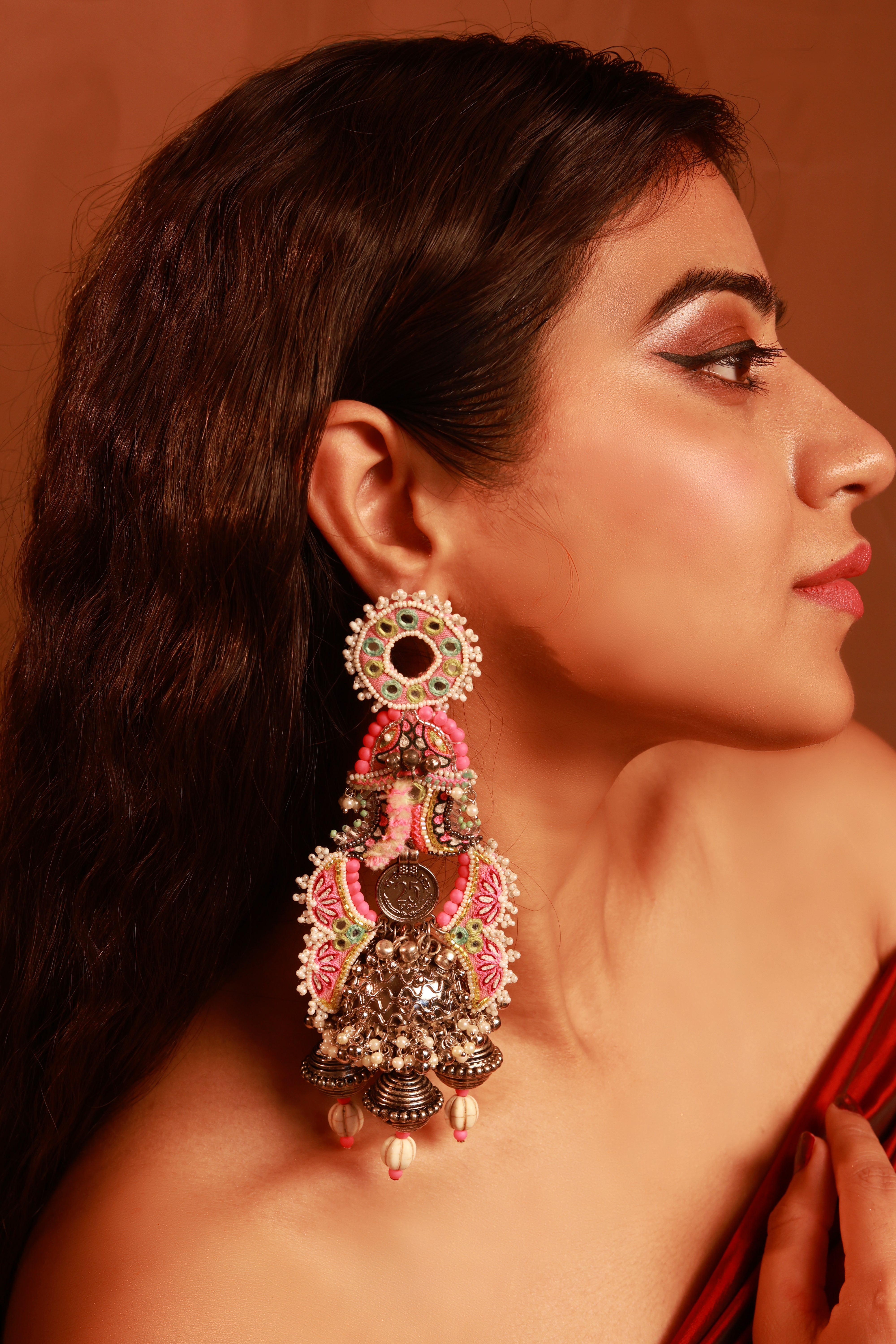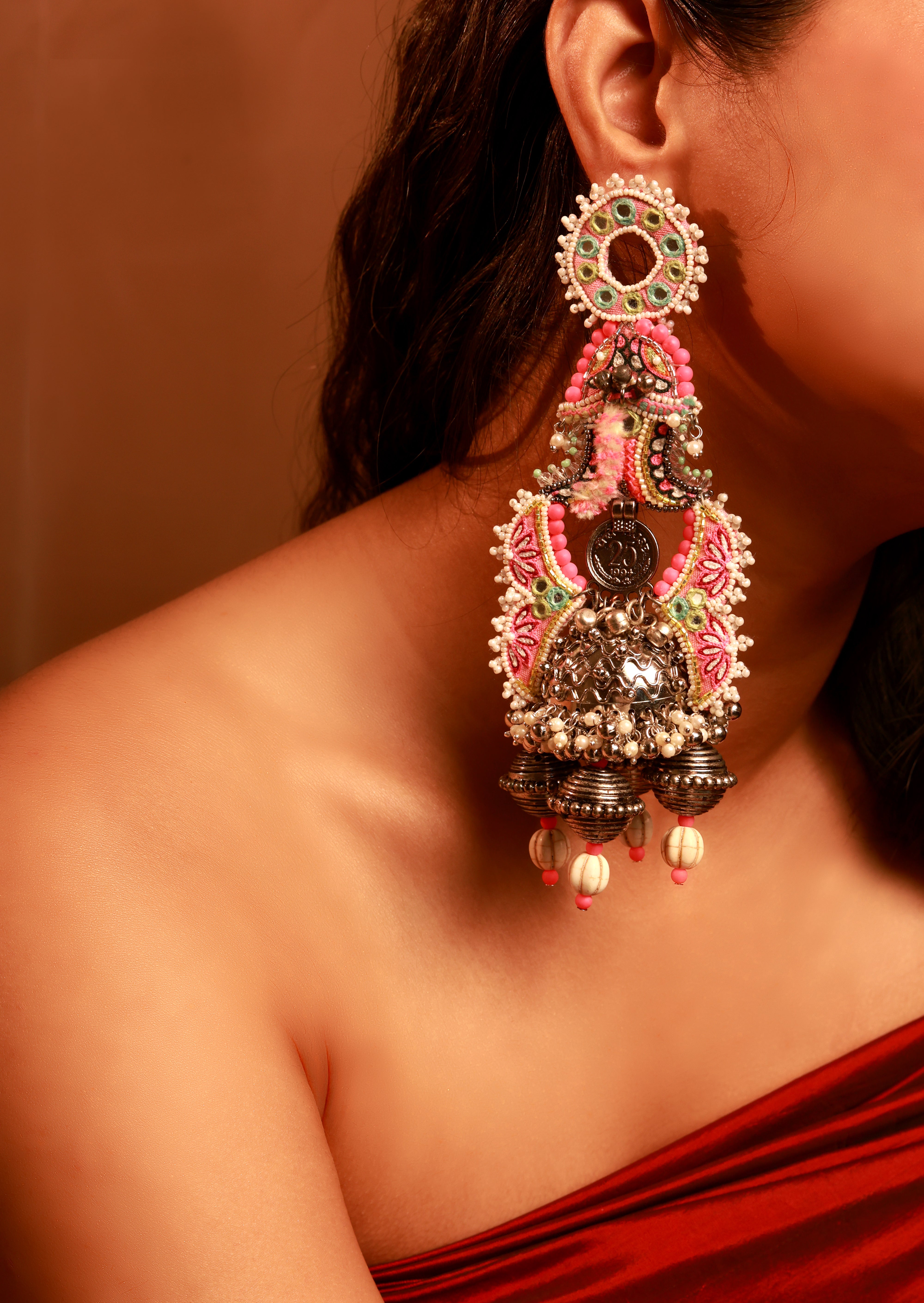 A vibrant blend of tradition and artistry, these handcrafted earrings are designed to captivate. Adorned with intricate thread embroidery, mirror work, metallic charms, and pearl accents, the design brings alive a festive charm with a contemporary twist. The pops of pink and green detailing add freshness, while the cascading silver ghungroos and cowrie shells create movement and drama.Perfect for weddings, sangeet nights, or festive celebrations, these earrings are more than just jewelry—they are a statement of culture, craft, and individuality.