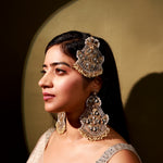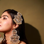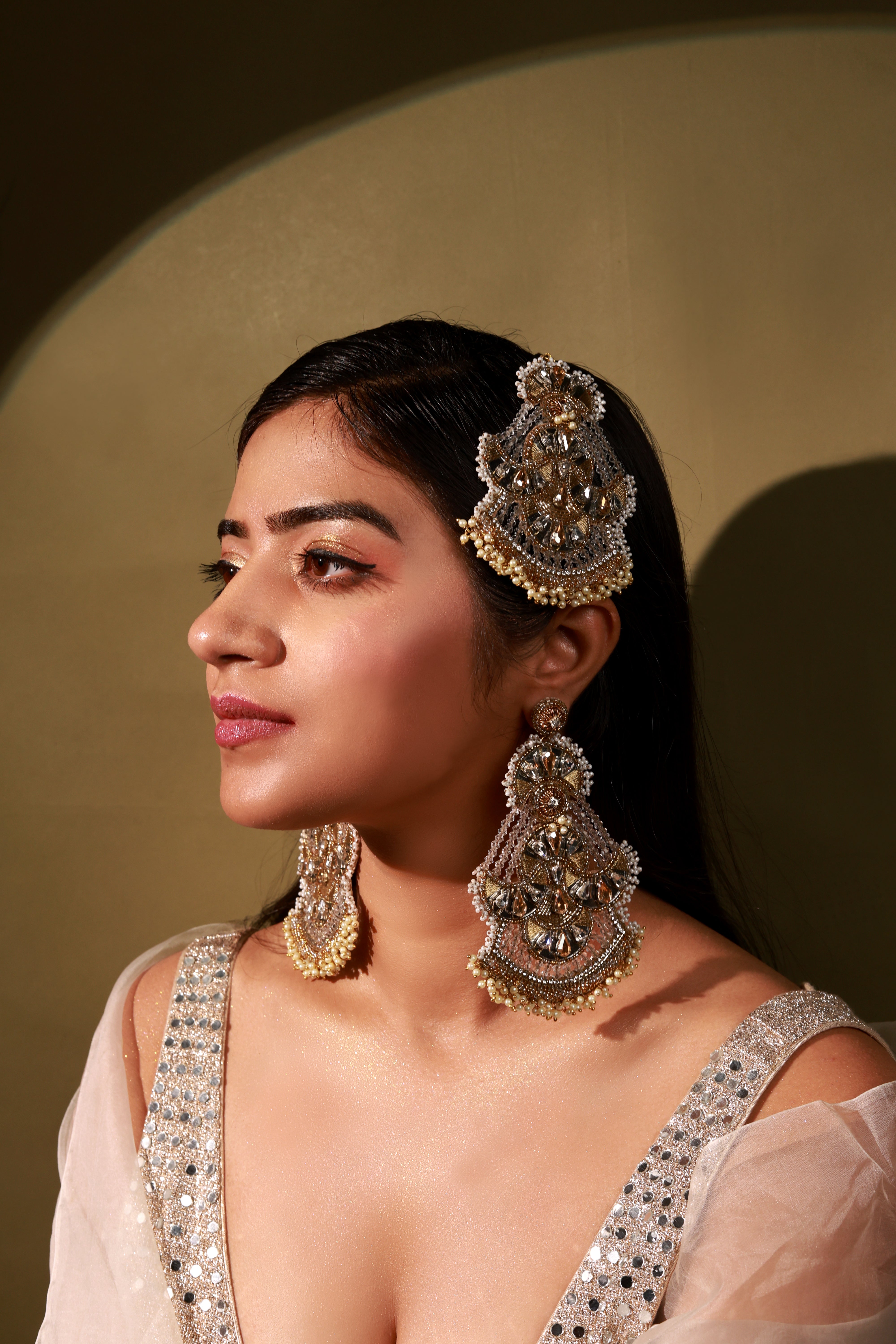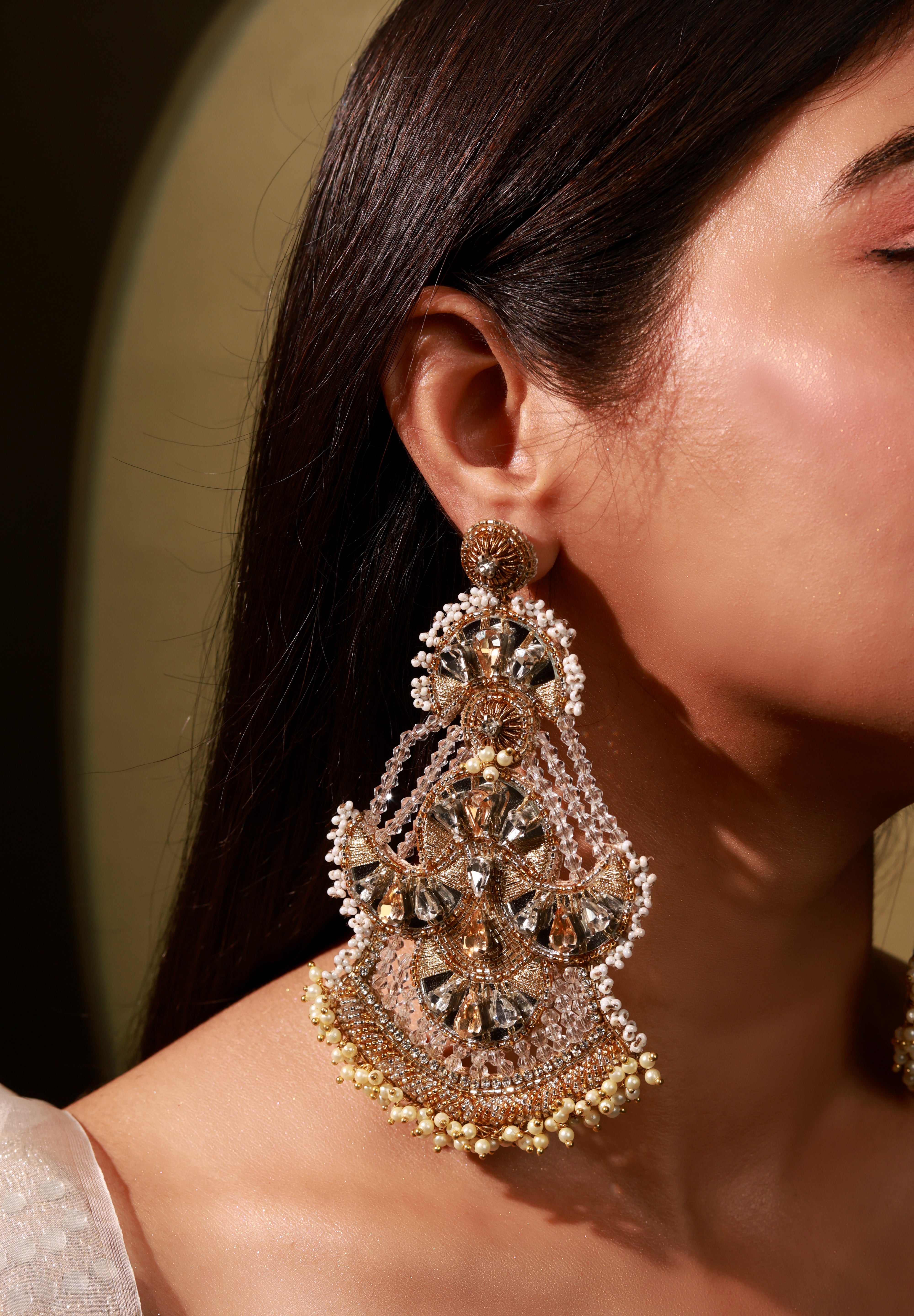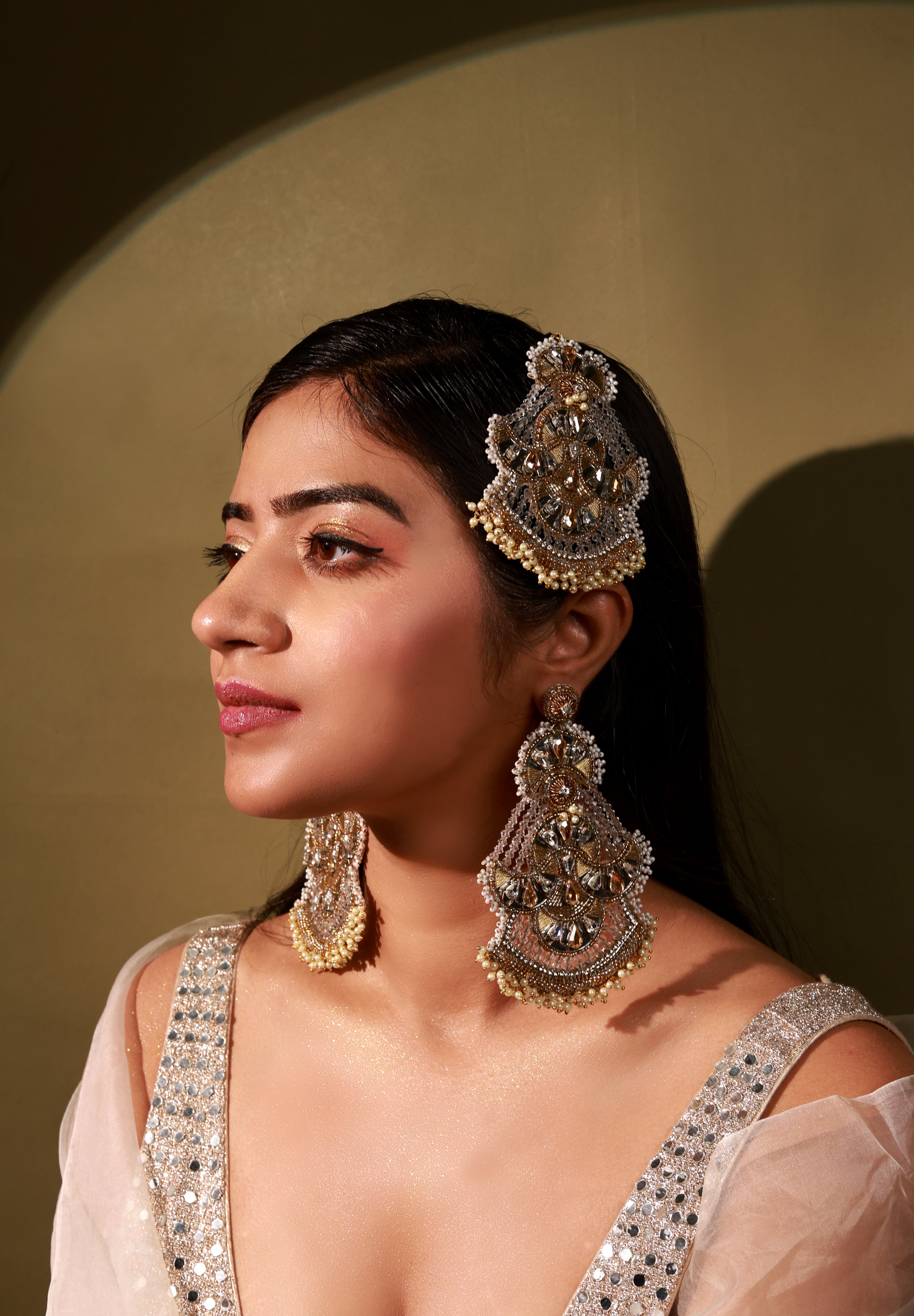 Guman Earrings are handcrafted crescent-moon danglers designed for the wedding season. Slightly oversized yet incredibly lightweight, they feature a unique silhouette embellished with delicate mirrors and pearls. Perfect for brides and festive occasions, they add effortless elegance to every look.