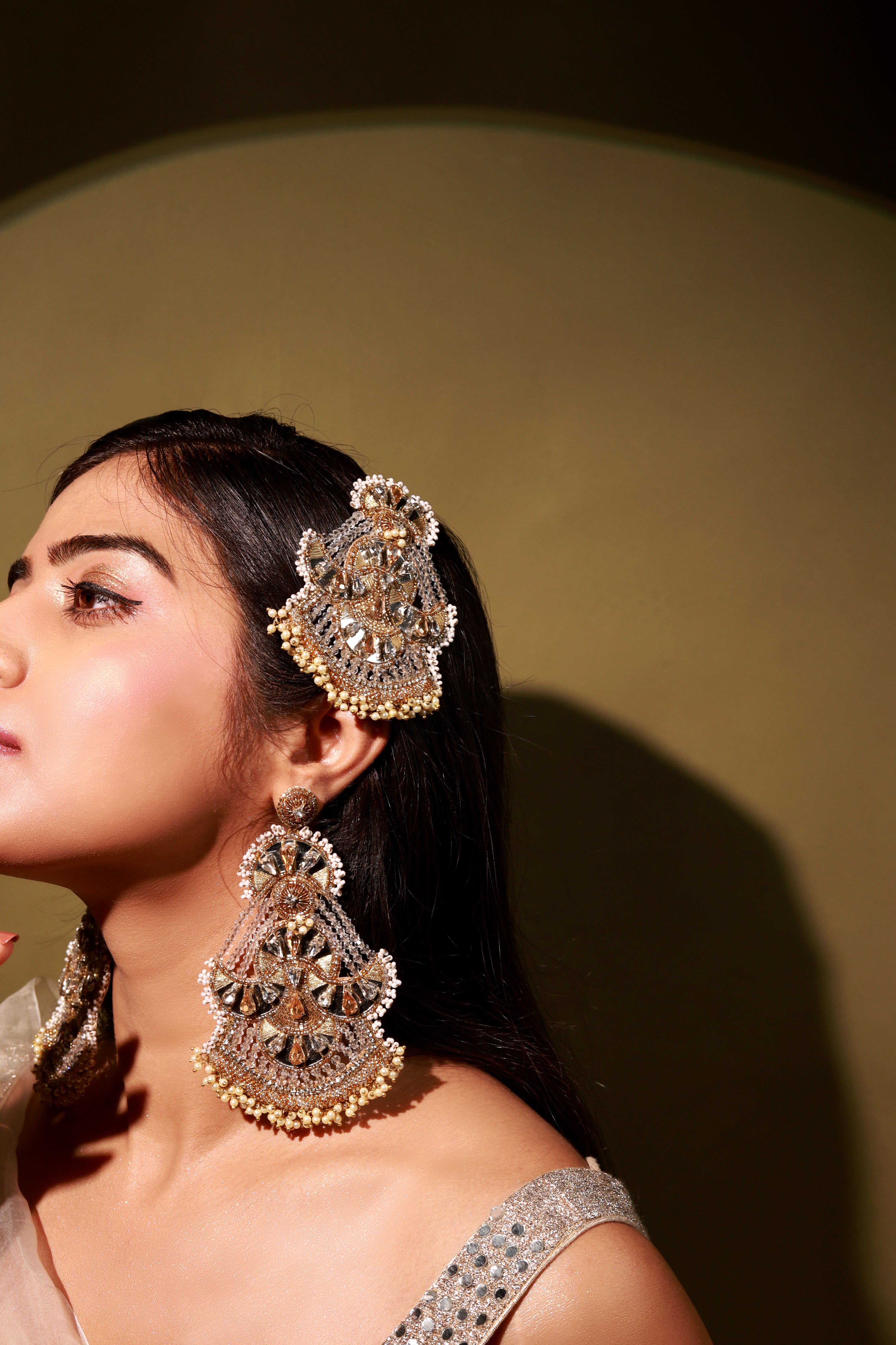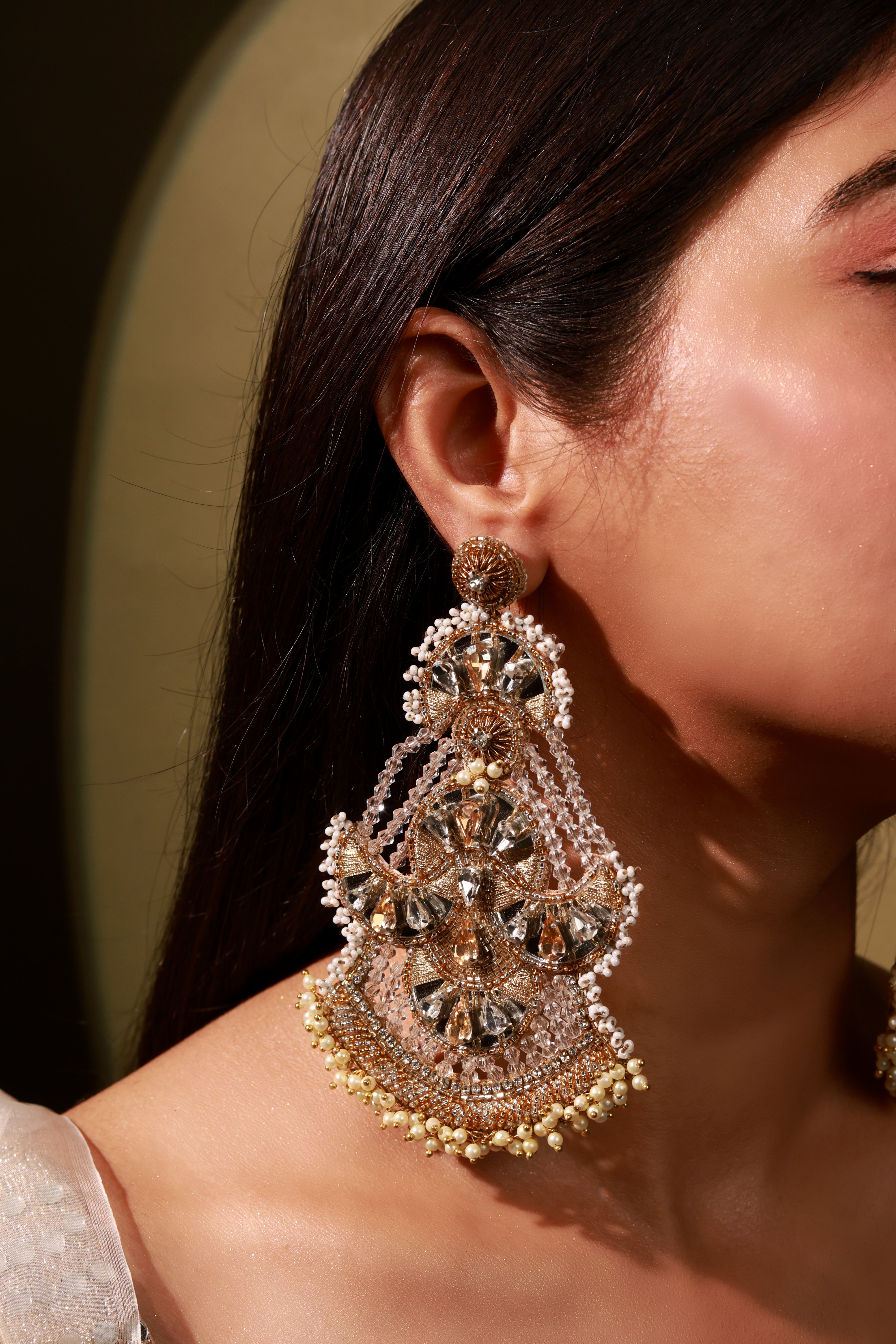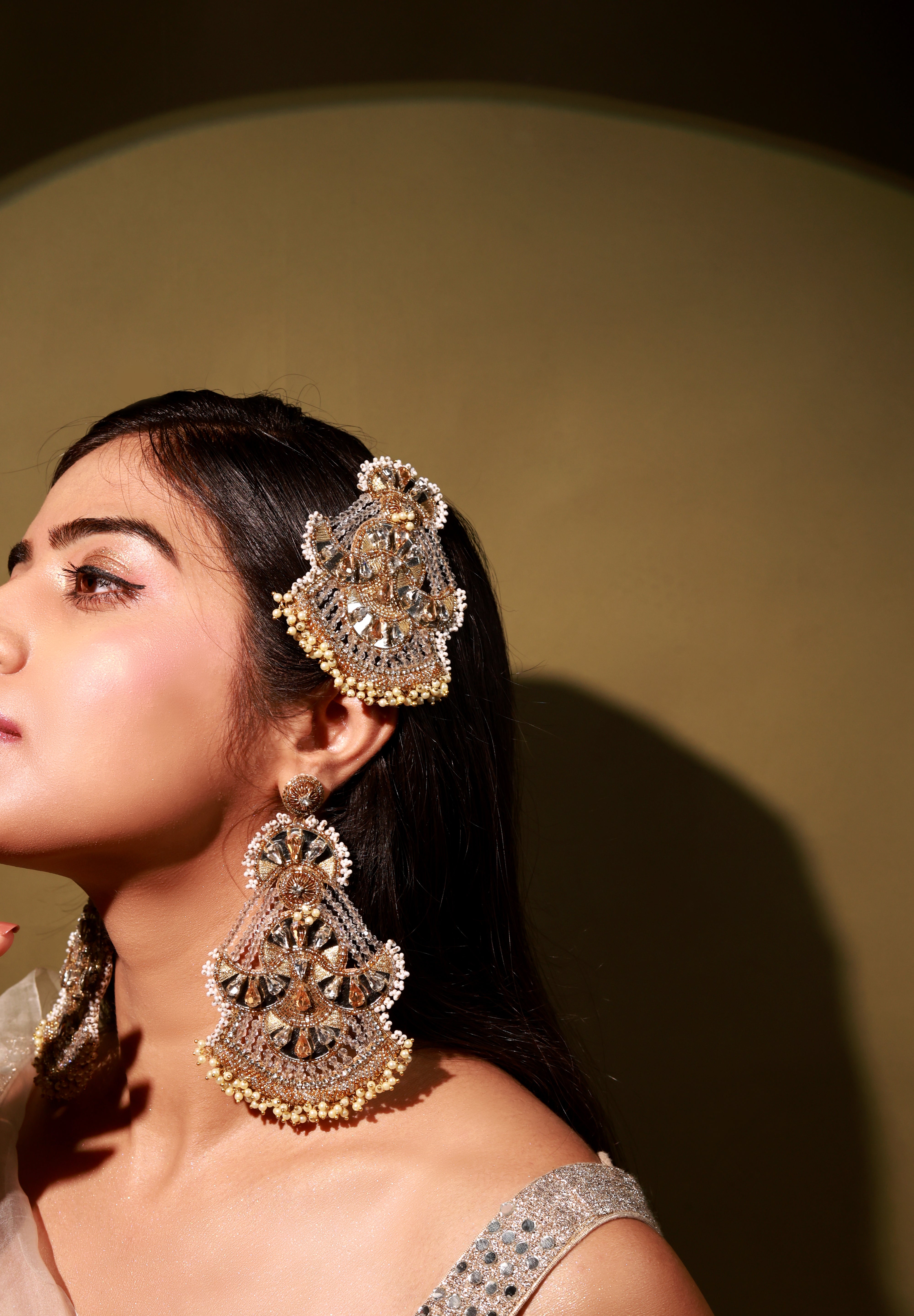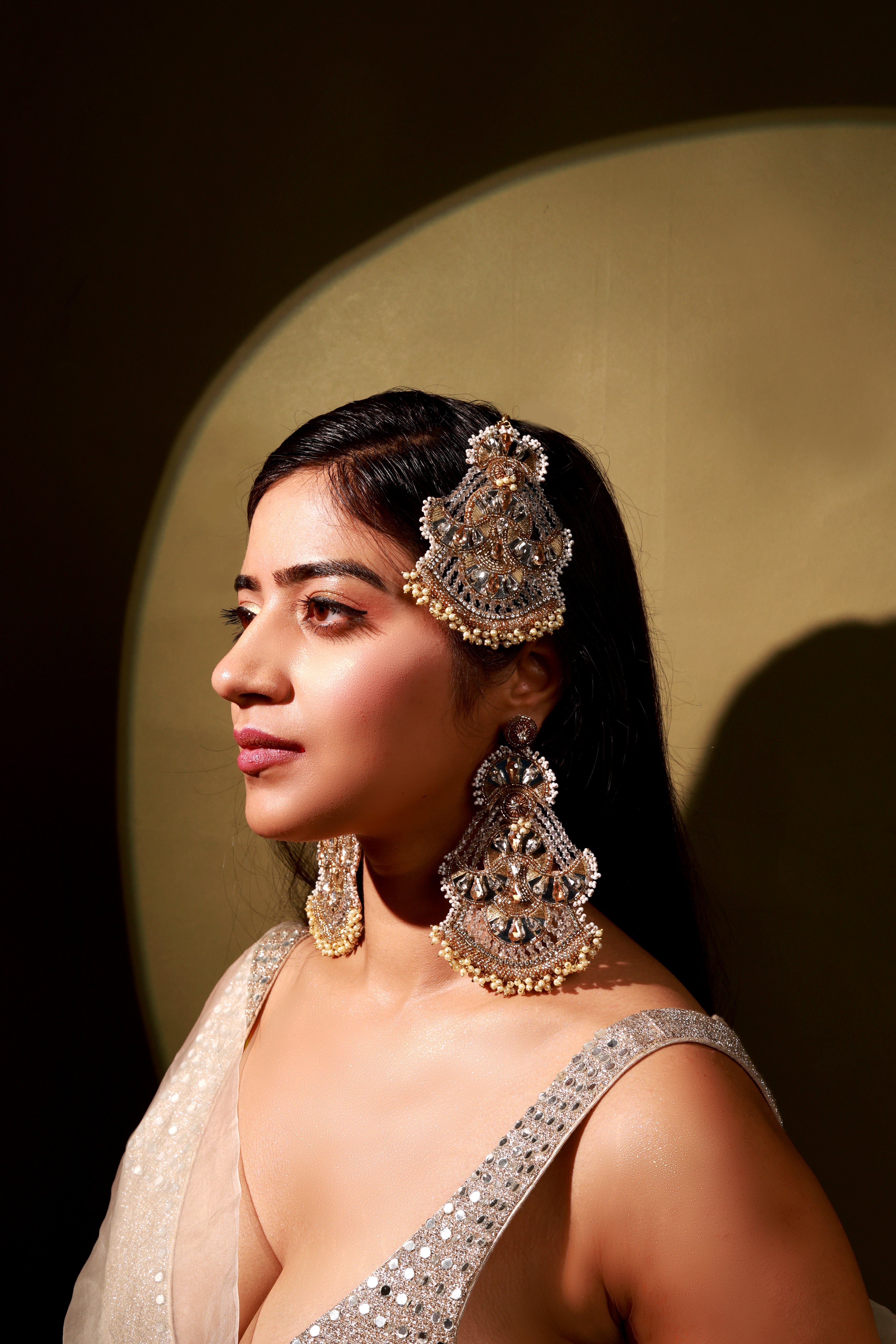 Guman Earrings are handcrafted crescent-moon danglers designed for the wedding season. Slightly oversized yet incredibly lightweight, they feature a unique silhouette embellished with delicate mirrors and pearls. Perfect for brides and festive occasions, they add effortless elegance to every look.