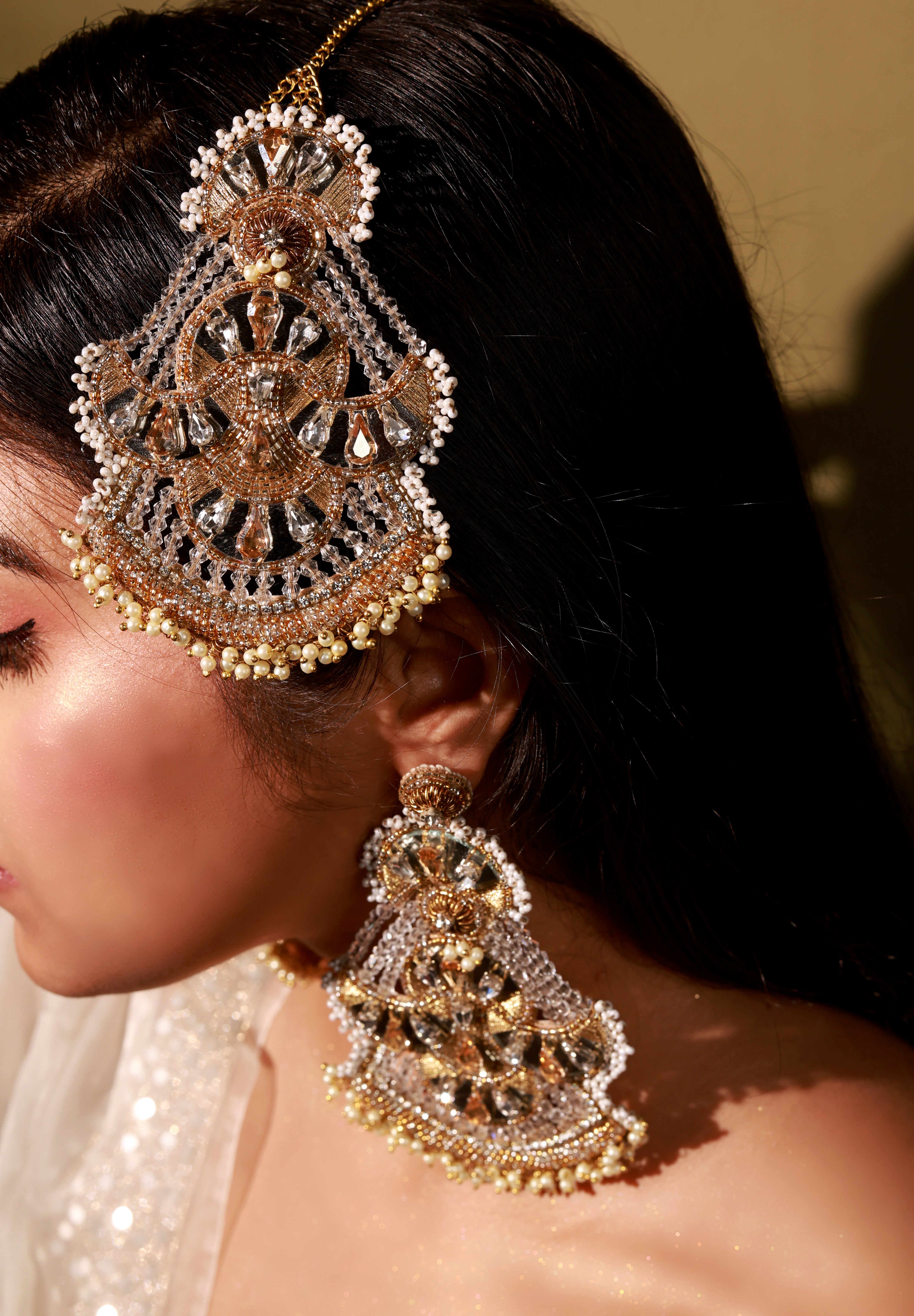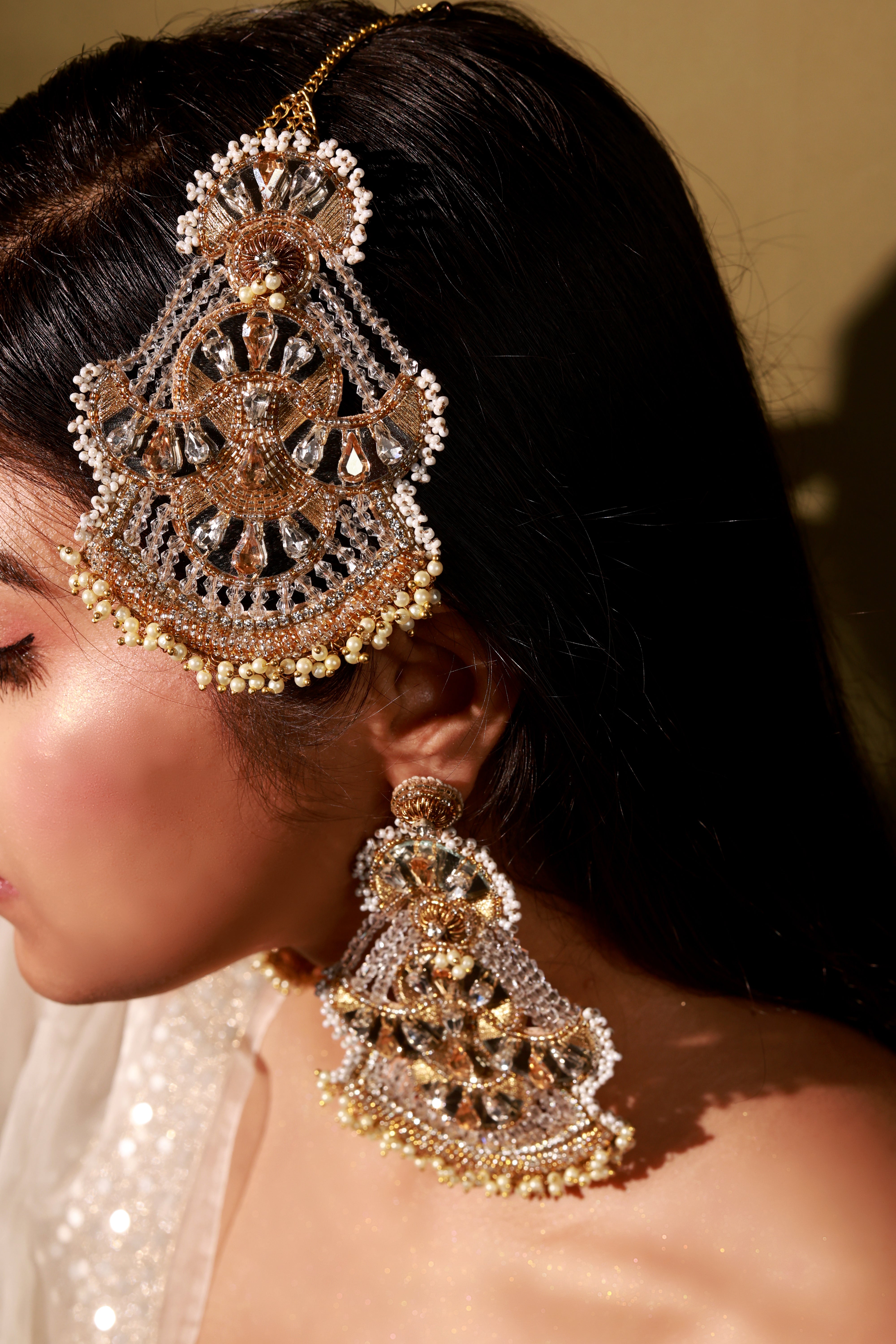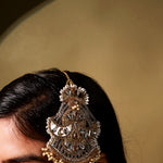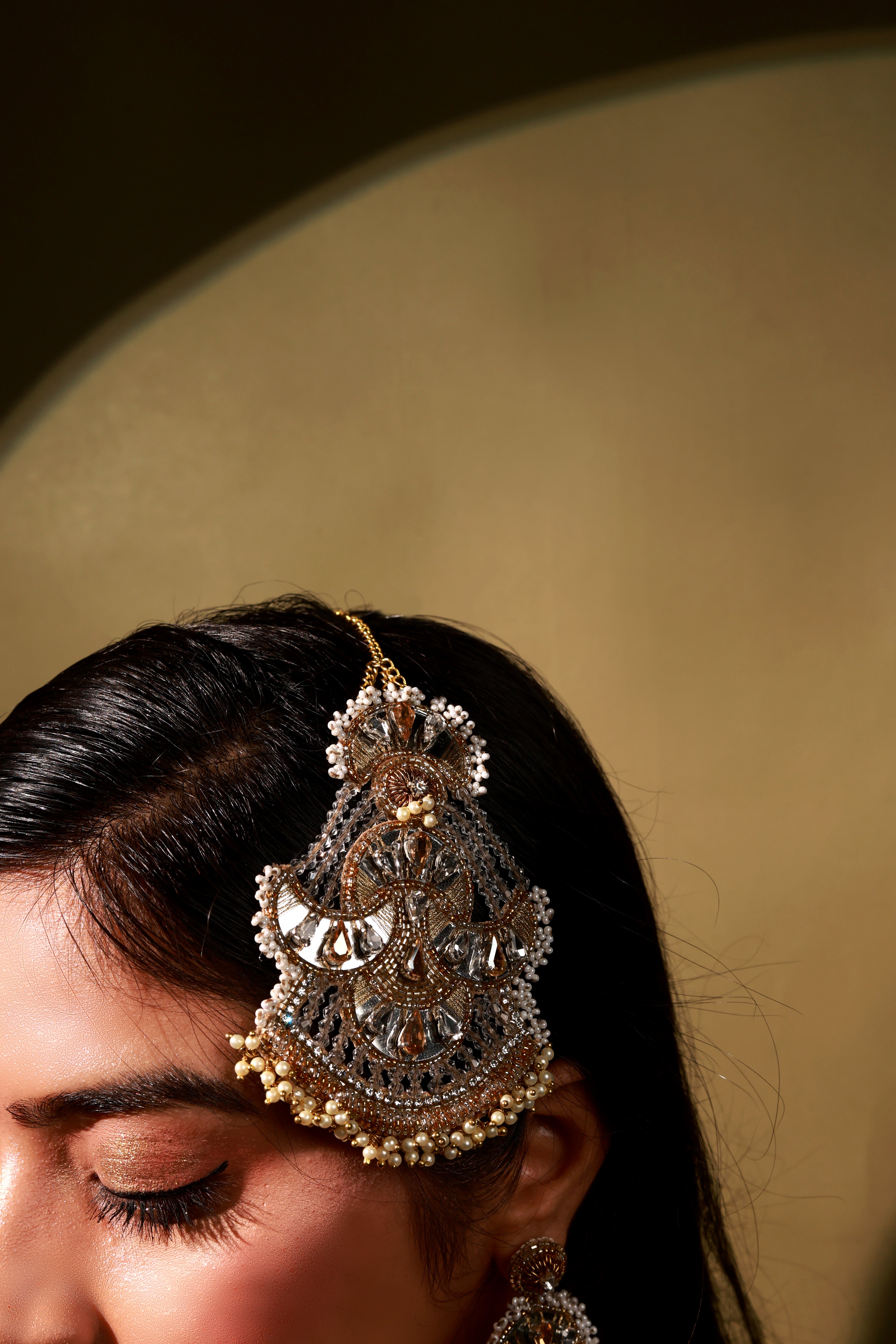 Guman side passa is a handcrafted masterpiece adorned with intricate mirror work, lustrous pearls, and zardozi embroidery in rich gold tones. Every detail is meticulously crafted to reflect royal elegance and artisanal charm.A unique statement piece for modern brides who wish to ditch the traditional maang tikka and embrace something close to heritage jewelery piece . Can be styled with lehngas, farshi salwar or anarkalis.