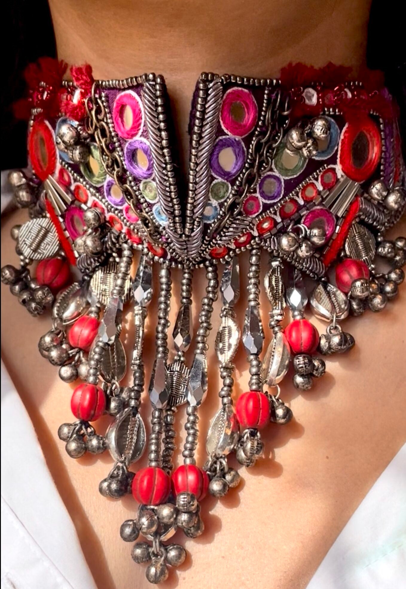 Guroor neckpiece is Handcrafted assymetrical shaped neckpiece crafted with multicoloured mirrors in all sizes, metallic embellishments and shells ghungroos are attached with red details which goes perfect with all festive celebrations.