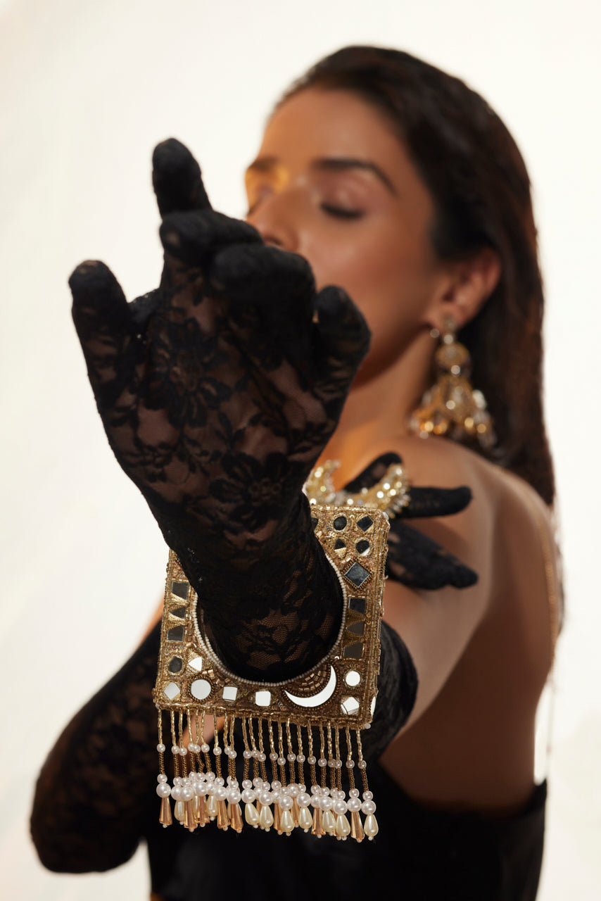 Iqayra bangle is Asymmetrical Handcrafted Bangle which is all ones embellished with mirrors and gold sequences glass beads to finish the look. Pearl hanging and lustrous crystals are attached at the bottom.