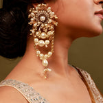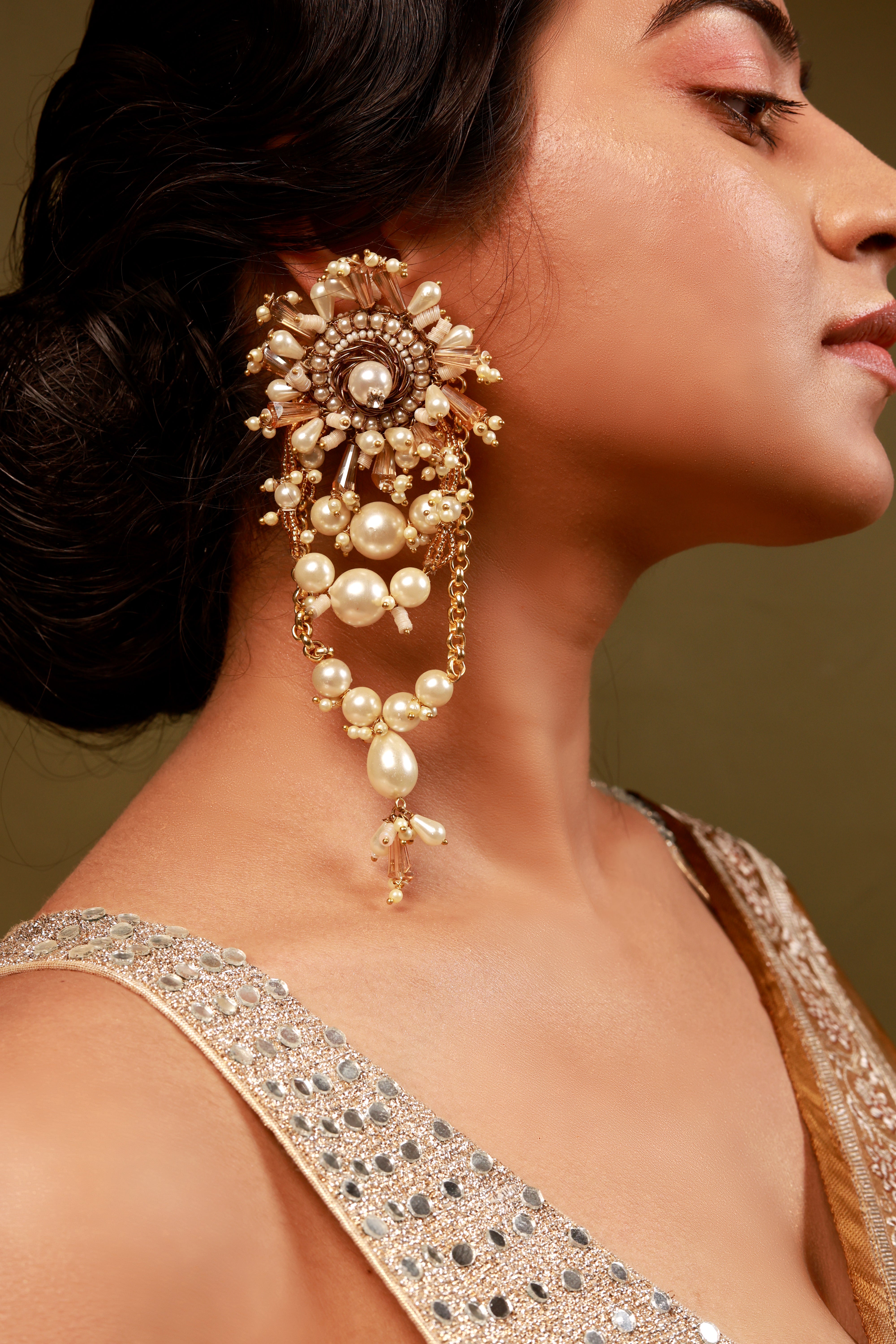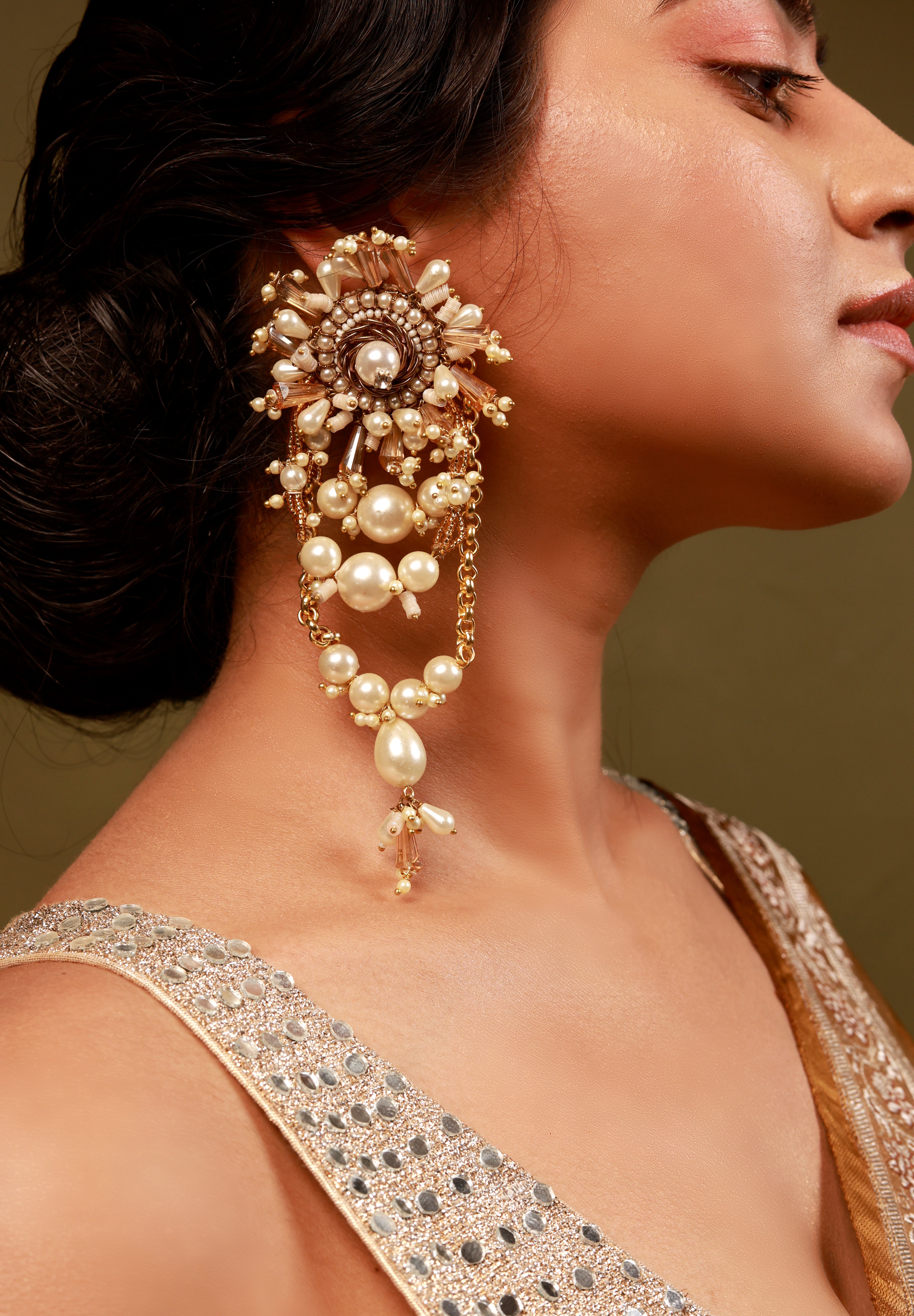 Irani is stud style danglers are handcrafted pearl embellished danglers with crystals and brass embellishments in gold , perfect pick for this wedding season.