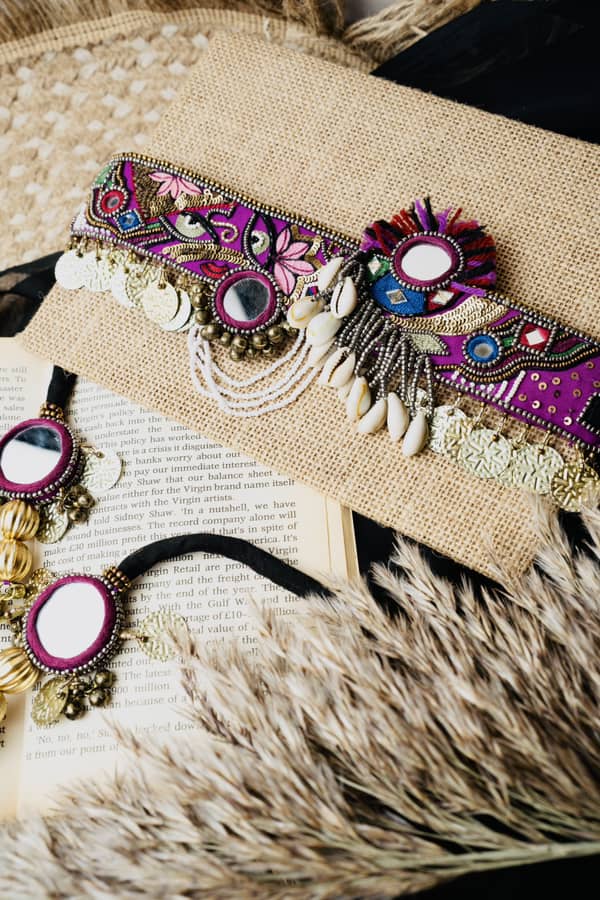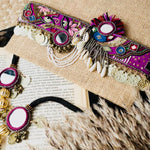 Ishana purple choker is handcrafted with colourful bohemian motifs of eye and lotus with cowrie shell details in hangings at one side which is very different type of neckpiece with mirrors , ghungroos and zari details of gold which looks different and unique – looking for Haldi or mehndi jewellery this choker will add that statement to any festive or wedding look.