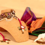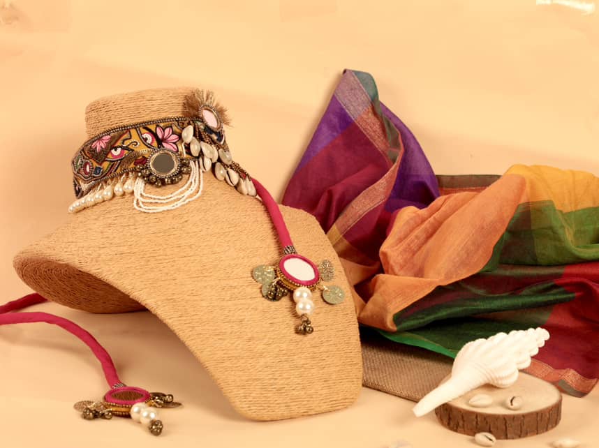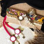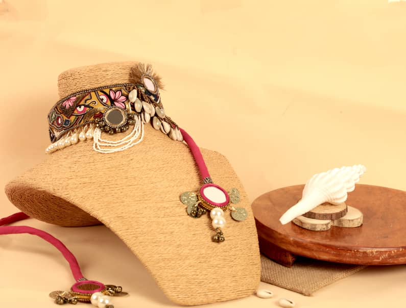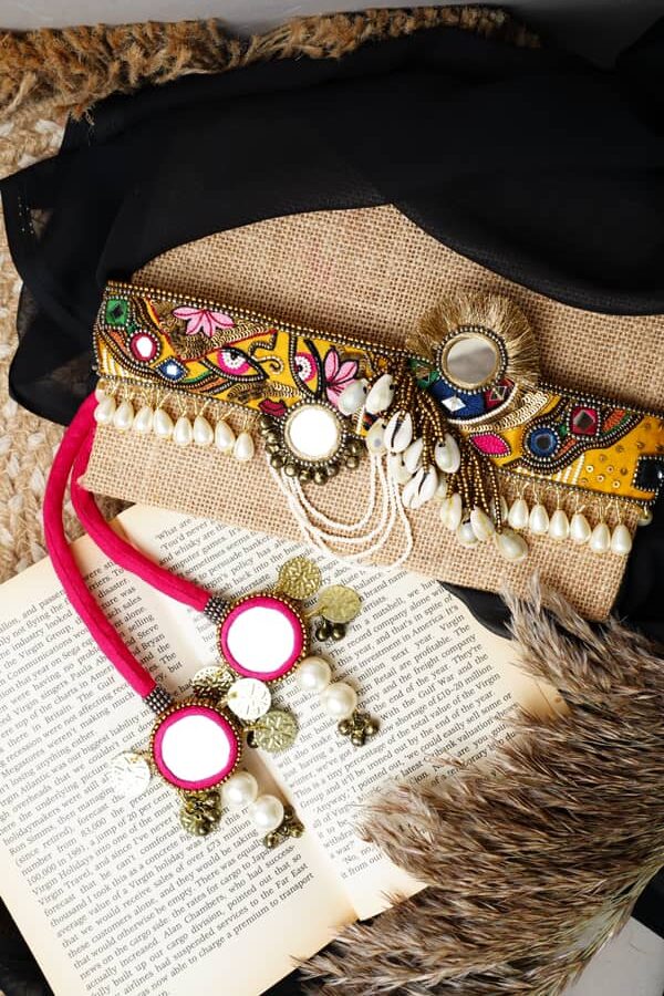 Ishana yellow choker is handcrafted with colourful bohemian motifs of eye and lotus with cowrie shell details in hangings at one side which is very different type of neckpiece with mirrors , ghungroos and zari details of gold which looks different and unique – looking for Haldi or mehndi jewellery this choker will add that statement to any festive or wedding look.