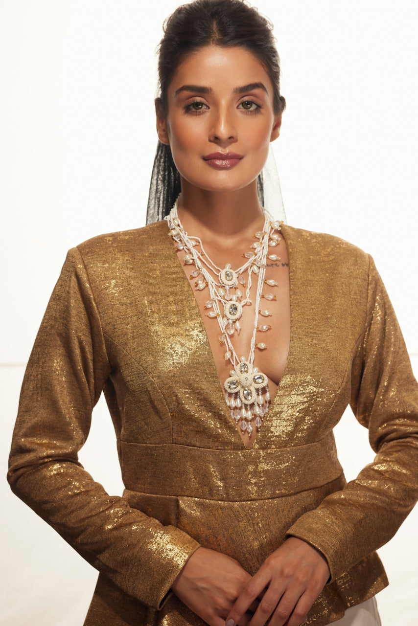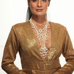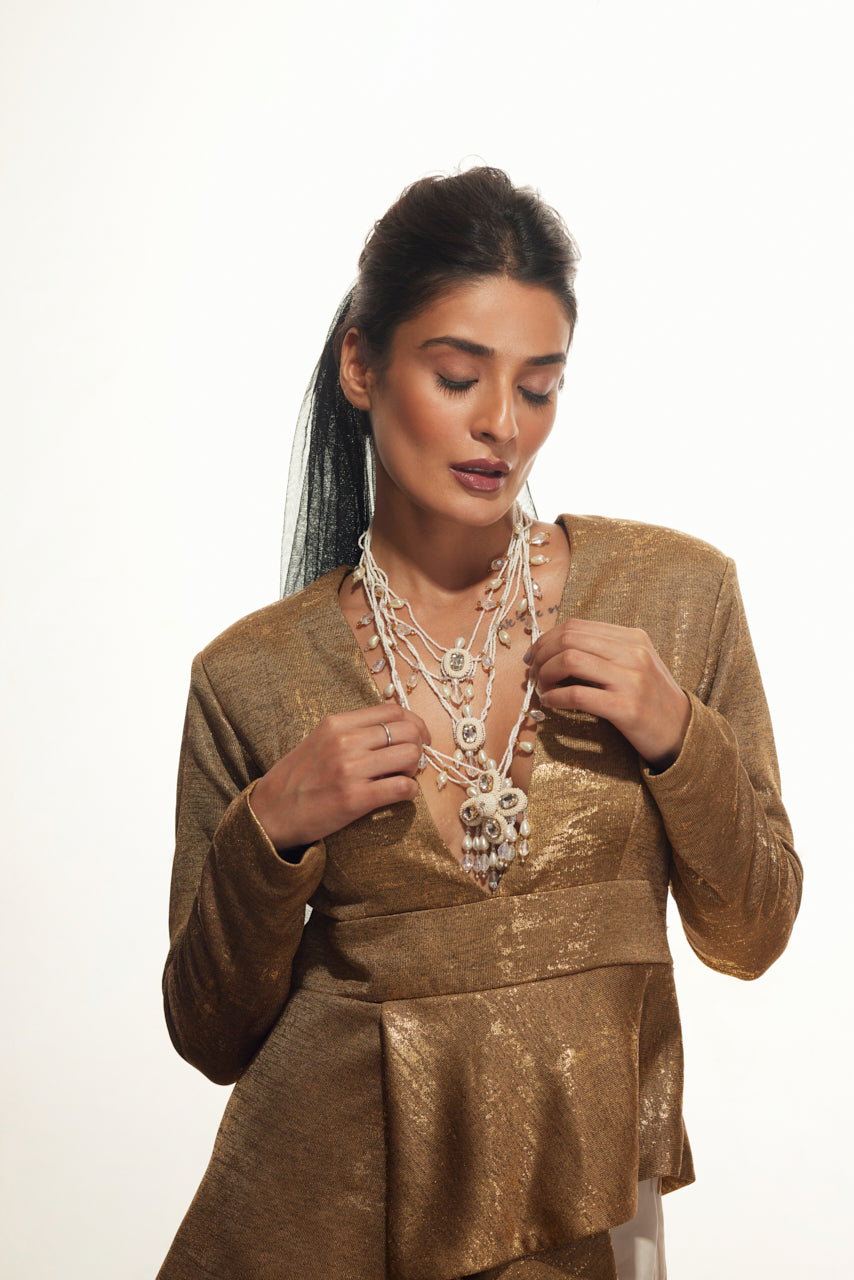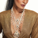 freshwater pearls with a combination of high-quality oval-shaped crystals coiled in3D Beading details and inspired from very known Satlada Haar, drop-shaped crystals and pearls are adding Richness to Ivory Necklace.