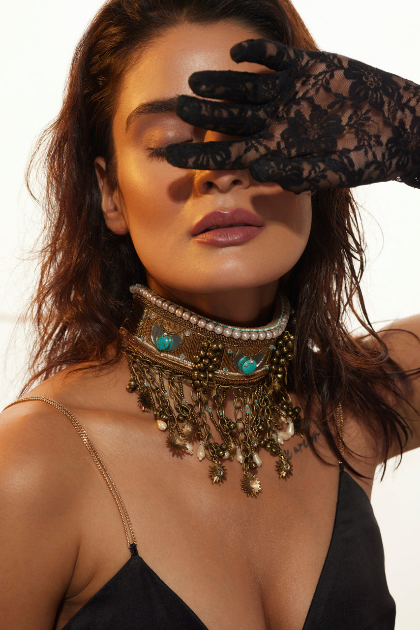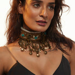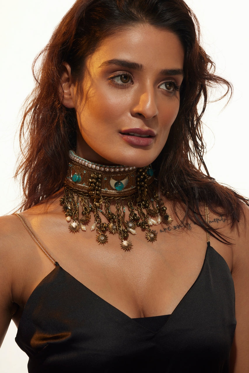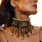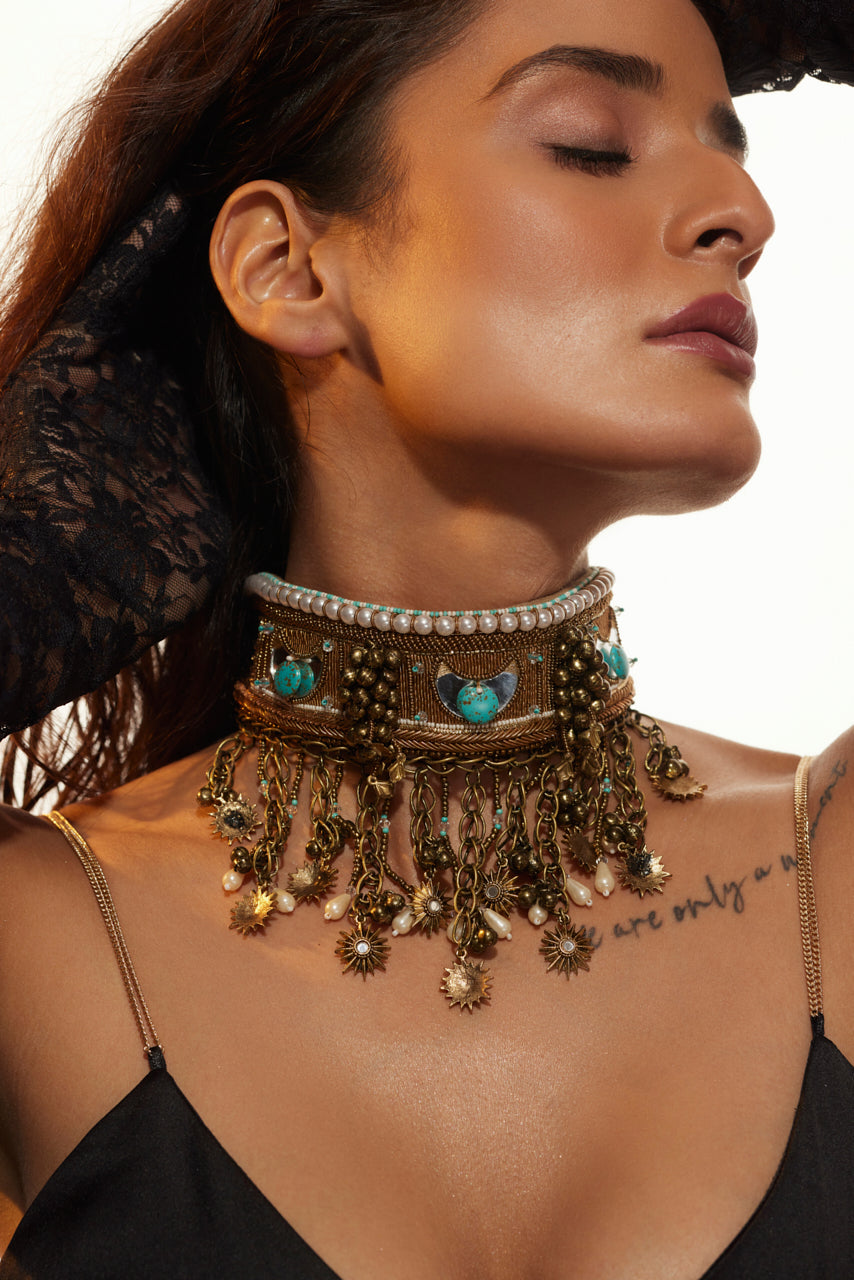 Jahan choker Antique gold represents richness with its handcrafted design , infused with mirror work ,Dabka and gold bead embroidery gives an majestic aura .Neckpiece is complimented with hand coiled brass chain and metal charms with fresh water pearl droplets to add the elegance.