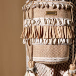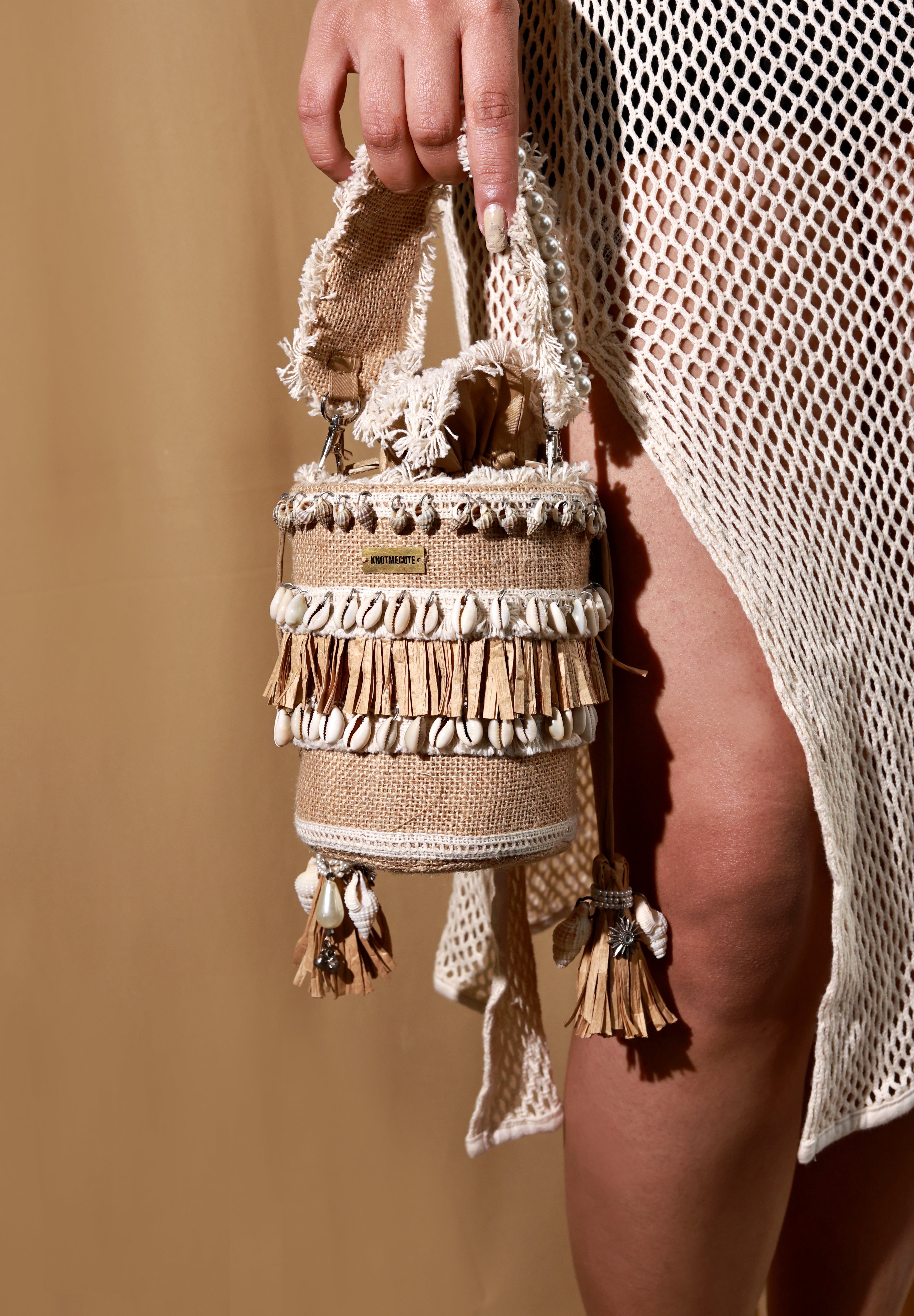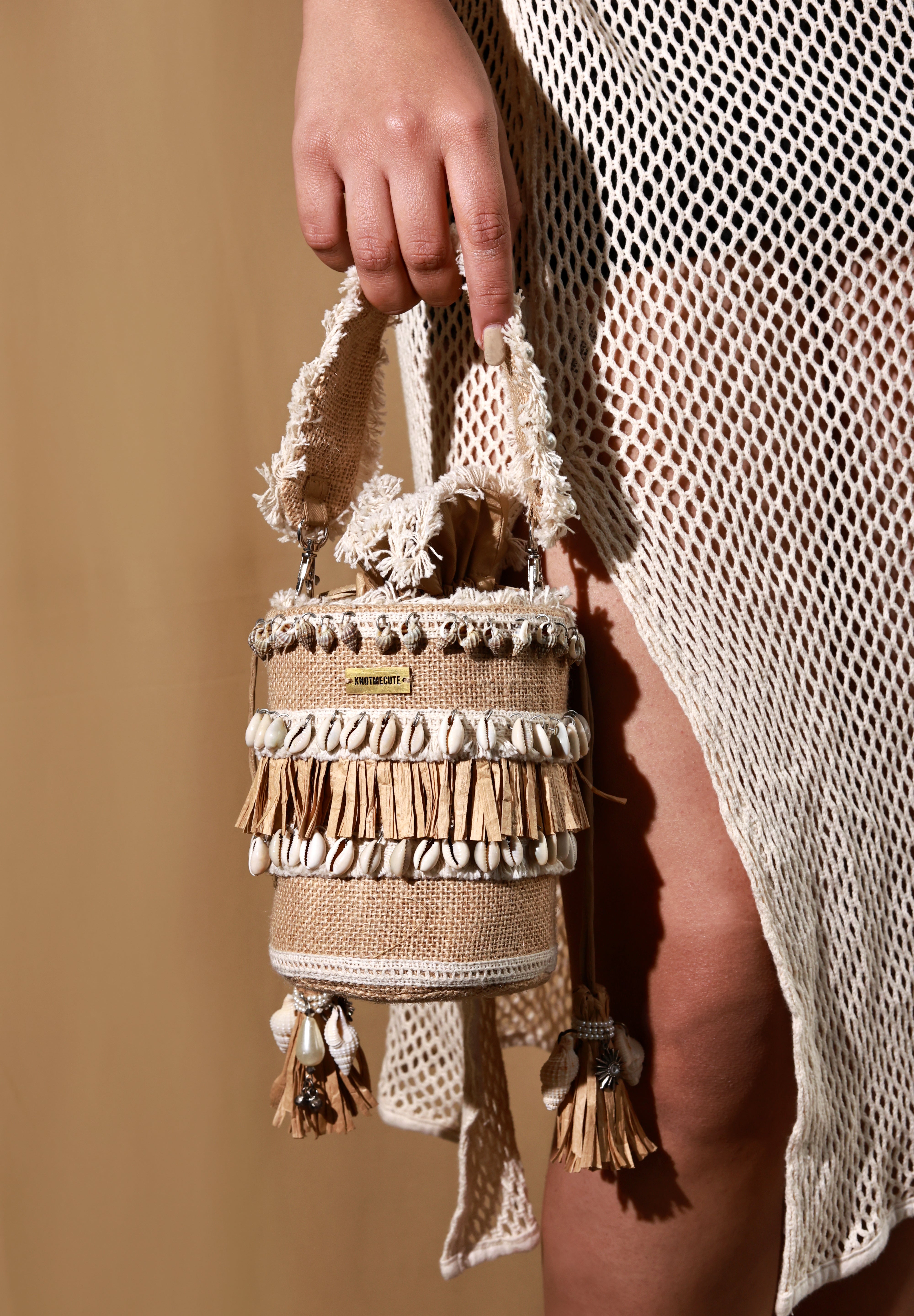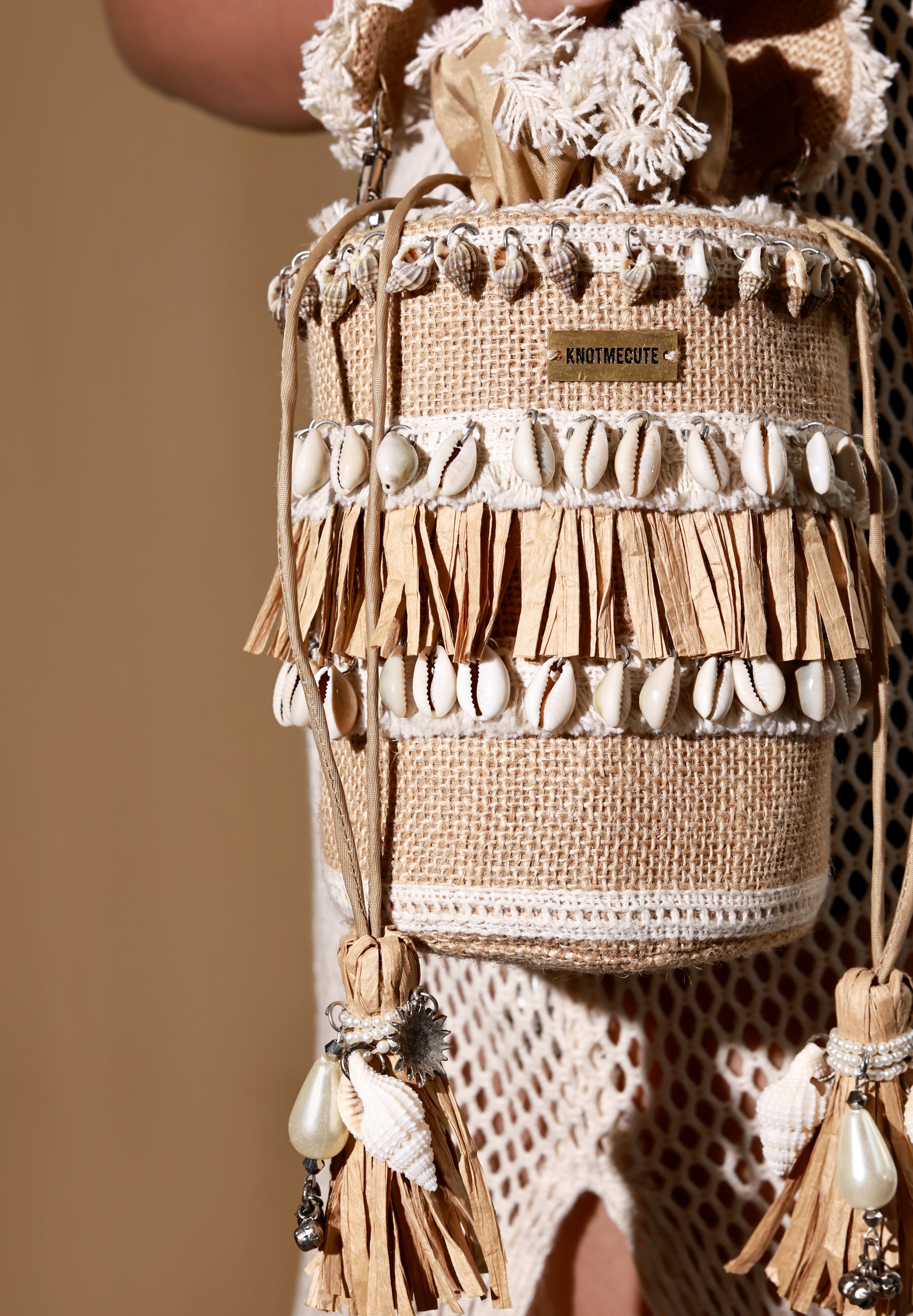 Featuring a summer essential a jute bag in stylish modern shape reformed to hold your essentials for next beach vacation!