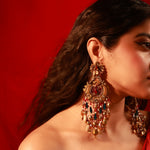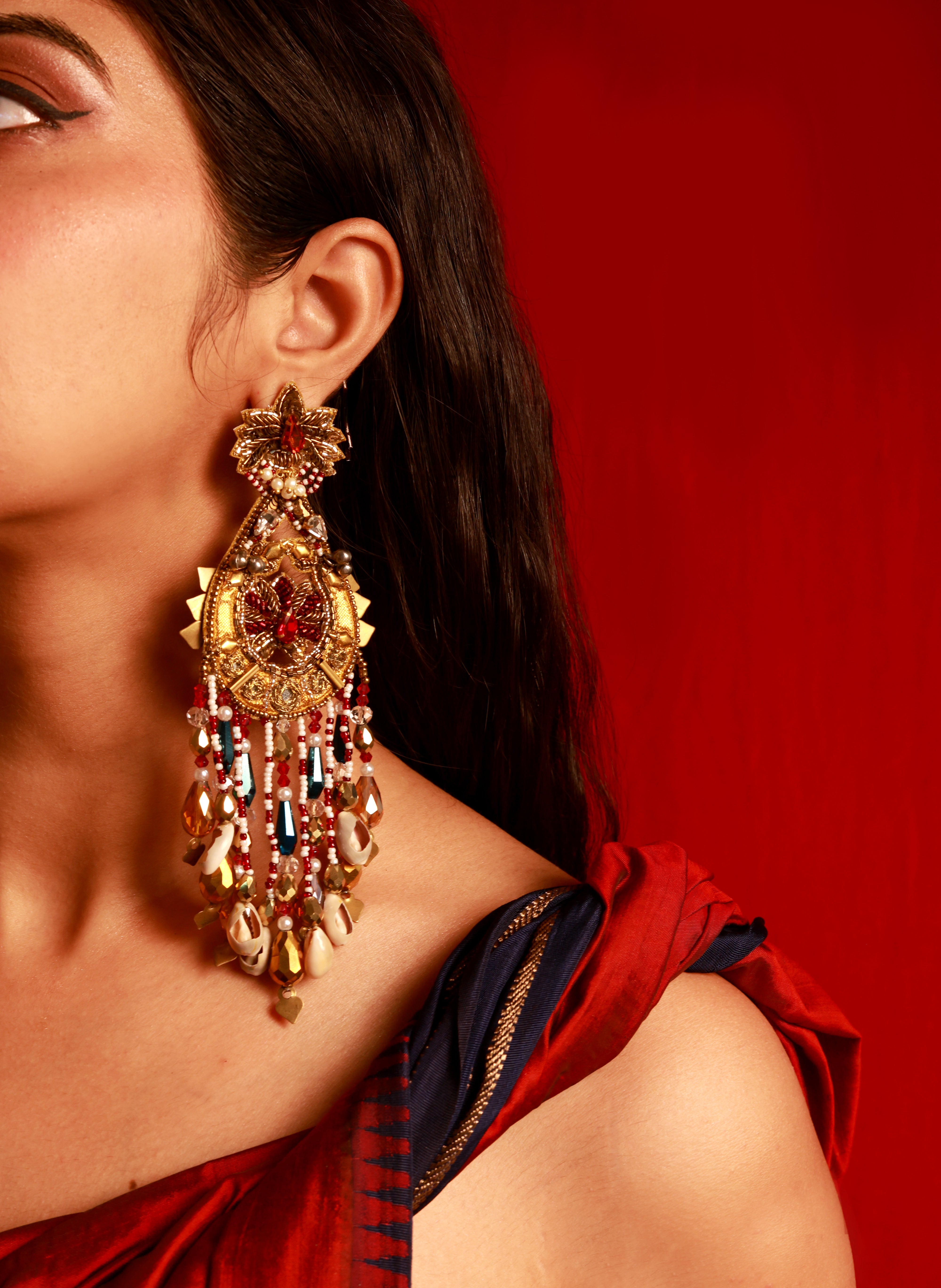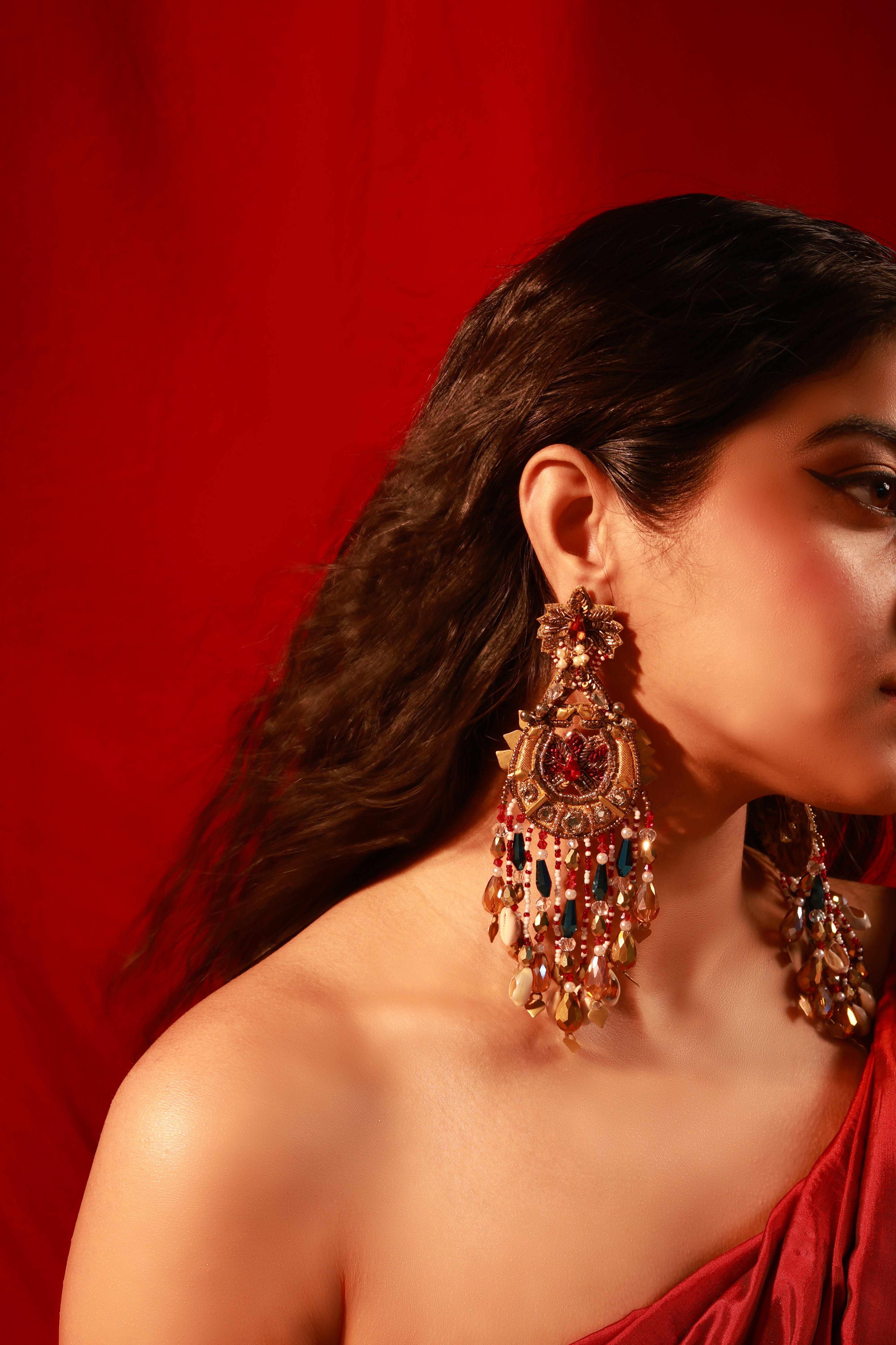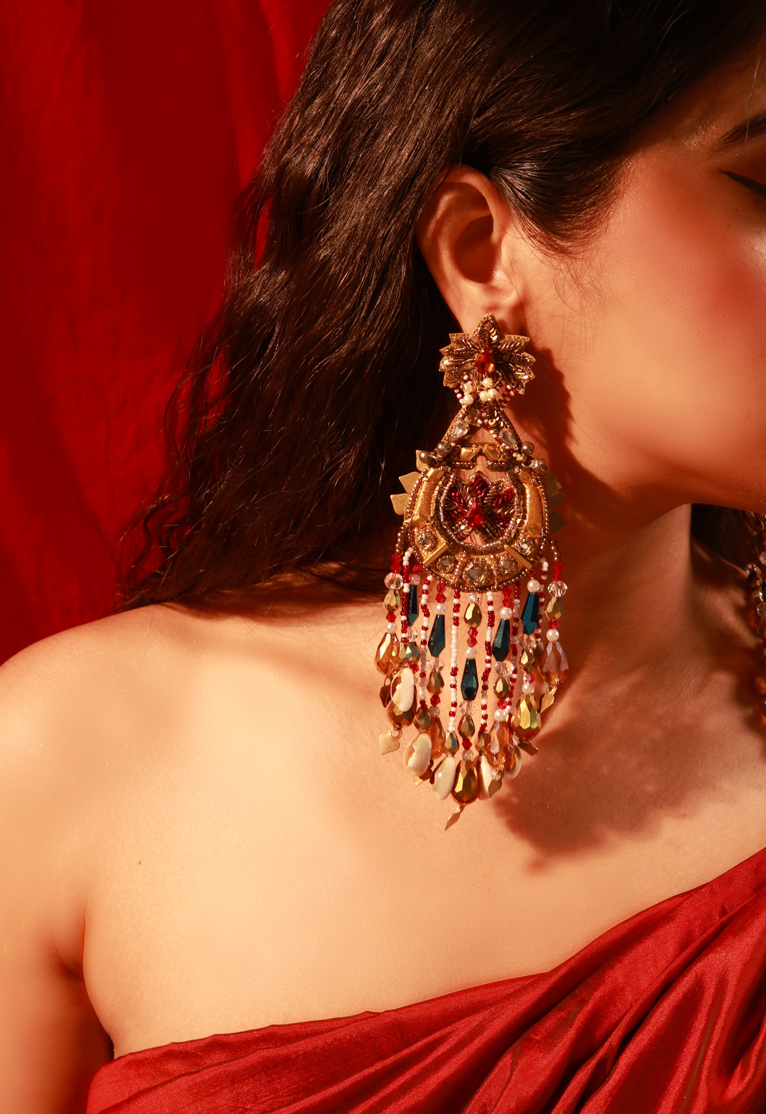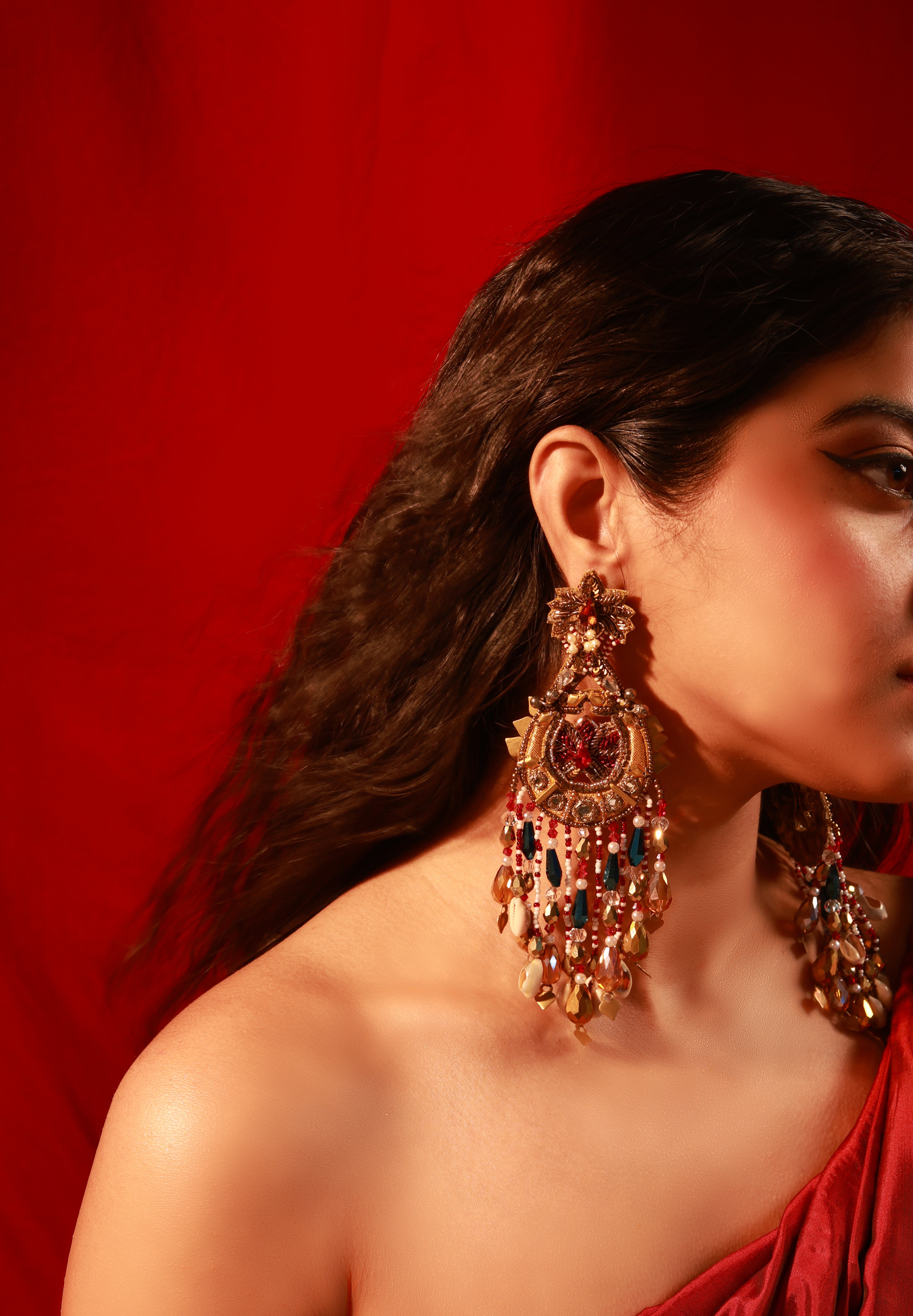 Vintage gold meets intricate antique embroidery, adorned with delicate metal charms and a striking red lotus at the center with mirror work on top with zardozi , The luxurious sparkle of crystals adds a dazzling touch, making this piece the perfect statement accessory to elevate any look this Diwali.”