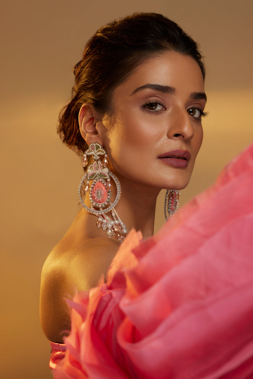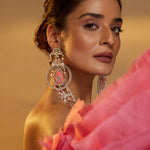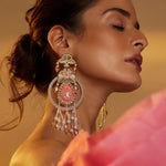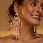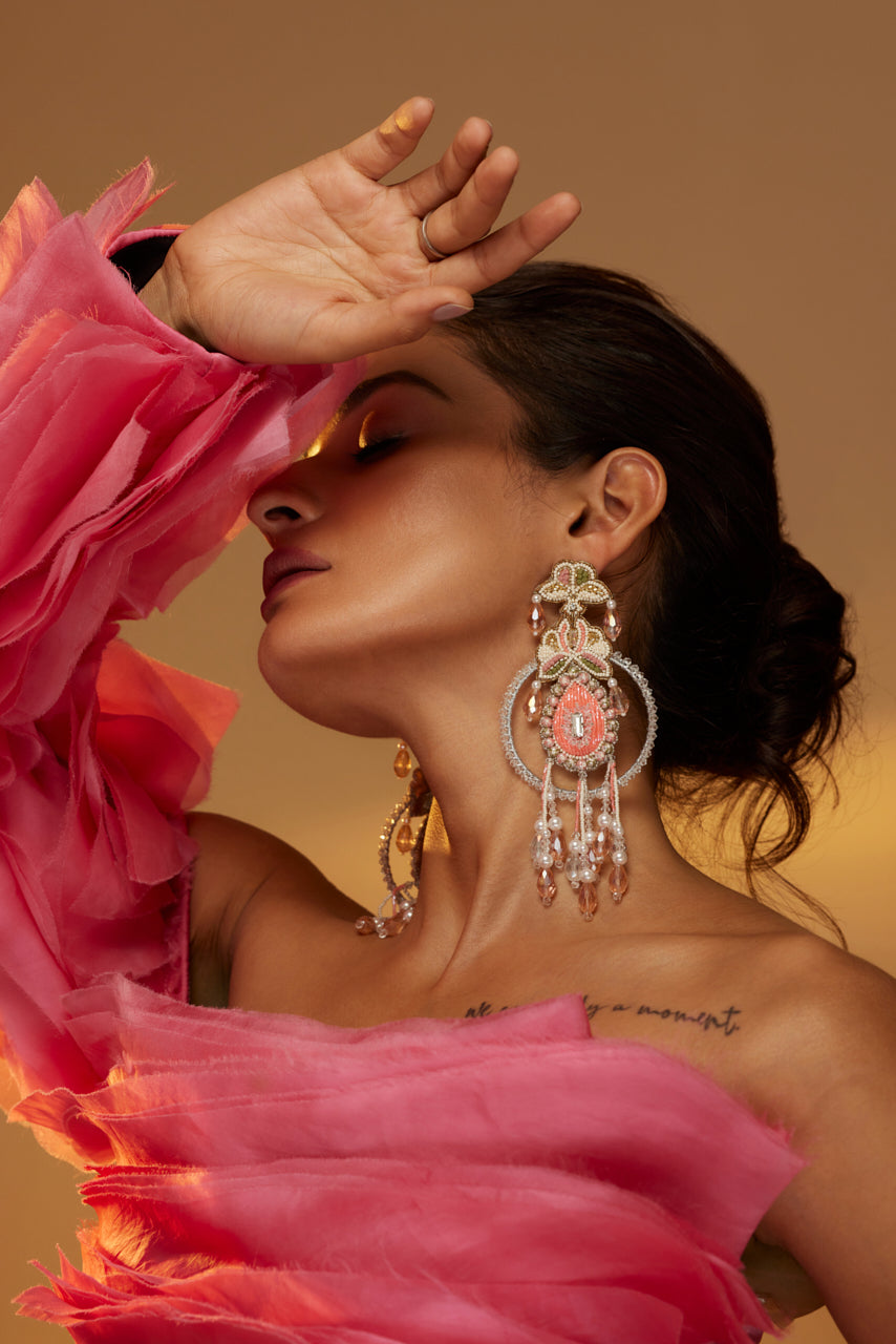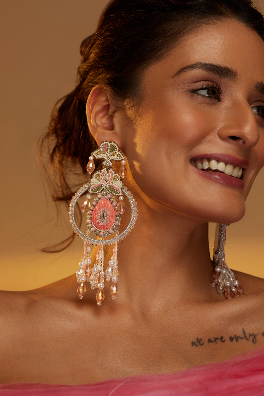 Laleh peach danglers is Persian motif handcrafted with intricate French knots and Persian motifs is a beautiful amalgamation of design aesthetic for a pair of earrings high grade lustrous crystals are featured with 3D glass cut bead detailing and a baguette crystal in the centre.