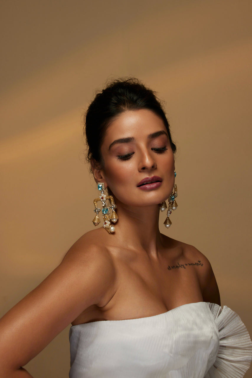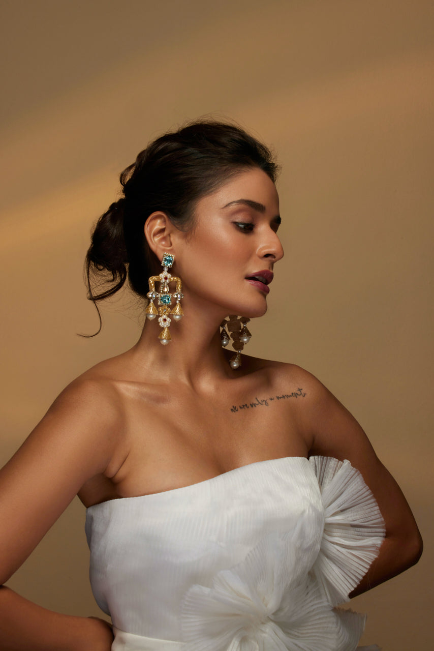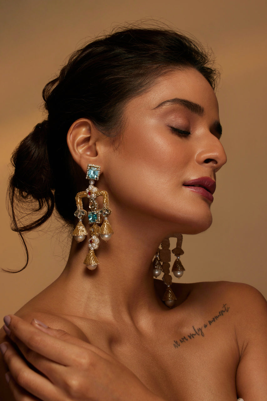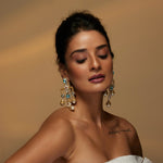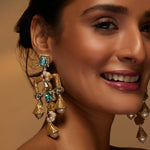 LUSTRE GOLDanglers are the pure form of luxury, intricate hand-embellished work with highly graded lustrous gold glass beads and square-coloured swarovski Stones are gracefully placed with pearl droplets at the bottom.