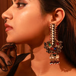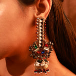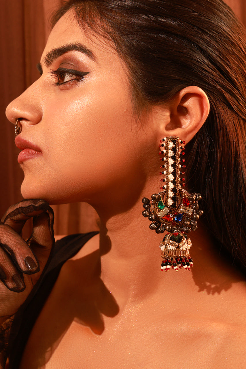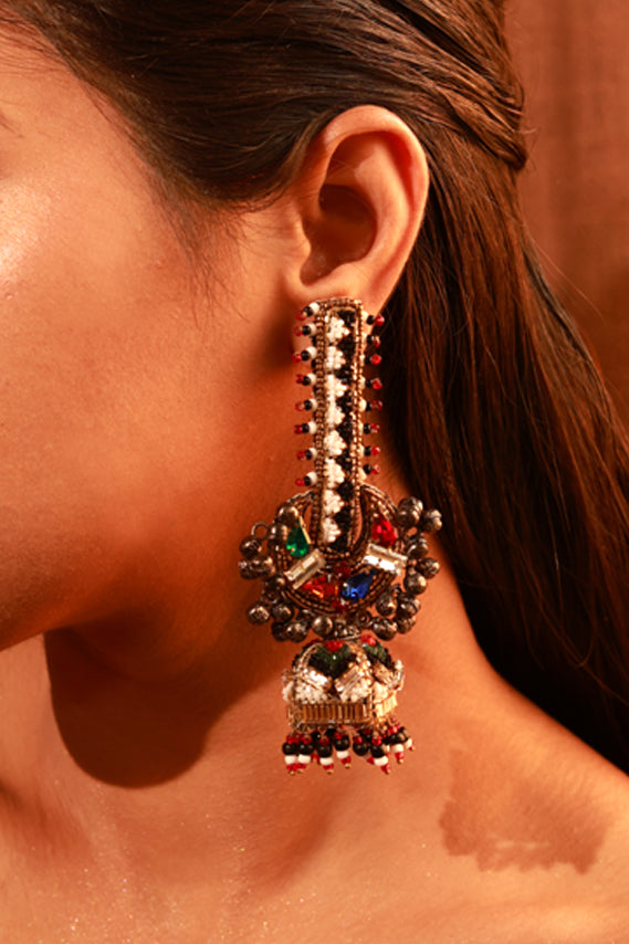 Rabia is handcrafted monochromatic statement jhumka very unique and versatile to style with Indian attire for weddings , lightweight with high quality crystals embellished on top .